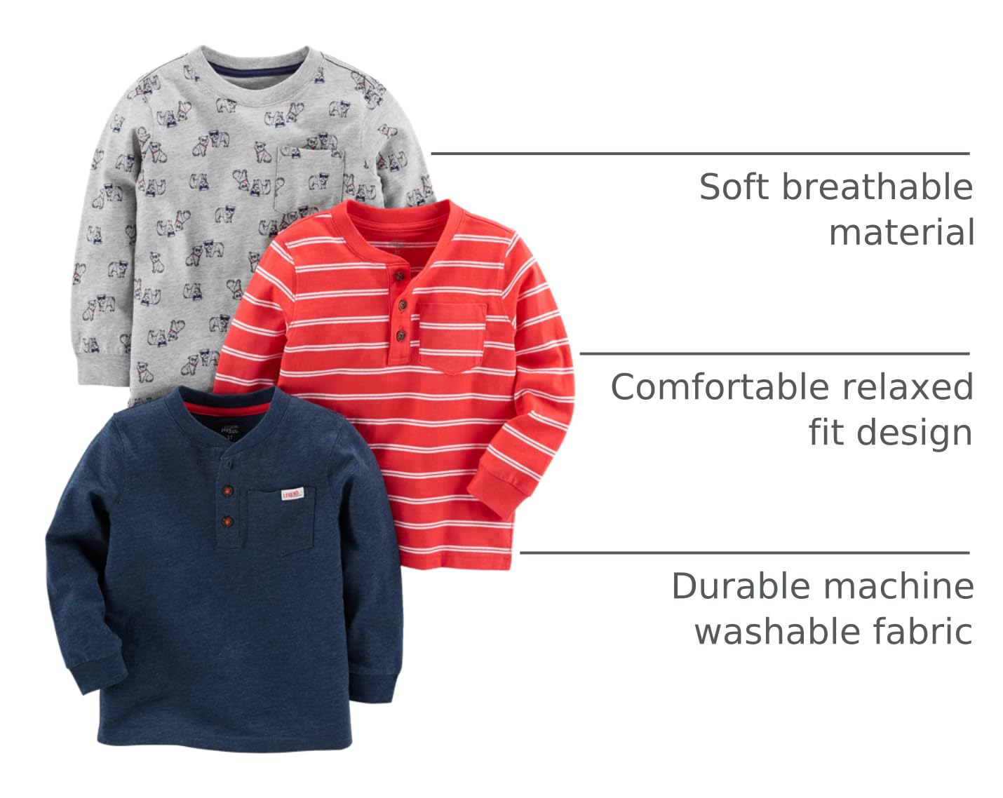 Description The Simple Joys by Carter's 3-Pack Long Sleeve Shirts for toddler and big kid boys offer a perfect combination of comfort, style, and practicality for everyday wear. Designed to keep up with active kids, these shirts come in a variety of fun prints and vibrant colors that make dressing easy and enjoyable. Whether you're getting ready for a day of play or layering up for cooler weather, these shirts are a versatile choice for any wardrobe. Each pack includes three long-sleeve shirts, each featuring a unique design—ranging from playful patterns to bold colors, offering a mix that suits any personality. These shirts are made from soft and breathable fabric, providing all-day comfort for your little one while allowing for easy movement during playtime or school activities. The shirts feature a classic fit, with long sleeves that provide warmth and coverage. The simple, pullover design makes them easy to get on and off, while the tagless construction ensures there’s no itching or irritation at the neck.
