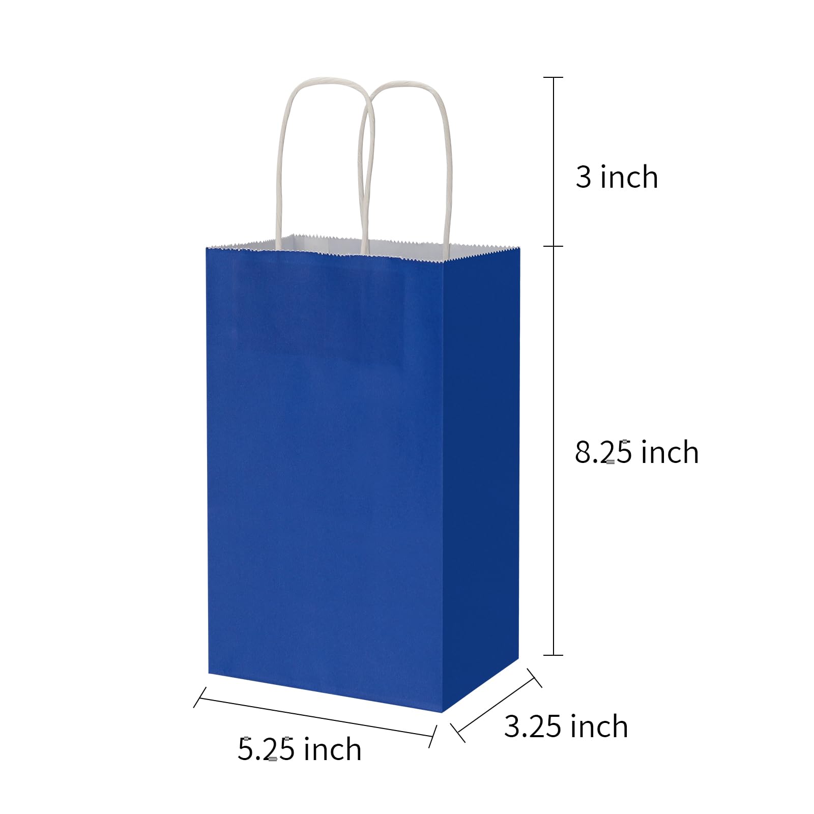 Gift Bags Size: 50 pack kraft paper gift bags, these paper bag size are 5.25 inches length, 3.25 inches wide, 8.25 inches high kraft paper bag with 3.5 inches handles.