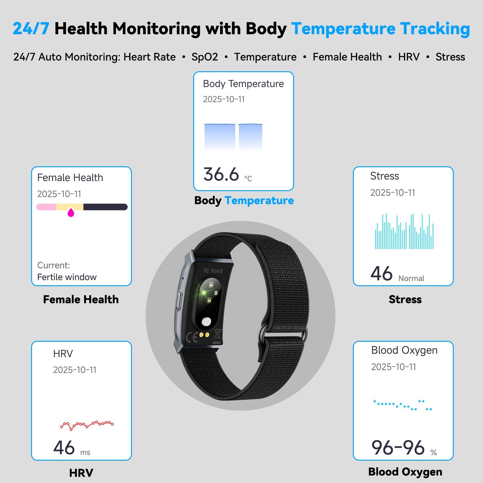【24/7 Health Monitoring with Body Temperature Tracking】 Experience comprehensive wellness tracking with the MUMUCREAM smart band. Featuring 24/7 body temperature monitoring, it provides valuable insights into your physiological state, aiding in ovulation prediction, post-workout recovery, and overall health assessment. Combined with continuous heart rate tracking, blood oxygen (SpO2) monitoring, and HRV (Heart Rate Variability) analysis, it delivers a complete health overview. View detailed trends and comprehensive health reports directly on the free companion app.
