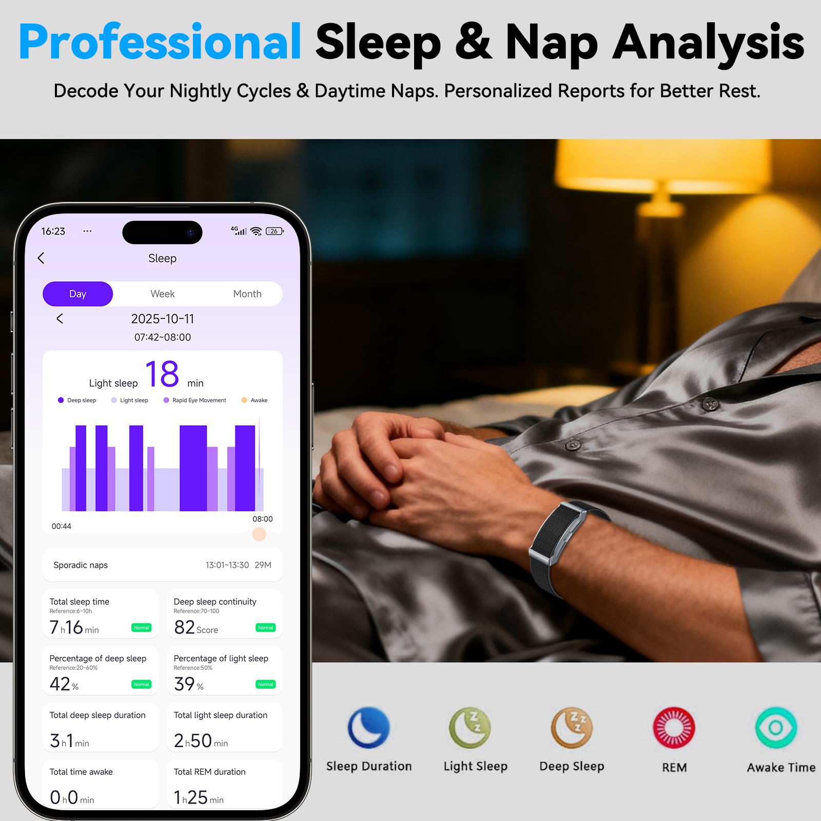 【Professional Sleep & Nap Analysis】 The MUMUCREAM health band utilizes an advanced sleep algorithm to provide in-depth analysis of your night-time sleep cycles, including light sleep, deep sleep, and REM sleep. It also supports nap tracking to give you a fuller picture of your daily rest. Understand your sleep quality with detailed sleep reports and make informed adjustments to wake up feeling refreshed and recovered.