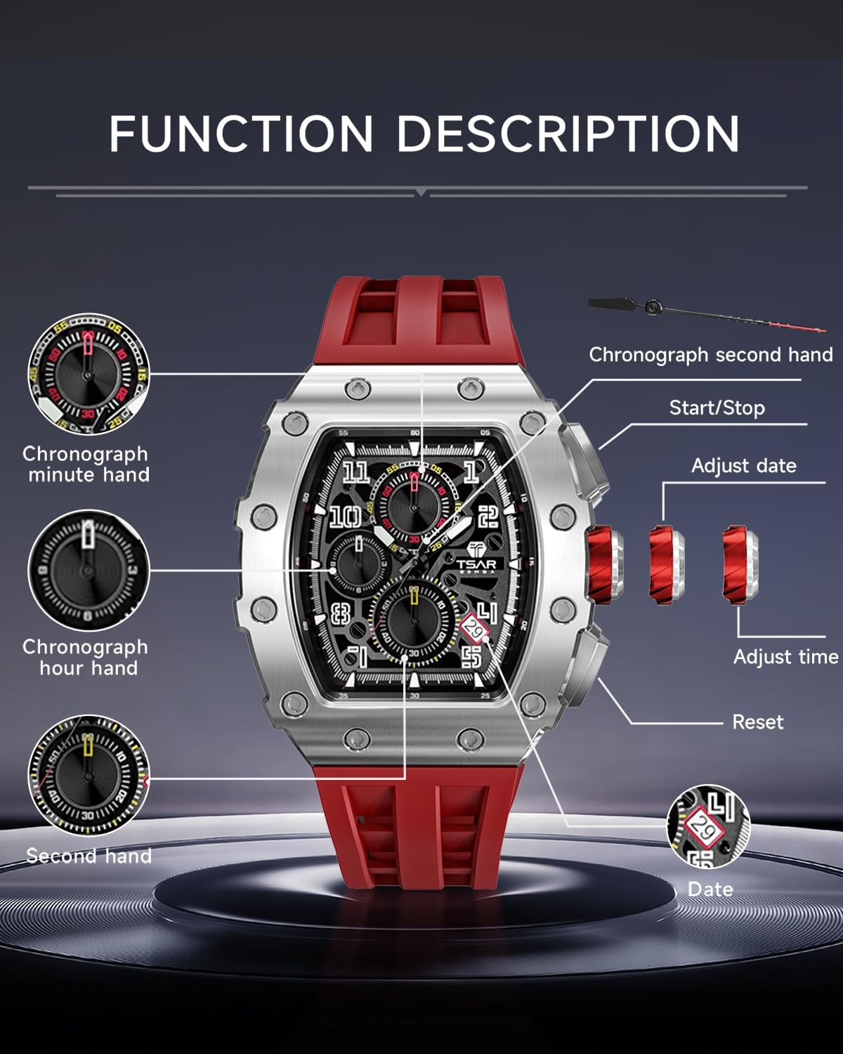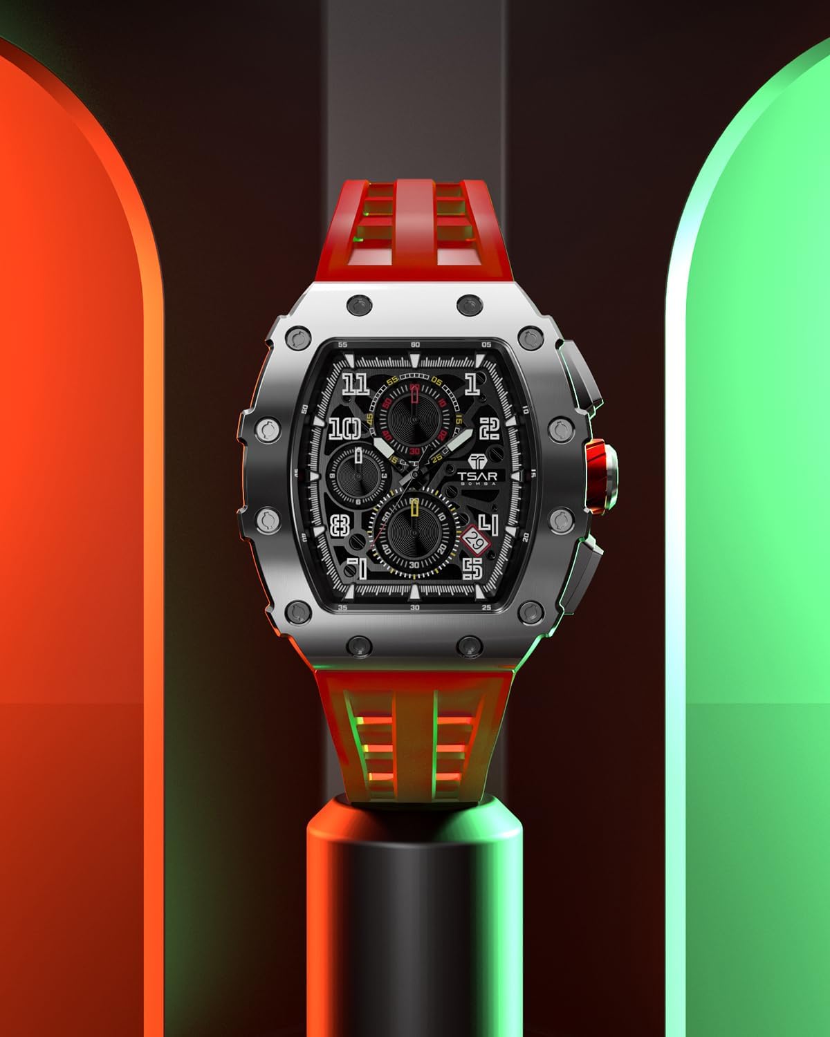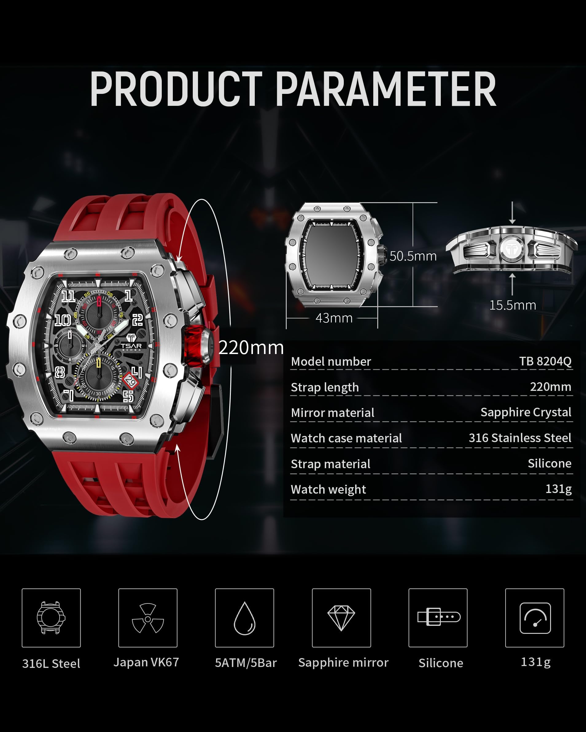 ERGONOMIC DOUBLE BRIDGE DESIGN:TSAR BOMBA watch was born in the Sino-German Force Lab. Based on mechanical mechanics, innovative materials, and precision manufacturing, it integrates oriental aesthetics and strives to make continuous breakthroughs in tech. Adopts an ergonomic double bridge design. Each case has undergone 202 processes to make the watch more fit the human wrist, greatly enhance the matching experience.A visual feast of simple luxury that brings out the best of men's style.