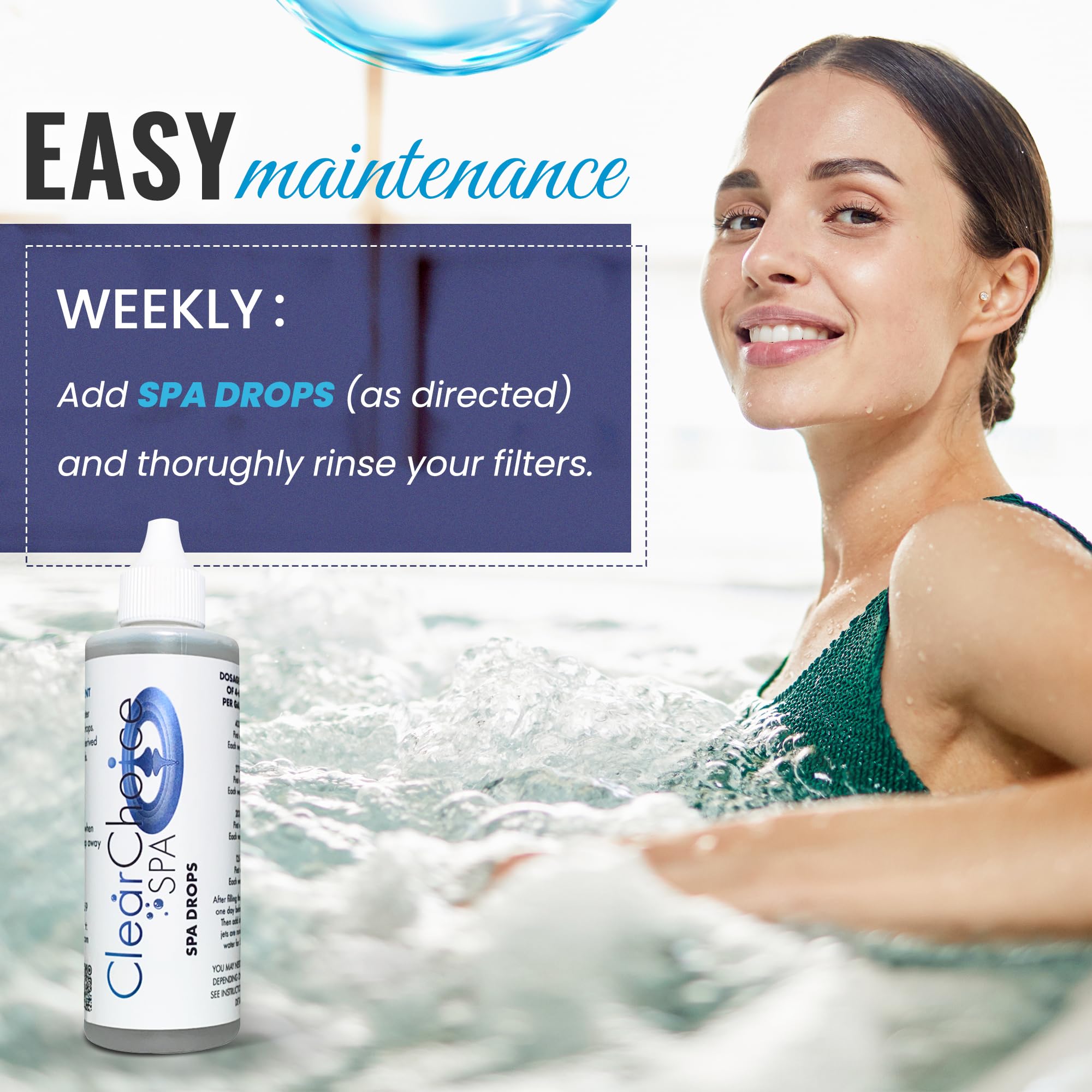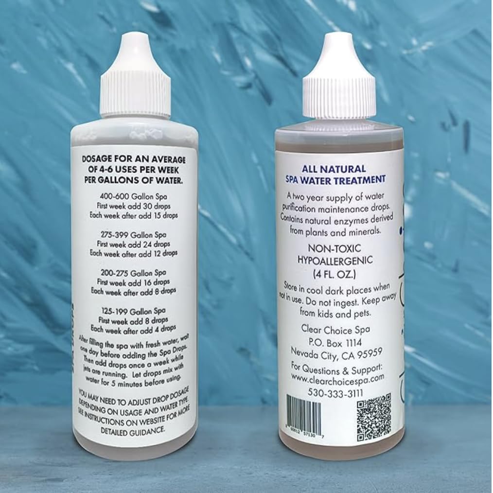 SINCE 1996 CLEAR CHOICE SPA HAS OFFERED A REVOLUTIONARY APPROACH TO HOT TUB MAINTEANCE, combining natural enzymes and surfactants to create a powerful, chemical-free cleaning solution. This advanced formula effectively breaks down organic waste, oils, and other contaminants, ensuring your spa water remains clean, clear, and inviting through the process of Bio-Oxidation. Unlike traditional treatments that rely on harsh chemicals such as chlorine and bromine, Clear Choice Spa Drops are gentle on your skin, helping to prevent common irritations like skin dryness and itchiness. This hypoallergenic property makes the product an excellent choice for individuals with sensitive skin or those prone to allergic reactions, as it minimizes the risk of irritation or discomfort. Each 4oz bottle provides a full two-year supply of treatments, making it a cost-effective solution for spa owners. The eco-friendly and natural composition not only safeguards your health but also contributes to environmental sustainability by reducing the chemical load in wastewater. Maintenance with Clear Choice Spa Drops is straightforward: Weekly: Add the recommended amount of Spa Drops to your hot tub and rinse the filters thoroughly. Monthly: Deep clean the filters by soaking them overnight in a solution of 5 cups white distilled vinegar to 5 gallons of water, then rinse thoroughly before reinstalling. Water Changes: Recommended once a year. By following this simple routine, you can reduce the need for frequent water changes, saving time while extending the lifespan of your hot tub and enhancing your overall spa experience. Embrace a healthier, more natural approach to spa maintenance with