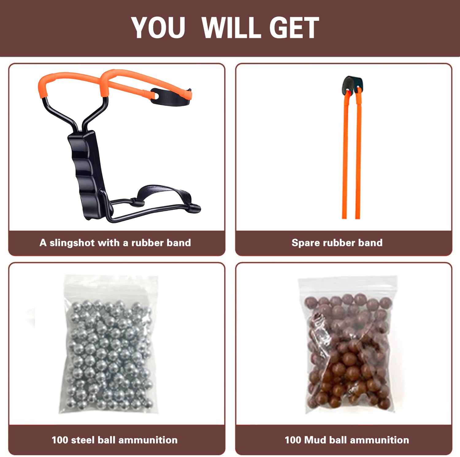 You will get:one hunting and shooting slingshot with rubber band, two packs of slingshot ammo, and a spare slingshot band. All in all, if you want a slingshot that performs well and gives a ton of fun, take this slingshot home
