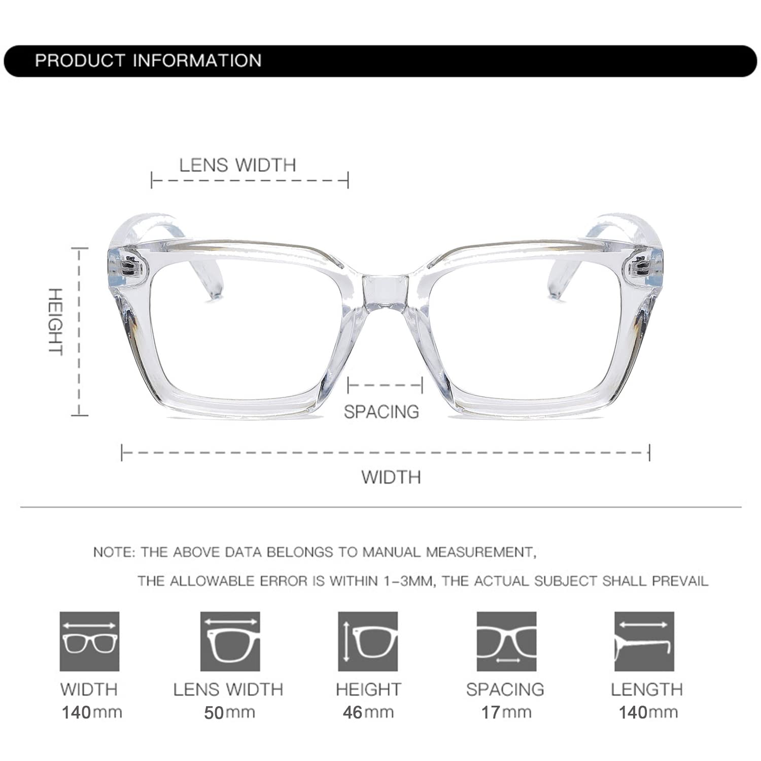 PRODUCT DIMENSION: Lens Width: 50mm(1.97inches), Lens Height: 36mm(1.42inches), Temple Length: 142mm(5.59inches), Nose Bridge: 17mm(0.67inches).