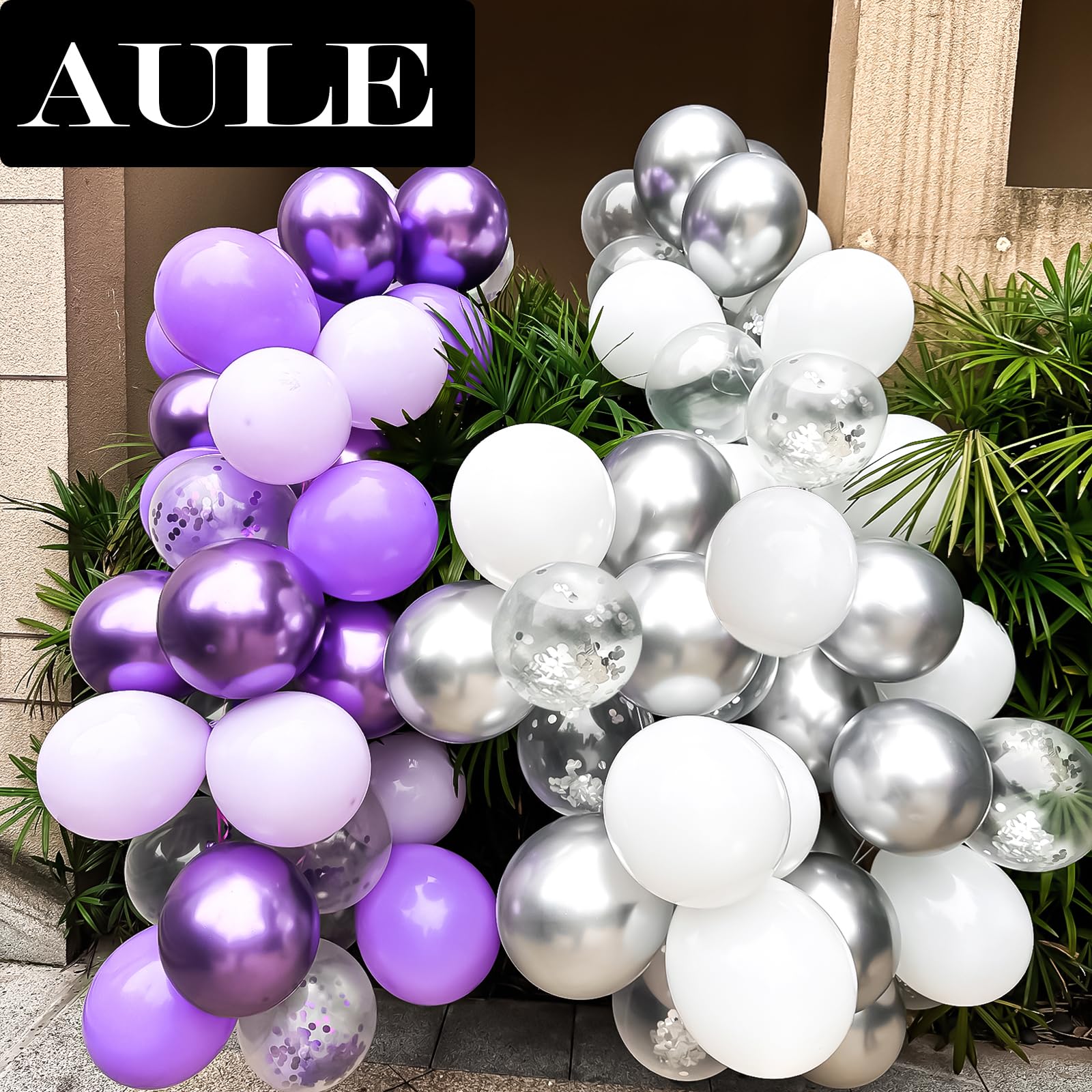 PACKAGE CONTENTS: 15 Pieces 12 Inch metallic purple balloons, 15 Pieces 12 Inch lavender balloons, 15 Pieces 12 Inch light purple balloons, 15 Pieces 12 Inch purple confetti balloons, 3 Pieces purple ribbons.
