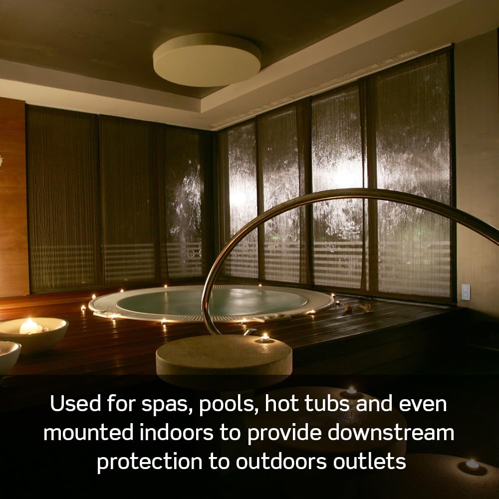 A blank face GFCI provides protection with a clean appearance when an outlet is not needed such as behind a hot tub or spa.