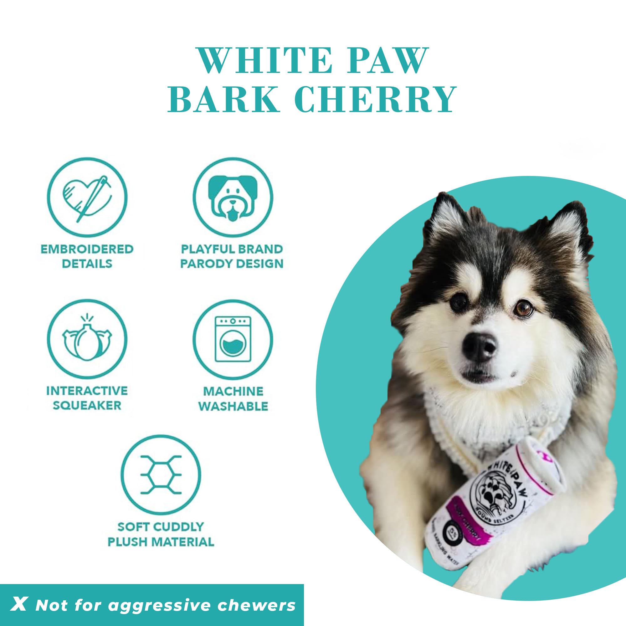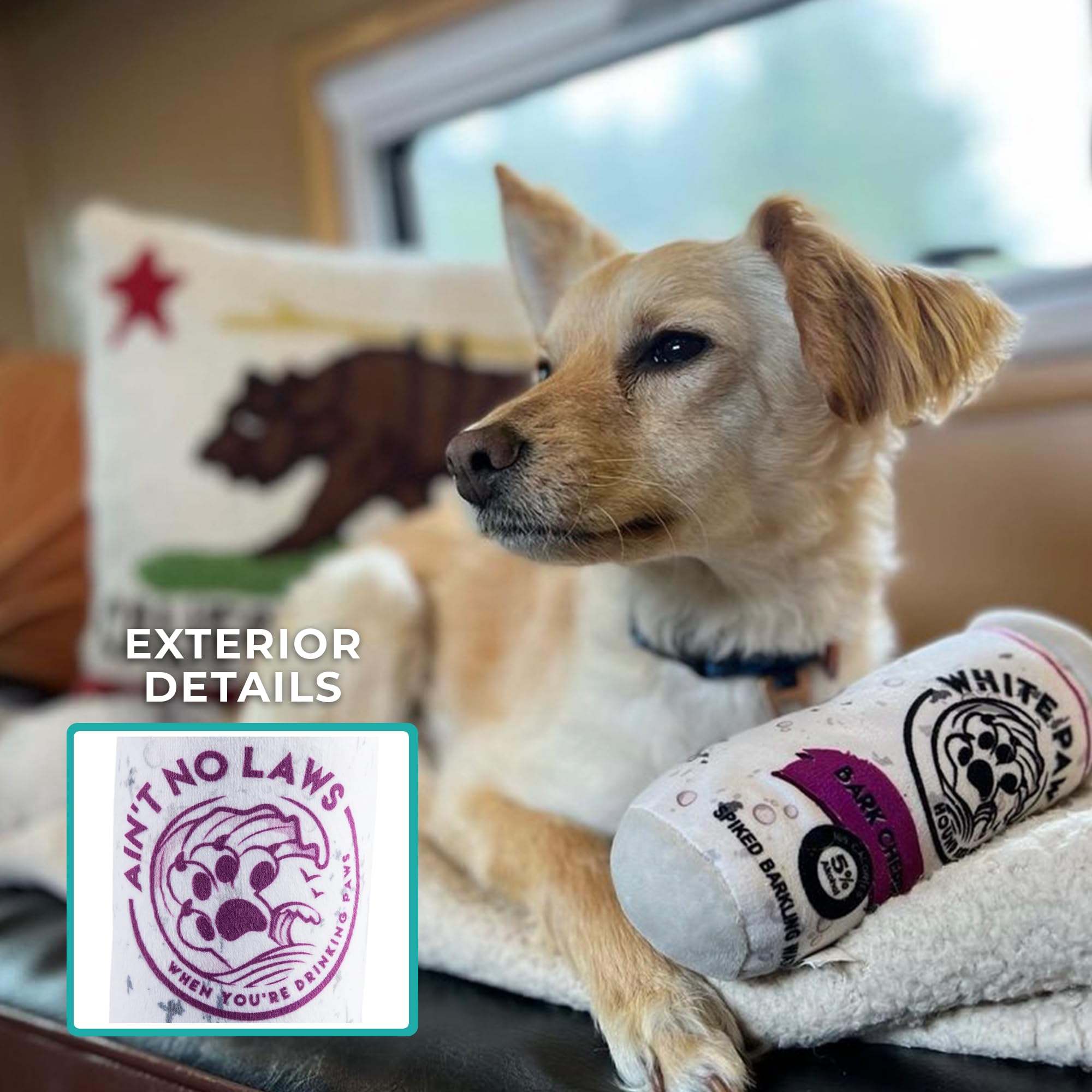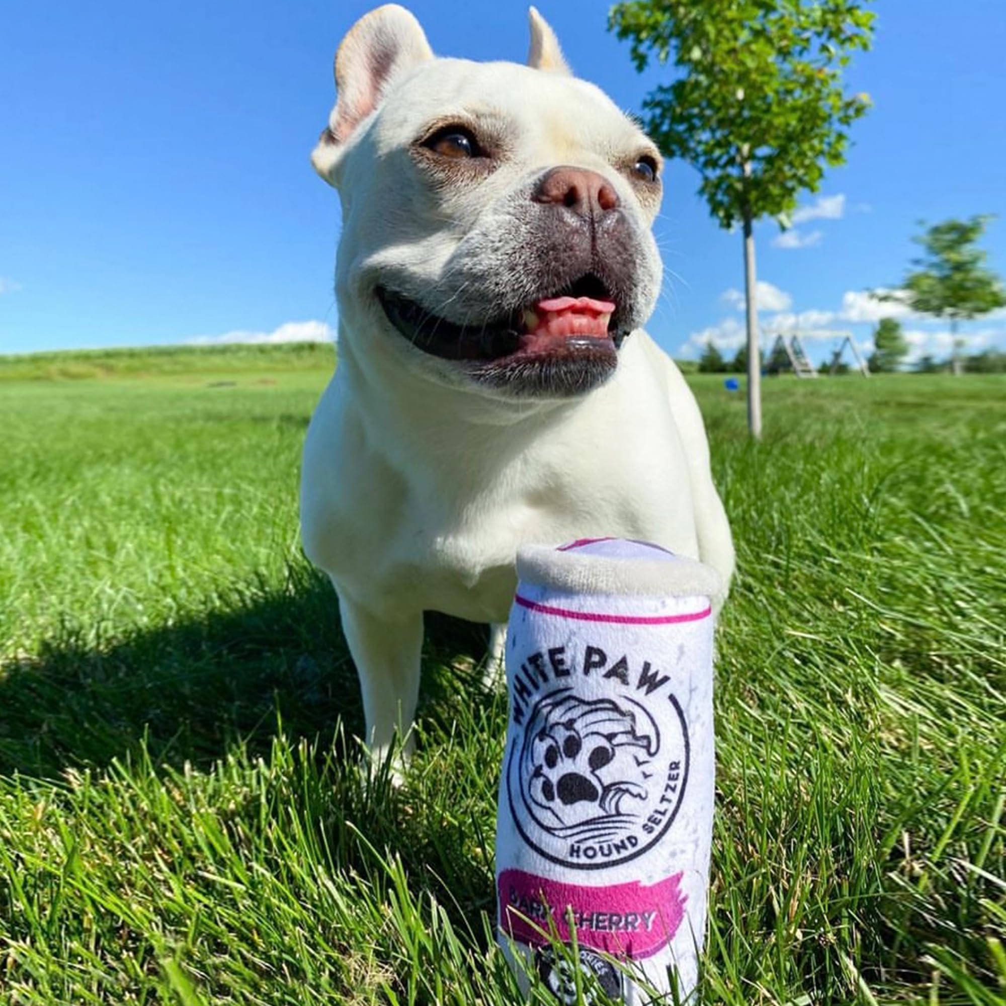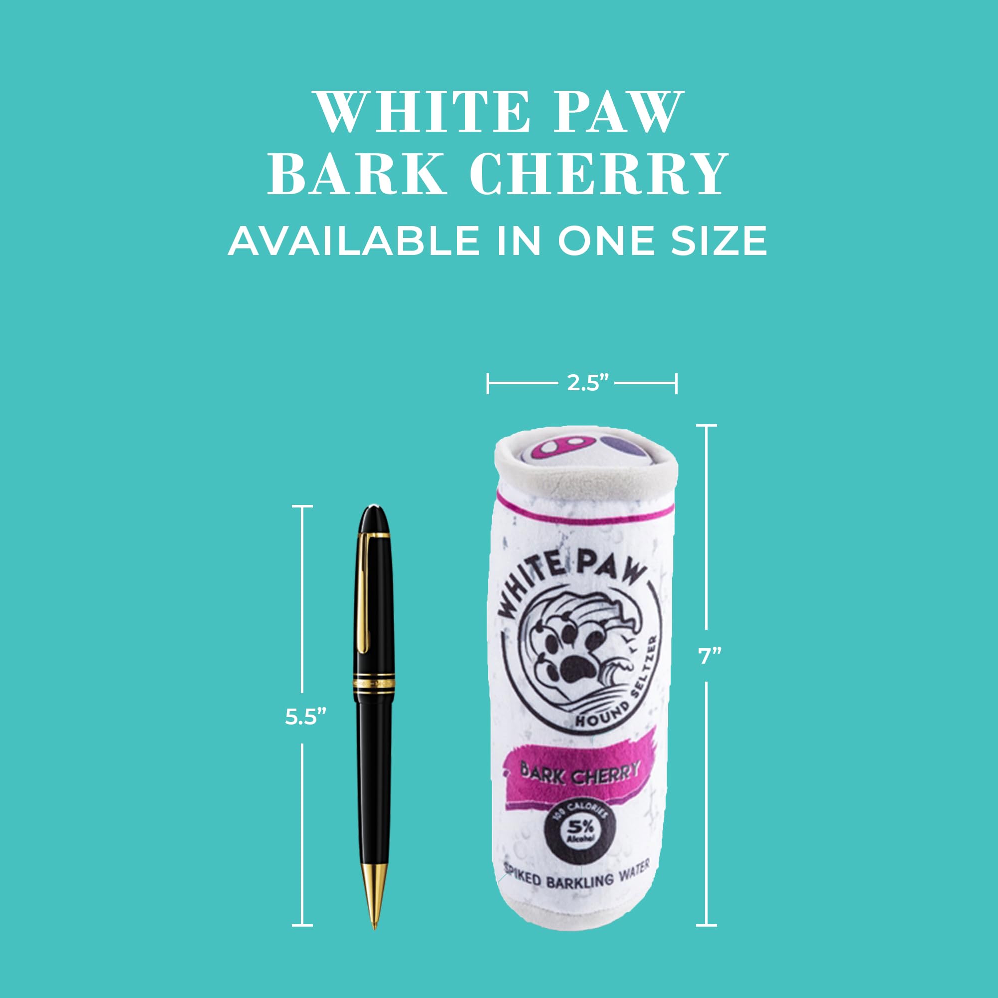 Funny Parody Plush Dog Toy: Give your furry friend a fizzy refreshment by cracking open our White Paw Bark Cherry dog toy. This dog toy features a white and magenta plush exterior with a built-in squeaker hidden inside. Back details read “Ain’t No Laws When You’re Drinking Paws”. It’s a fun, cute interactive dog toy that turns every playtime into happy hour! One Size 7"x4.5"x2.5".