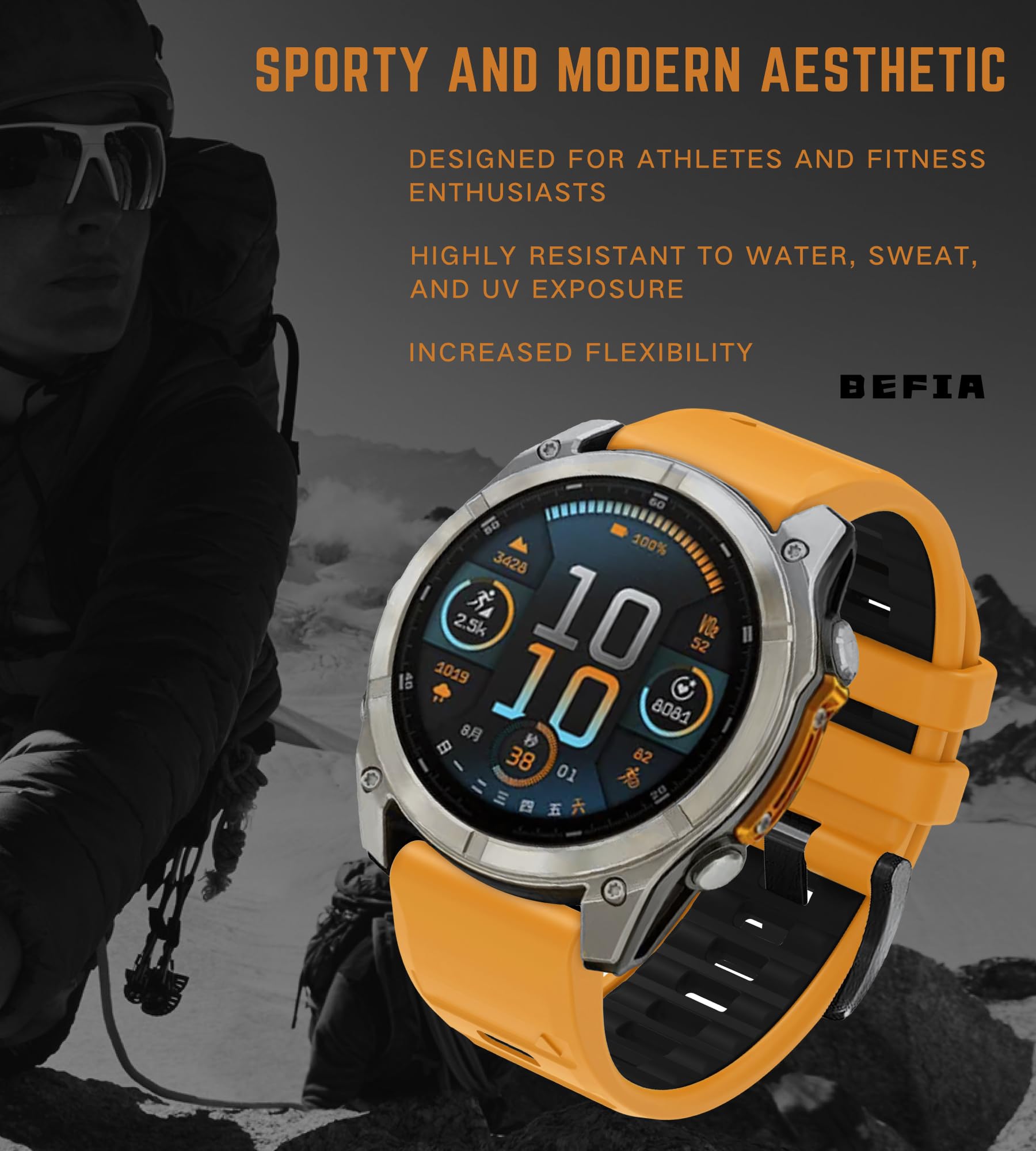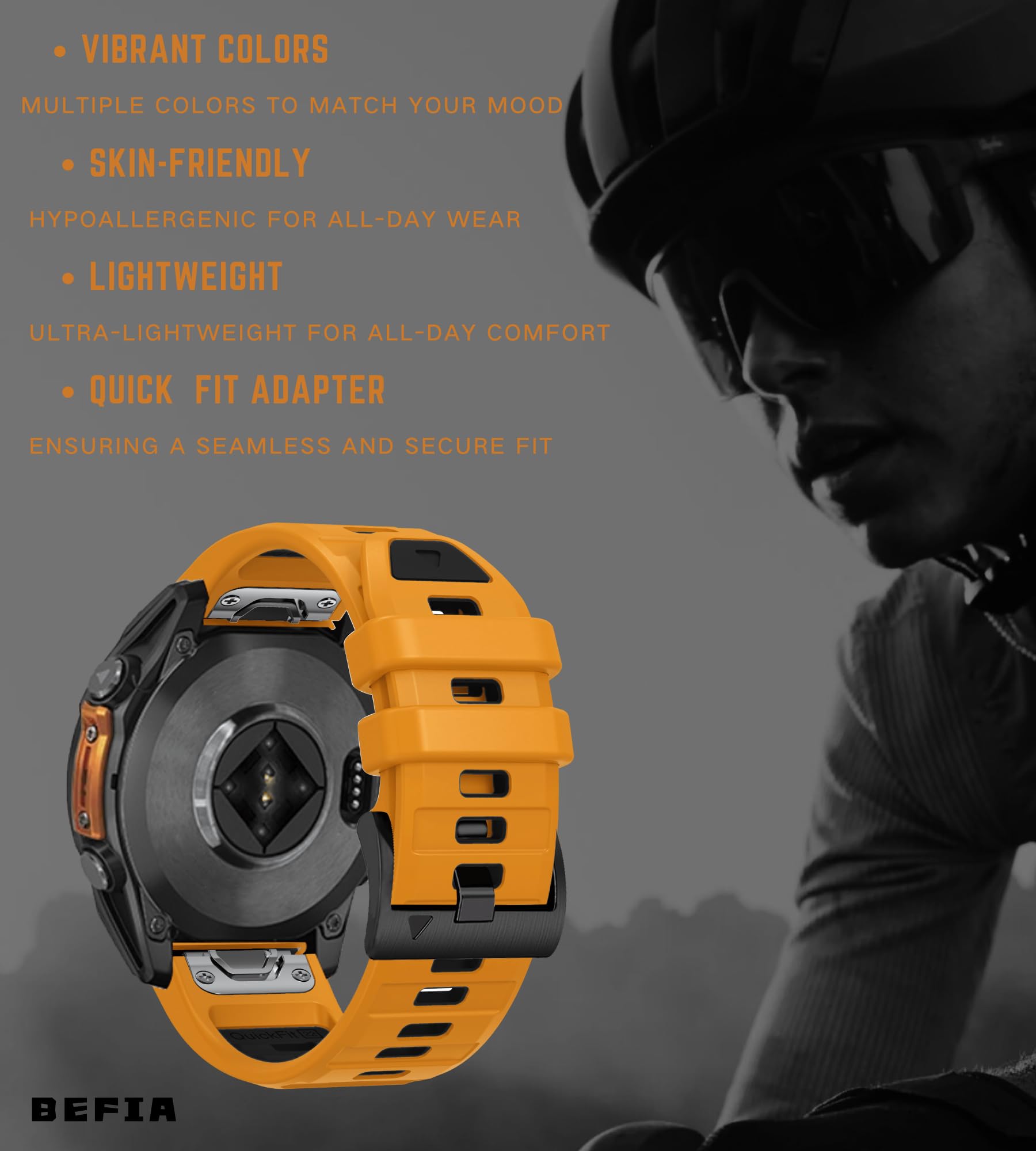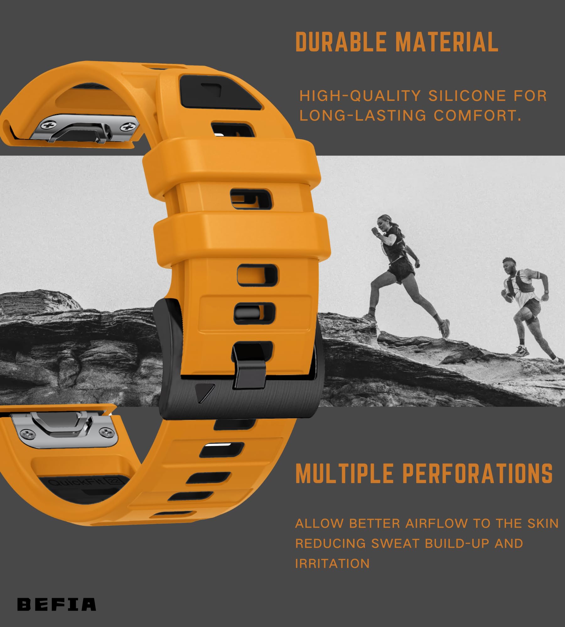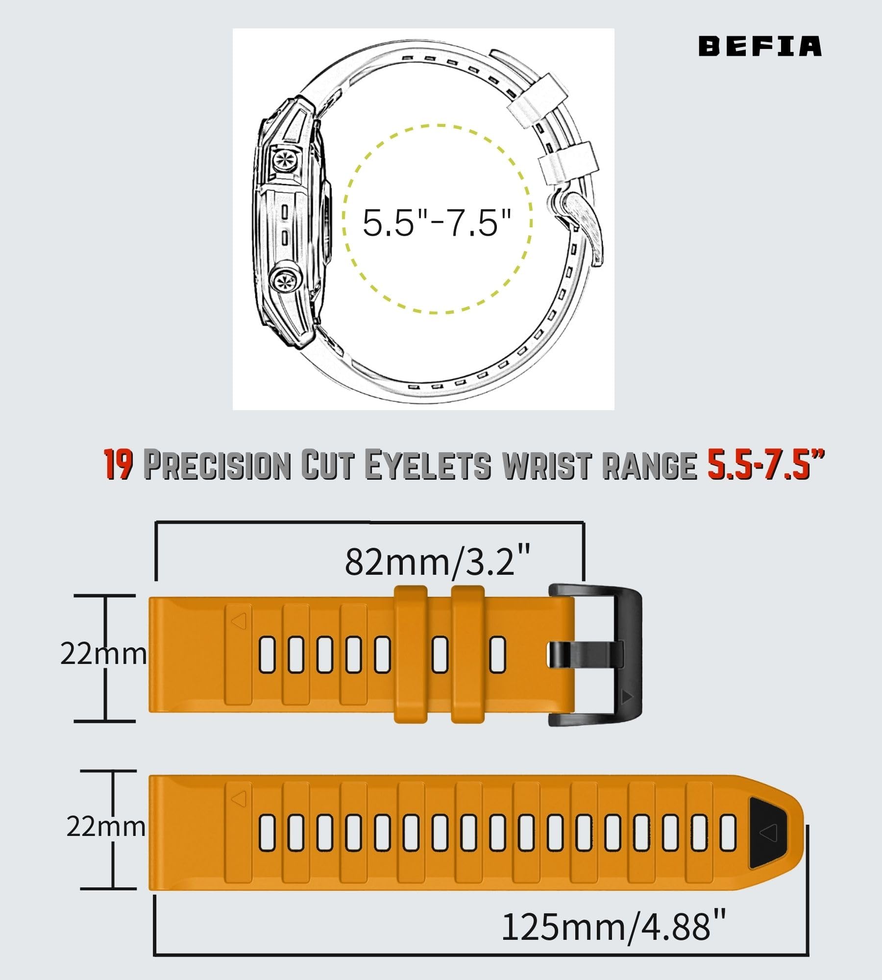 Description Never Lose Focus During Your Adventure Tired of watch bands that slip during critical moments? Our 22mm quickfit silicone strap locks securely through marathons, trail runs, open-water swims, triathlons, kayaking, and rock climbing. No more stopping to adjust mid-race! Breathe Easy in Water & Sweat Specially designed ventilation channels keep your skin dry during lap swimming, surfing, paddleboarding, or HIIT workouts. Say goodbye to skin irritation caused by trapped moisture. Your Style, Your Day Match your active lifestyle with 10 vibrant colors: - Gym Beast: Neon Red/Lime Green - Office Ready: Classic Black/Midnight Grey - Weekend Explorer: Army Green/Navy Blue - Sunset Vibes: Coral Orange/Burgundy Quick change design lets you switch styles for yoga class, business meetings, or date nights in seconds. Rubber Band Replacement Engineered for Garmin Fenix 8 47 mm 7 6 Warriors Precisely crafted for 22mm QuickFit connectors on: 22mm watch band compatible with Garmin Fenix 8 47mm | Fenix 7 Pro/Sapphire | Fenix 6/6 Pro | Forerunner 955/965 *Not compatible with Fenix 7X/6X/5X or Epix 51mm models Why Athletes Choose This Band Saltwater-proof performance for ocean swimmers Non-slip grip during muddy trail runs Zero residue after sweaty cycling sessions Quick dry material for multi-day hikes Technical Details Material: Perforated medical silicone Buckle: Reinforced Metal Pin Buckle Band width: 22mm Quick Fit standard Weight: 1.06oz - Lighter than original bands