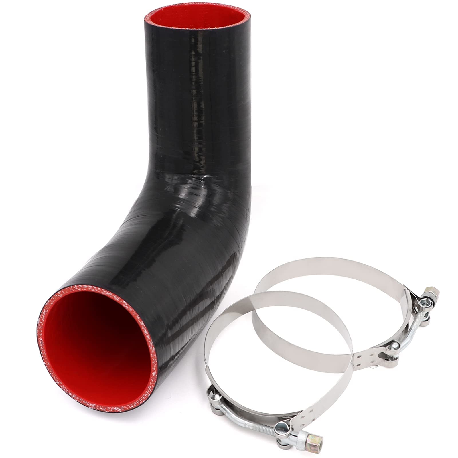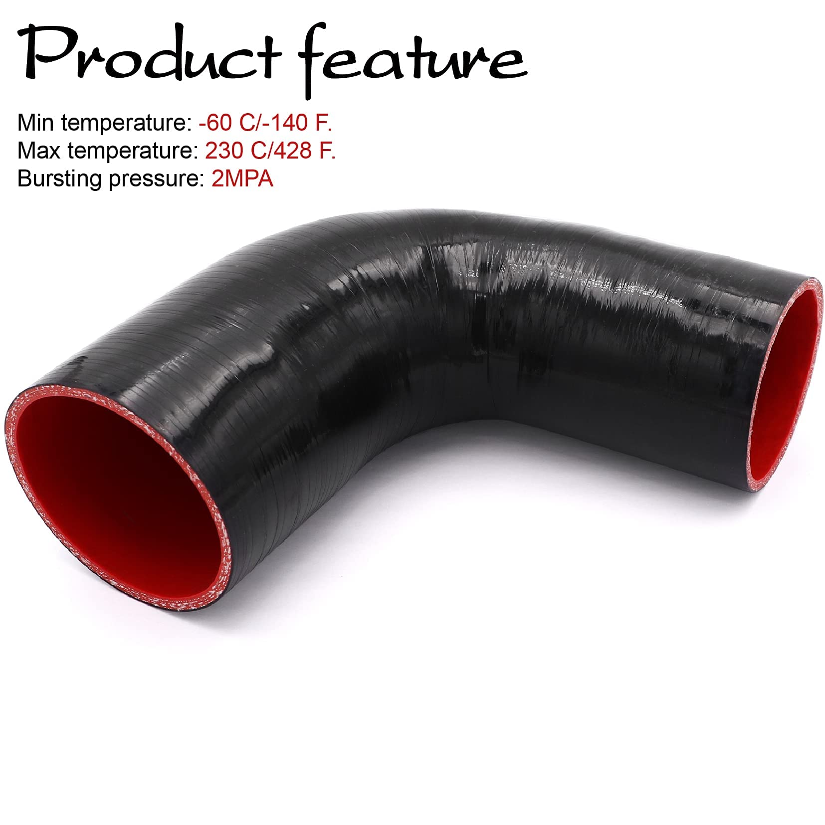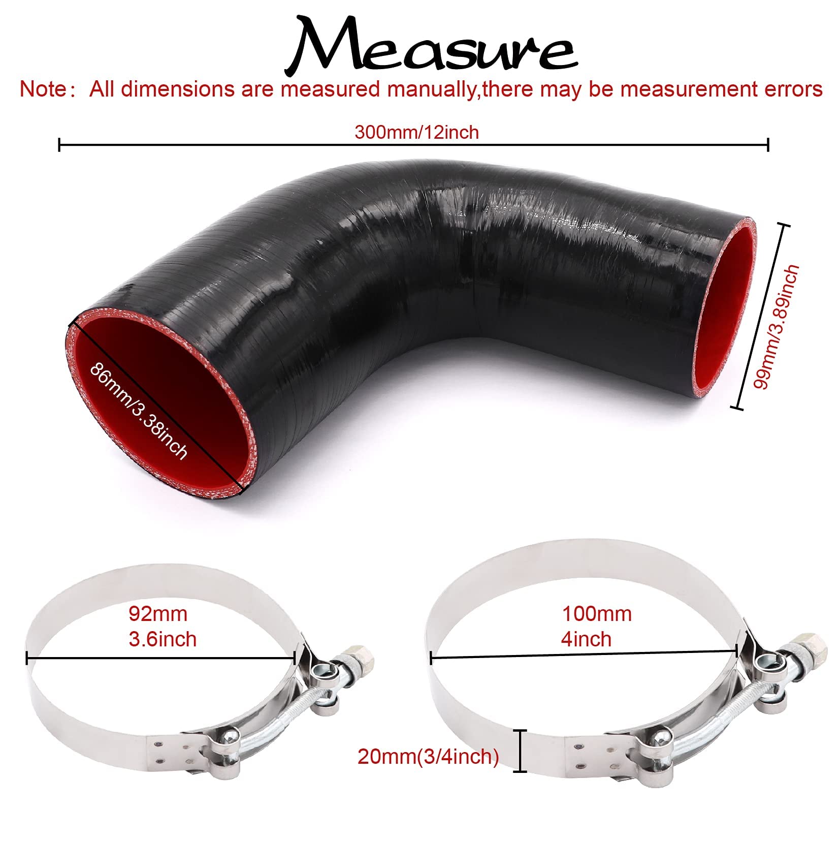 Size: ID3"to3.5"(76mm to 89mm) T-Bolts:One of Diameter 3.5"(92mm),Another One of Diameter 4"(100mm) Silicone Hose Wall Thickness: 5mm 4-Ply Length: 102mm one leg Range of Working TEMP: -60 C to +230C Advantages: It has an extremely low degree of water absorption and its mechanical properties show minimal change, even after long period of immersion. Package include: 1x hose, 2x T-Bolts