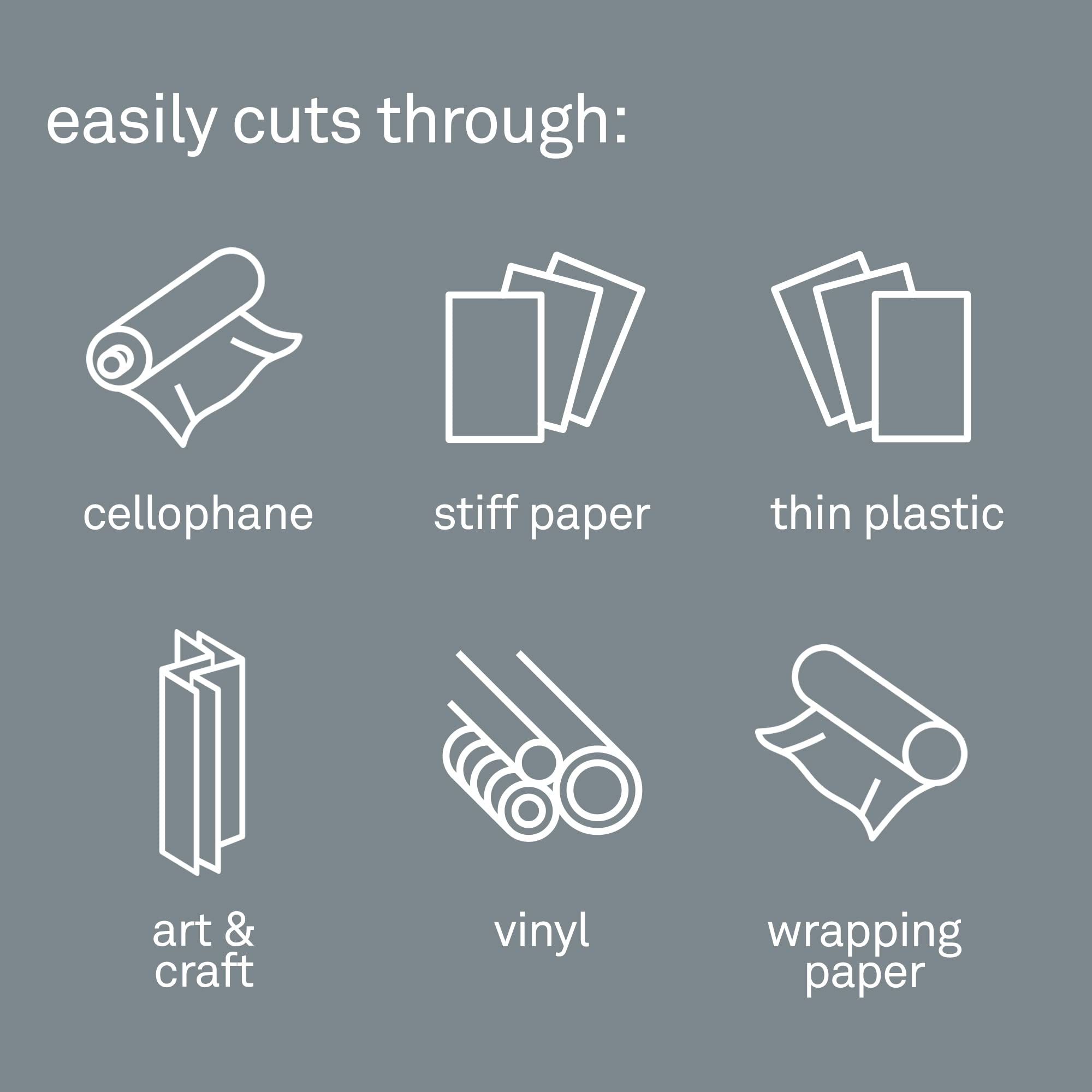 Best for cutting stiffer materials, such as wrapping paper, display cellophane, and standard paper. Not designed for use with flexible materials such as plastic wrap or fabric.