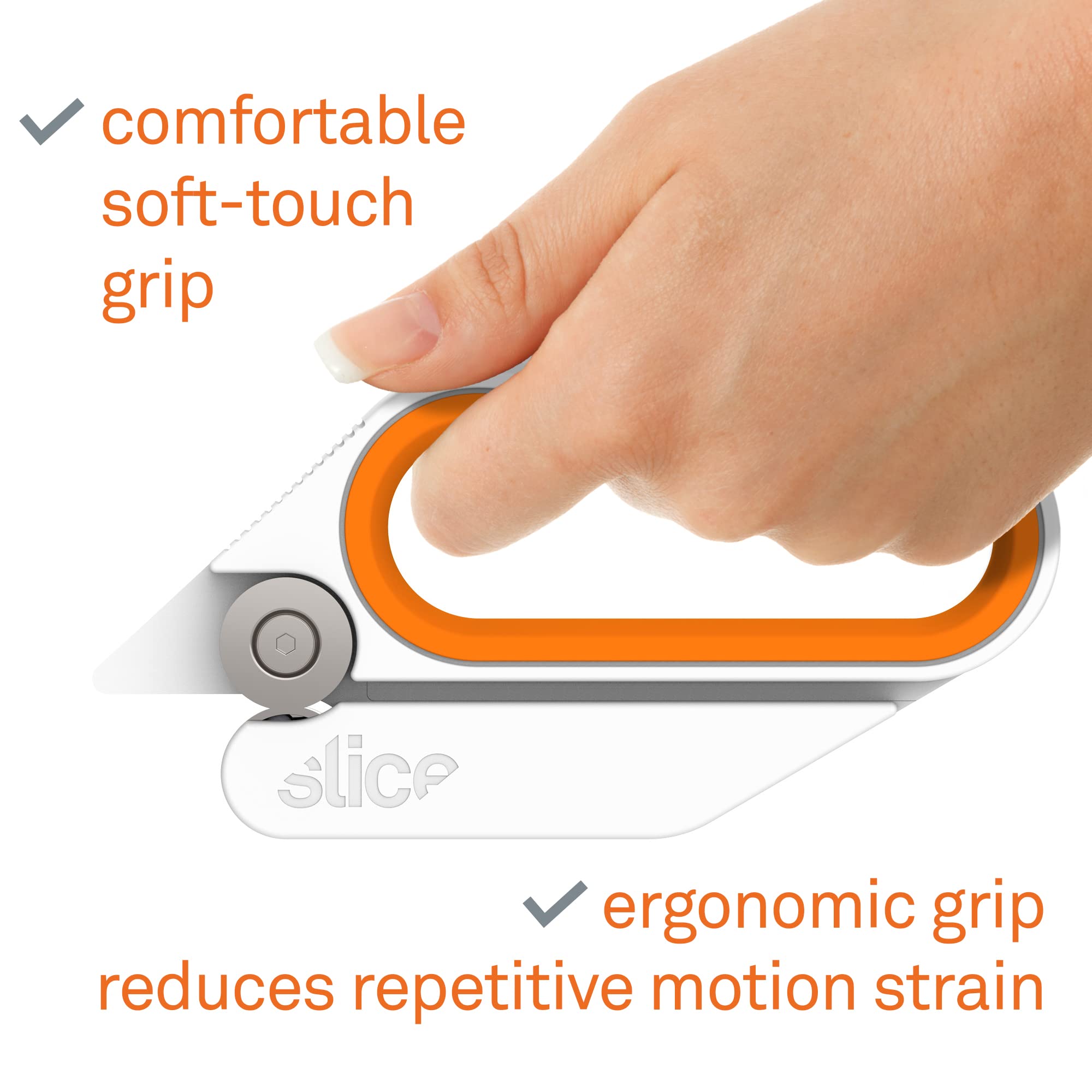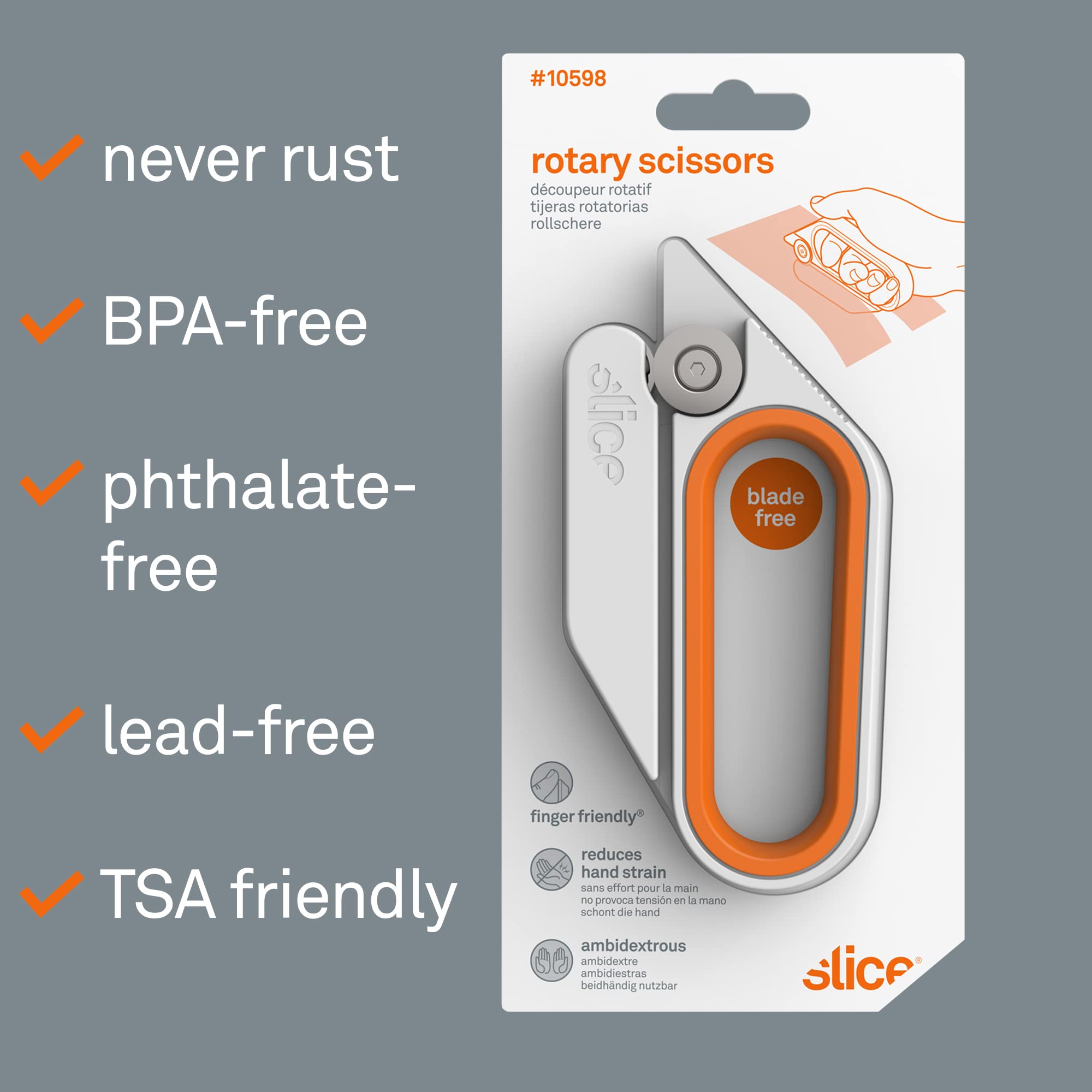 The Slice 10598 Rotary Scissors are a safe, bladeless tool for anyone making long, straight cuts to stiff, thin materials. Whether you’re cutting single sheets off large rolls of newsprint or cutting gift wrap and cellophane for retail, you’ll appreciate this sturdy, ergonomic alternative to traditional scissors. Designed for either right- or left-handed use, the 10598 scissors feature a soft-touch lining and ridged thumb rest for a firm yet comfortable grip.