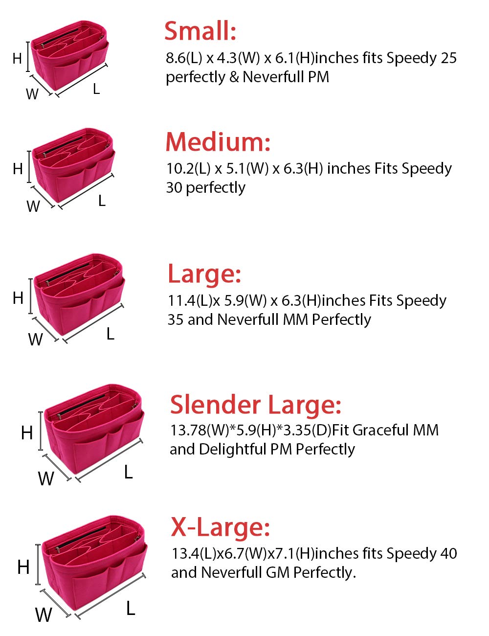 Small:8.6(L) x 4.3(W) x 6.1(H)inches fits LV Speedy 25 perfectly & LV Neverful PM ; Medium: 10.2(L) x 5.1(W) x 6.3(H) inches Fits Speedy 30 perfectly; Large: 11.4(L)x 5.9(W) x 6.3(H)inches Fits LV Speedy 35 and LV Neverful MM Perfectly.X-Large:13.4(L) x6.7(W)x7.1(H)inches fits LV Speedy 40 and LV Neverful GM Perfectly.Portable and Compact Purse Perfectly For any Brand, Such As LV, Longchamp Le Pliage Tote, MK, LV Petit Noe, Gucci, etc.