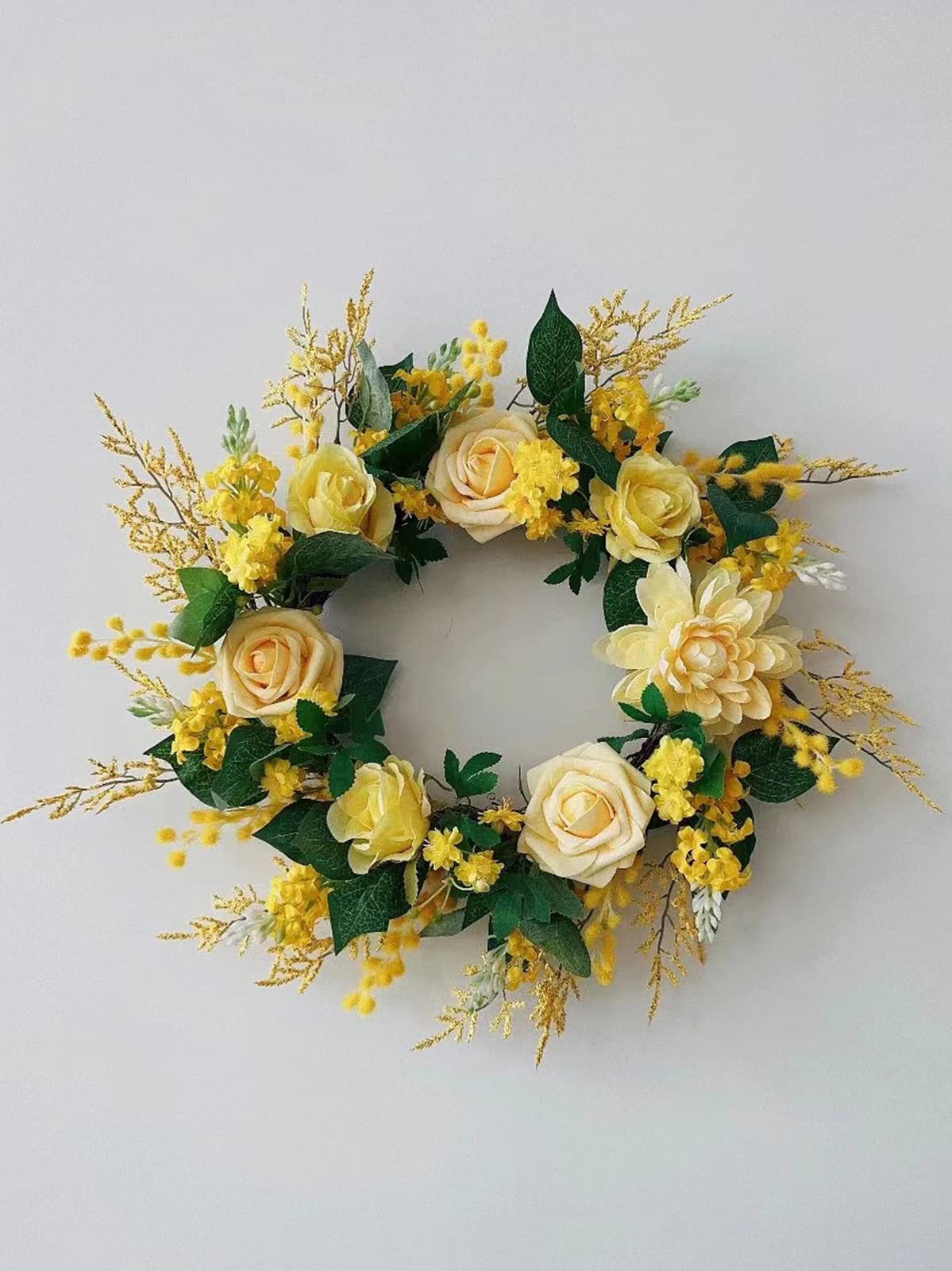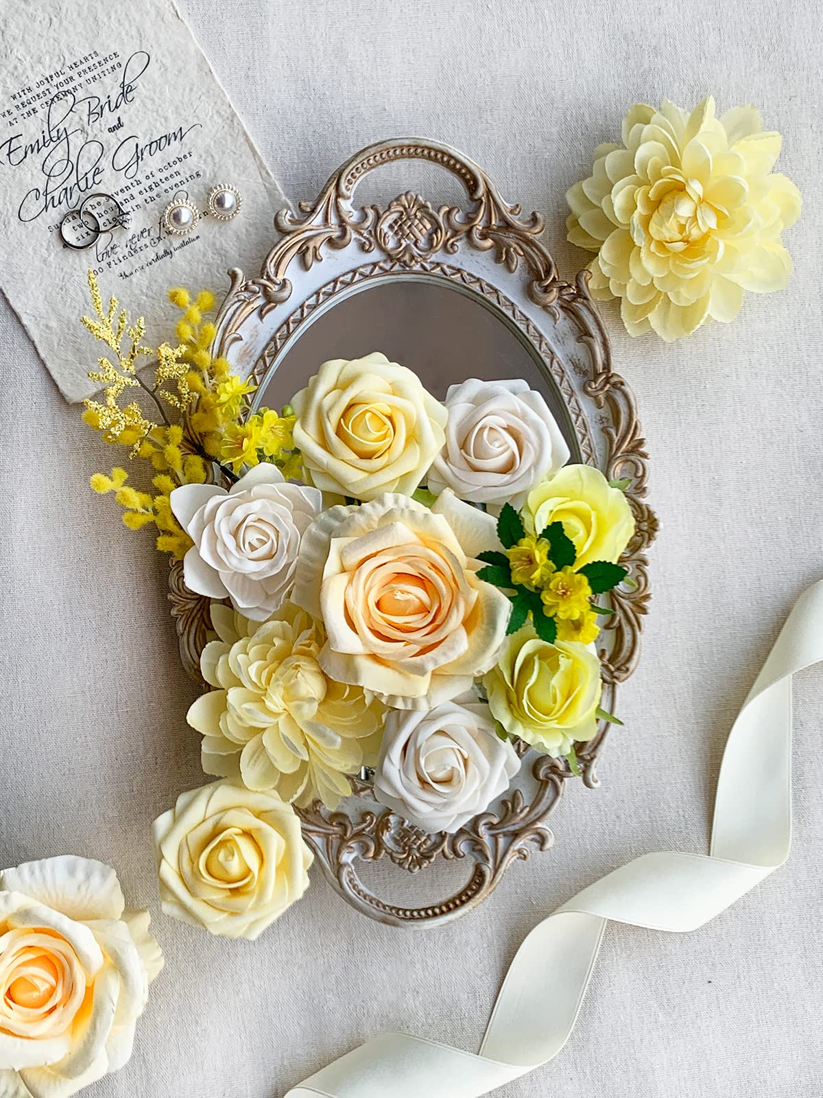 Yellow Roses Artificial Flowers Set: A combo box packs a variety of flowers as vintage farmhouse or rustic themed wedding or birthday. A total of 19 fake flowers and 9 accessories, including mixed silk and foam yellow roses artificial flowers with stems