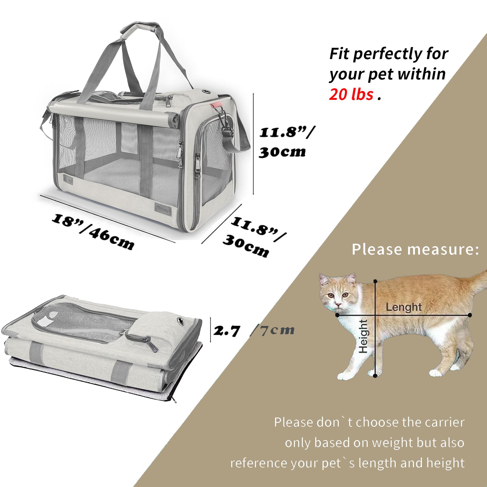 【Dimensions】LARGE SIZE pet carrier for medium, large cats or small dogs, HIGHER AND WIDER than other carriers on market, Recommended max load of 20 lbs (9 kg). Measures: 18.1"L x 11.8"W x 11.8”H. Please don't choose the carrier only based on weight but also reference your pet's length and height.