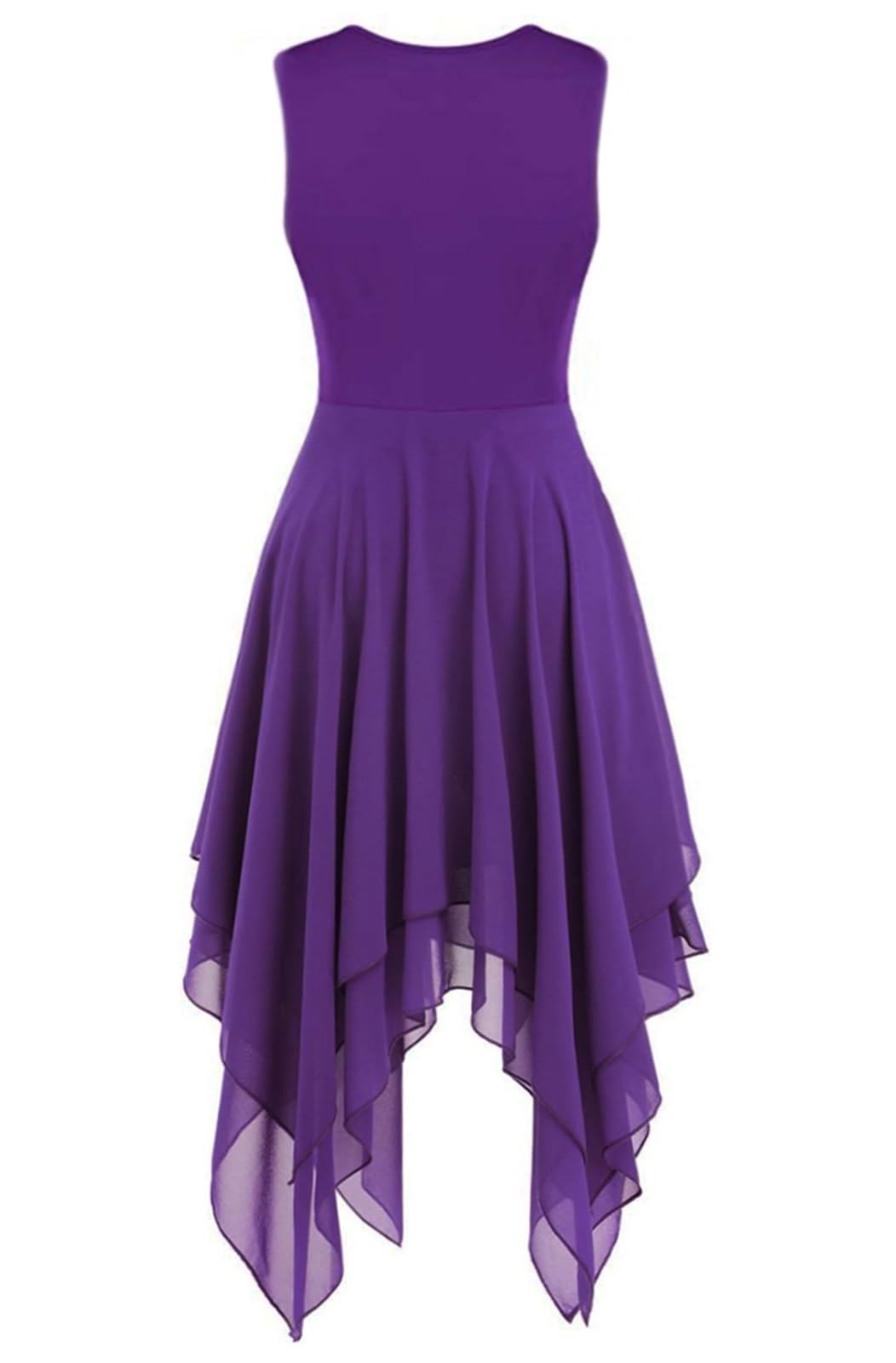 UNIQUE DESIGN: Sleeveless irregular hem ruffle chiffon praise lyrical dance dress, crew neck, pull-on closed, metallic color block patchwork, V-shaped waistline, creating a high waist effect. The bottom is a double layered chiffon irregular hem big swing flowy skirt (White may be a bit seen through), can be looks flowy and graceful when twirling or moving.