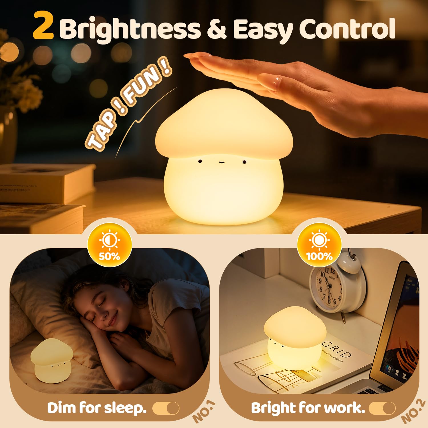 đăMulti-Scene Mushroom Lamp: Kids Sleep, Adults Relax & MoreăFrom 7 PM kid's bedtime to 11 PM adult's phone time, mushroom lamp night lamp fits every moment!Use mushroom lamp as kids night light for bedtime stories (low brightness, cozy glow), baby night light for nursery feedings (soft light won't wake baby), or an adult's cute lamp for scrolling social media (high brightness,clear screen view). Mushroom night light for kids lamp & mushroom lamp & baby night light for baby nursery lamp & dimmable night light works in nurseries, master bedrooms, living rooms,and even kids' playroomsâdim it for sleep,brighten it for play,and let versatile mushroom decor light up every corner of your home!