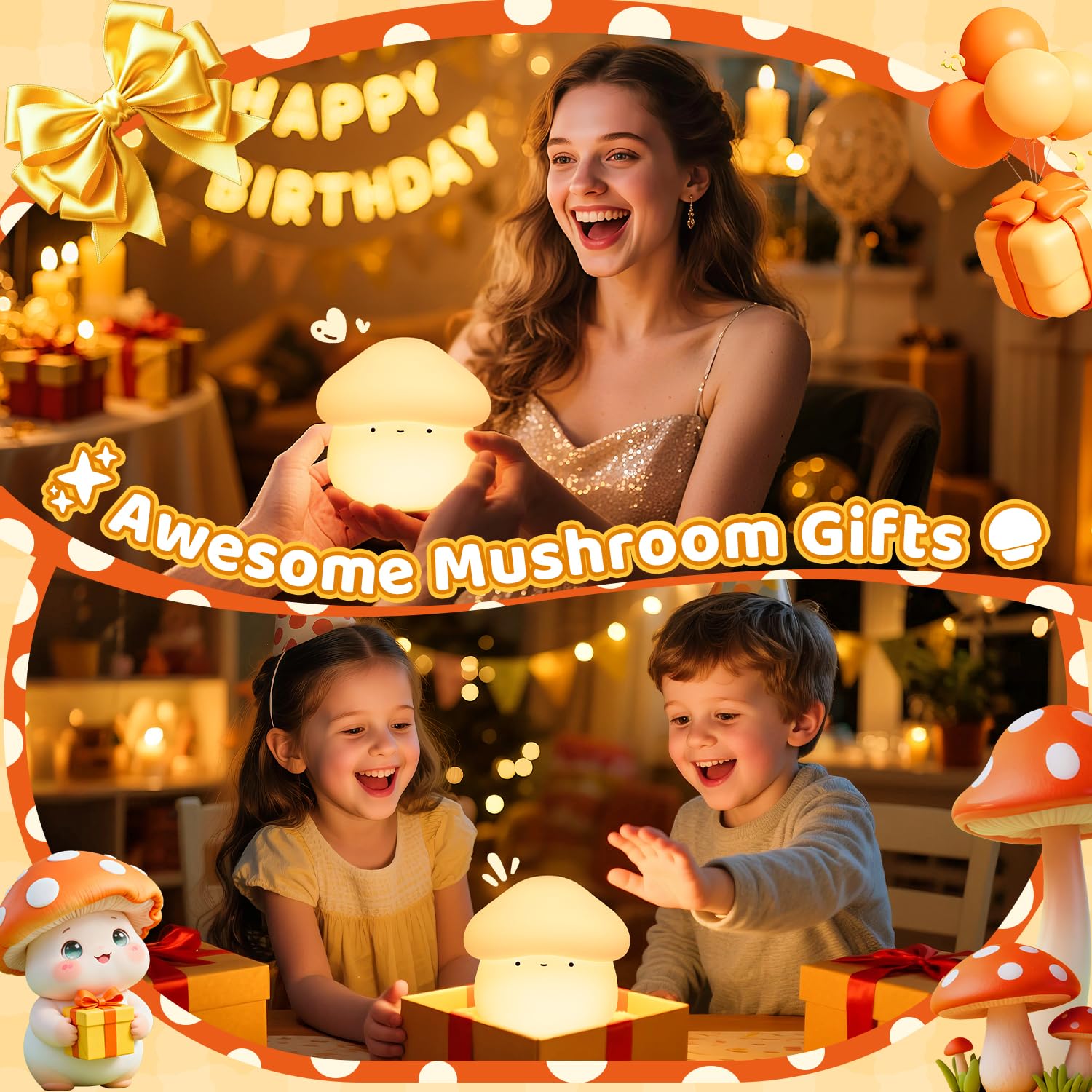 đăCute Mushroom Gifts: Awesome for Women, Kids & Baby ShowersăMushroom lamp cute lamp isn't just mushroom night lightâit's a heart-melting mushroom gifts cute gifts!Women adore its adorable mushroom decor design as a nursery lamp toddler night light or bedroom desk accent, while kids fall in love with its soft silicone texture (like a huggable mushroom pillow).Cute gifts & mushroom gifts & mushroom night light for kids & cute night light & cute lamp & nursery lamp & mushroom decorations make it ideal for birthdays, baby showers, Christmas, or 'just because' surprises.Gifting mushroom lamp,kids night light for kids lamp means giving warmth,safety,and a touch of kawaii stuff to every home!