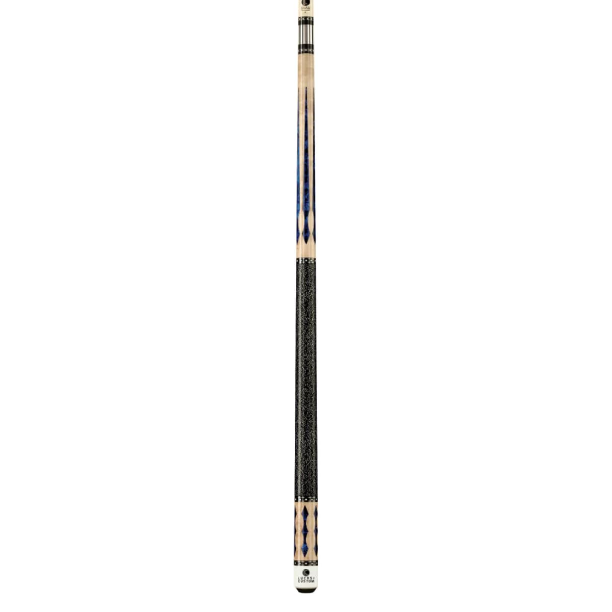Design: A natural Birds-eye Maple billiard cue with floating six-point blue luster inlays, decorative ring sets, genuine double-pressed black & white Irish linen wrap, stainless steel collared Uni-Loc quick-release joint and upgraded Lucasi Custom Solid Core Low Deflection Technology Shaft.