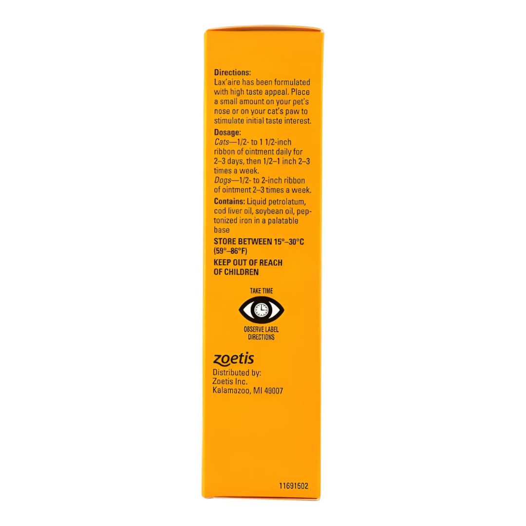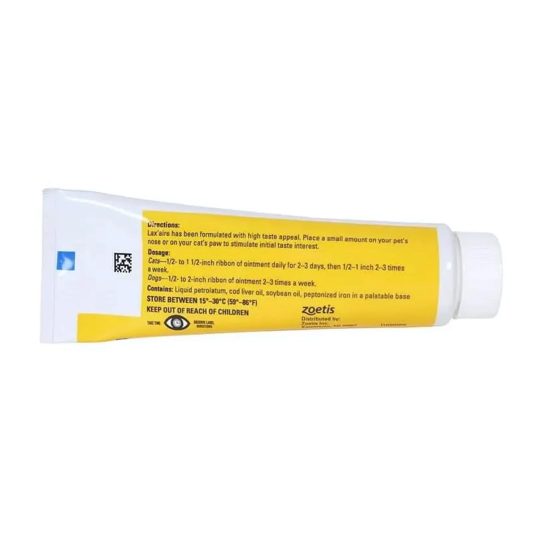 LAX’AIRE is a gentle laxative and lubricant in a palatable ointment approved for use in dogs and cats. It is also helpful for relieving discomfort and irritation caused by hairballs. DIRECTIONS: Lax’aire has been formulated with high taste appeal. Place a small amount on your pet’s nose or on your cat’s paw to stimulate initial taste interest. DOSAGE: Cats–1/2- to 1 1/2- inch ribbon of ointment daily for 2–3 days, then 1/2–1 inch 2–3 times a week Dogs–1/2- to 2- inch ribbon of ointment 2–3 times a week.
