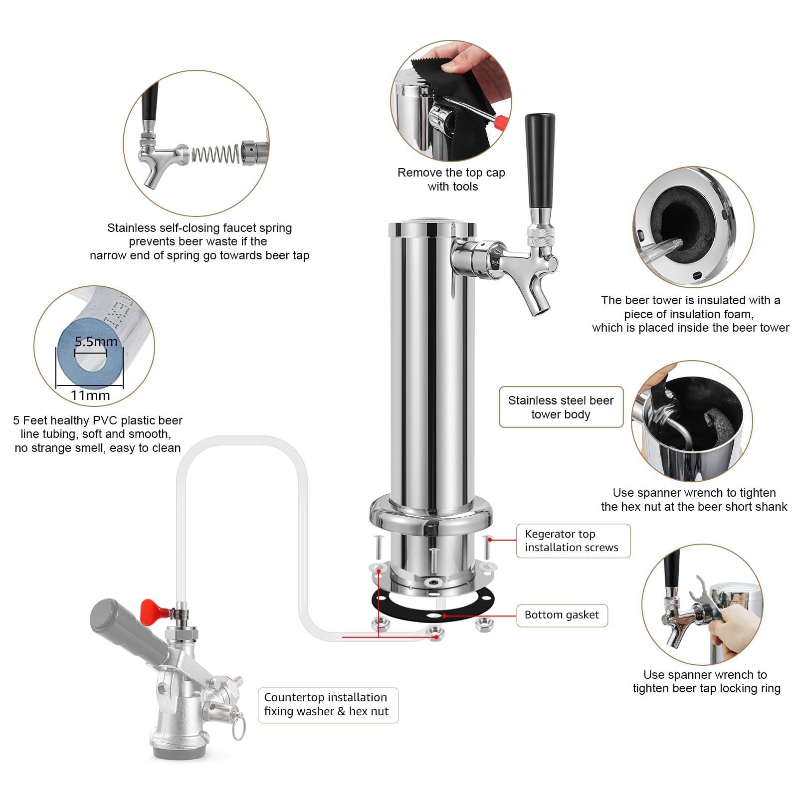 【Complete Kegerator Installation Parts】This single tap beer tower is pretty well thought out coming with all parts that are used to install this beer tower on the top of a kegerator, includes keg tool for faucet installation and removal, useful wrenching around the system, big rubber gasket to install between the beer tower and mounting surface, a collar that sits at the base of the tower to hide the installation hardware, etc. healthy tubing will not produce odor to you drinks!