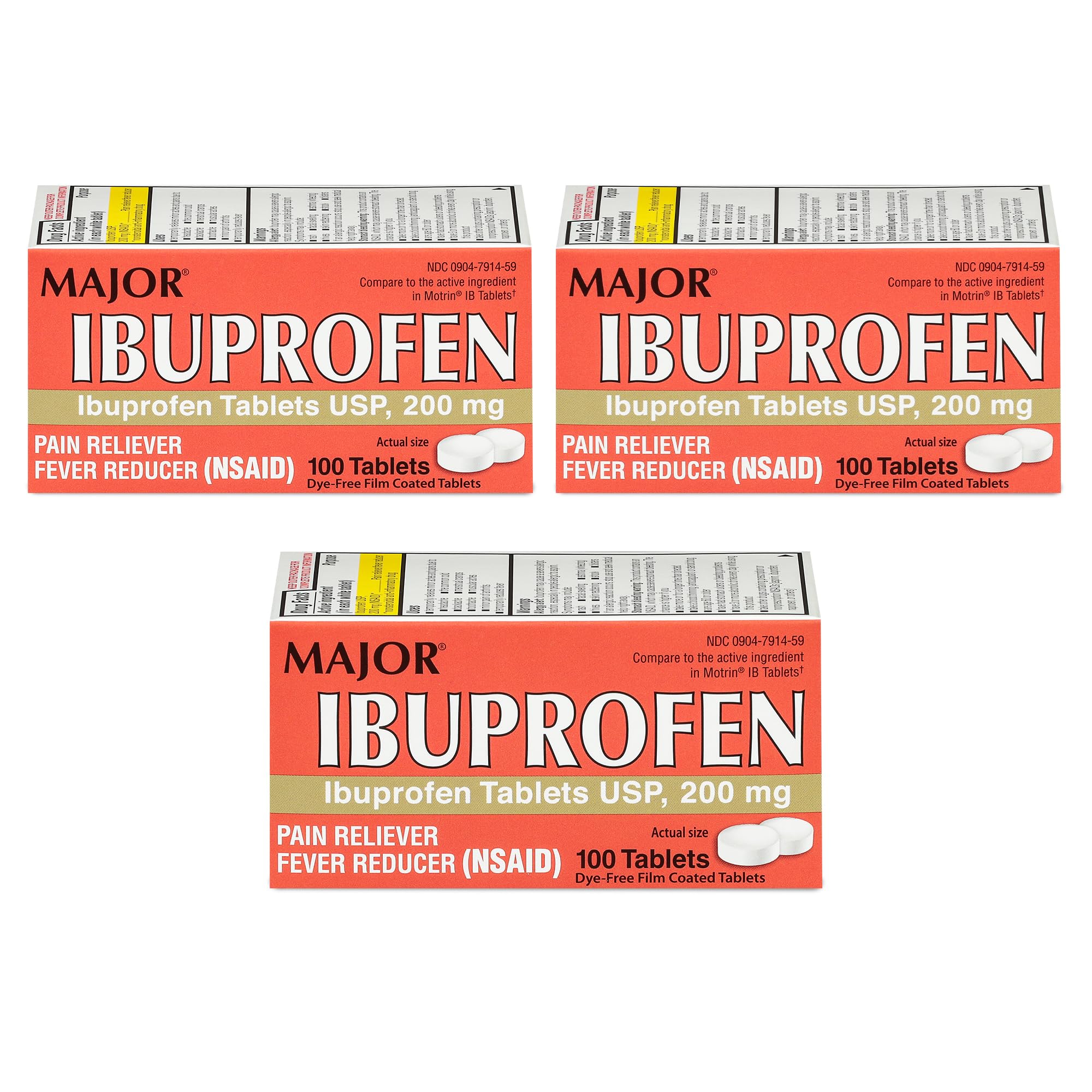 Major’s 200 mg Ibuprofen Tablets temporarily relieve minor aches and pains due to headaches, backaches, toothaches, minor arthritis pain, the common cold, menstrual cramps, and muscular aches. They also temporarily reduce fevers. Each dye-free tablet contains 200 mg of ibuprofen USP, a pain reliever and fever reducer. Do not take more than directed. The smallest effective dose should be used. Adults and children 12 years and over: take 1 tablet every 4 to 6 hours while symptoms persist. If the pain or fever does not respond to 1 tablet, 2 tablets may be used. Do not exceed 6 tablets in 24 hours unless directed by a doctor. If an upset stomach occurs, take the medicine with food or milk.