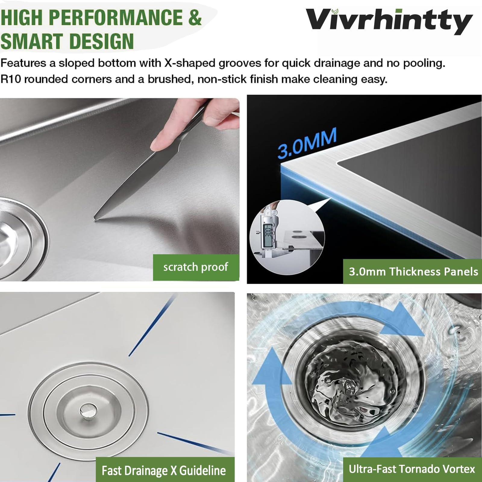 Heavy-Duty T-304 Stainless Steel: Crafted from T-304 stainless steel with an 18/10 chromium-nickel alloy, this sink delivers exceptional scratch—built to withstand daily wear for years. It also features a 3mm thickened rim, adding critical strength at high-stress areas (like when placing heavy pots) and outperforming ordinary sinks in durability