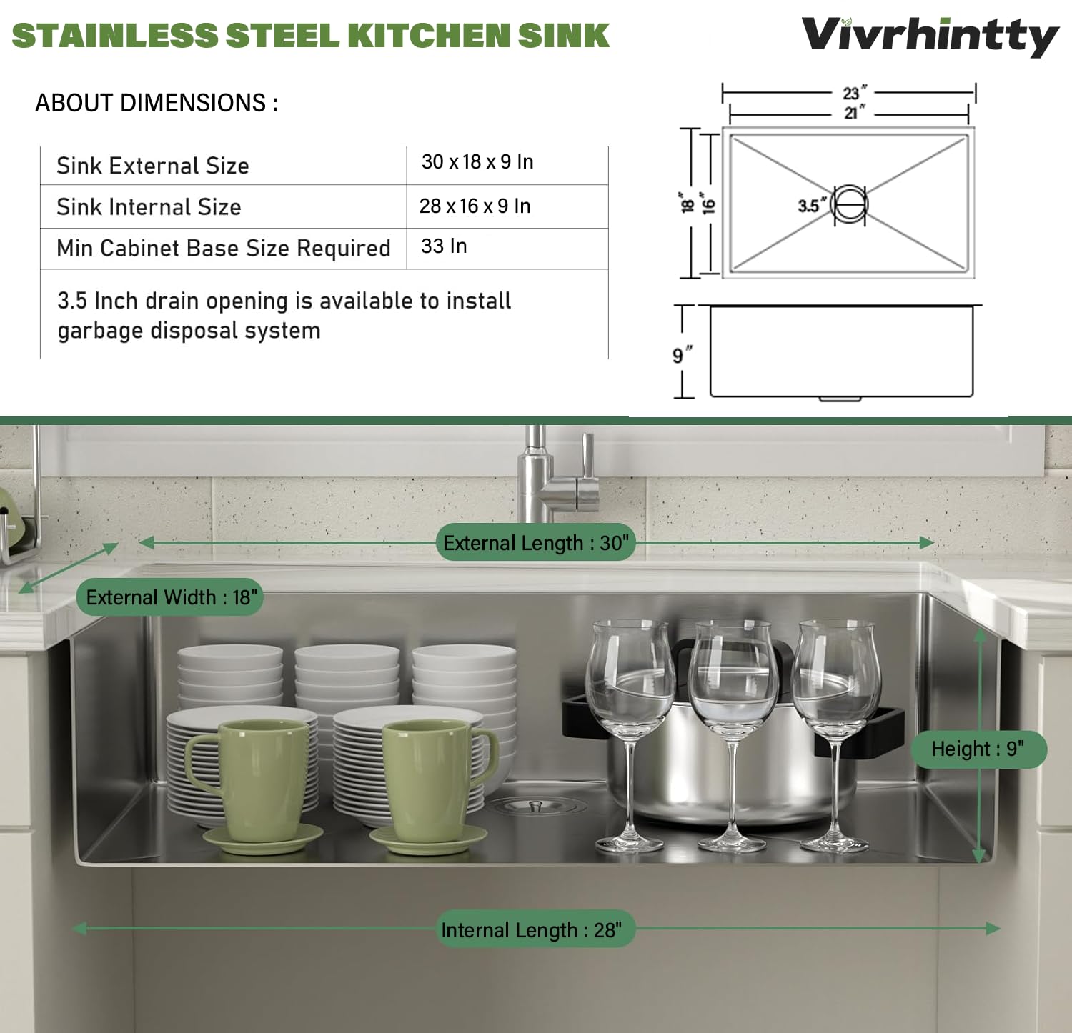 Precise Fit & Compatibility: This sink has exterior dimensions of 30"L x 18"W x 9"D, designed to fit cabinets 33 inches or larger—please verify your cabinet size before purchase to avoid fitting issues. It comes with a standard 3.5" drain opening, which is fully compatible with most garbage disposals and drain assemblies, making installation hassle-free.