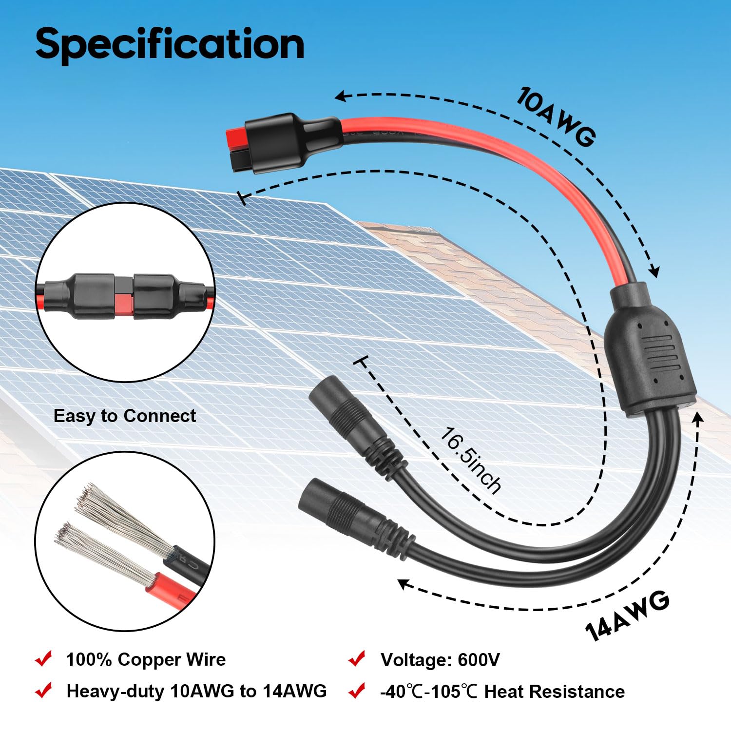 High Quality Solar Adapter: anderson connector end is heavy duty 10AWG copper wire, Compatible with 12AWG and 14AWG/16AWG solar cable; the dc 8mm female end is 14AWG copper wire.double PVC jacket, flexible and wear-resistant, best insulation effect. 80°C heat resistance. Rated Voltage: 600V,Rated current: 20A. Cable Length: about 42cm/16.5inch.