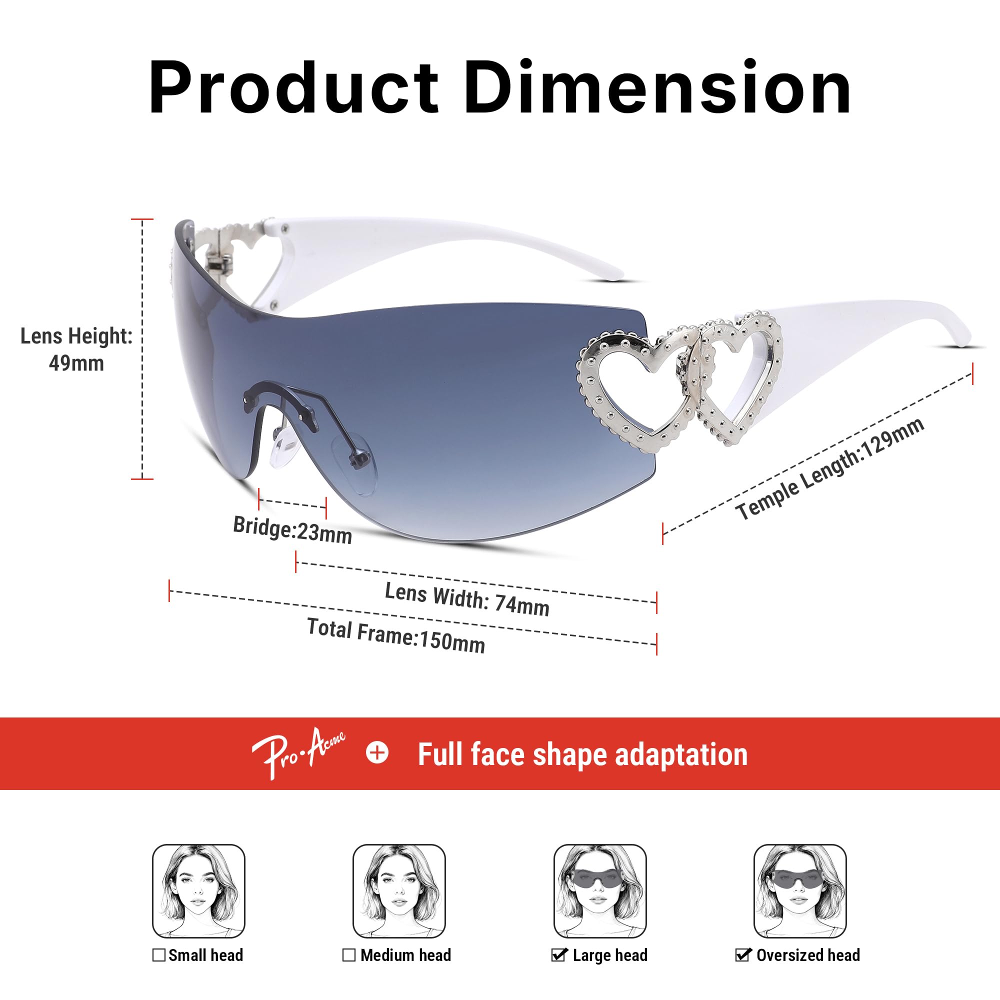 Product Dimension:Lens width: 74 mm/2.91 inches Lens height: 49 mm/1.93 inches Bridge width: 23 mm/0.91 inches Frame length: 150 mm/5.91 inches Arm length: 129 mm/5.09 inches
