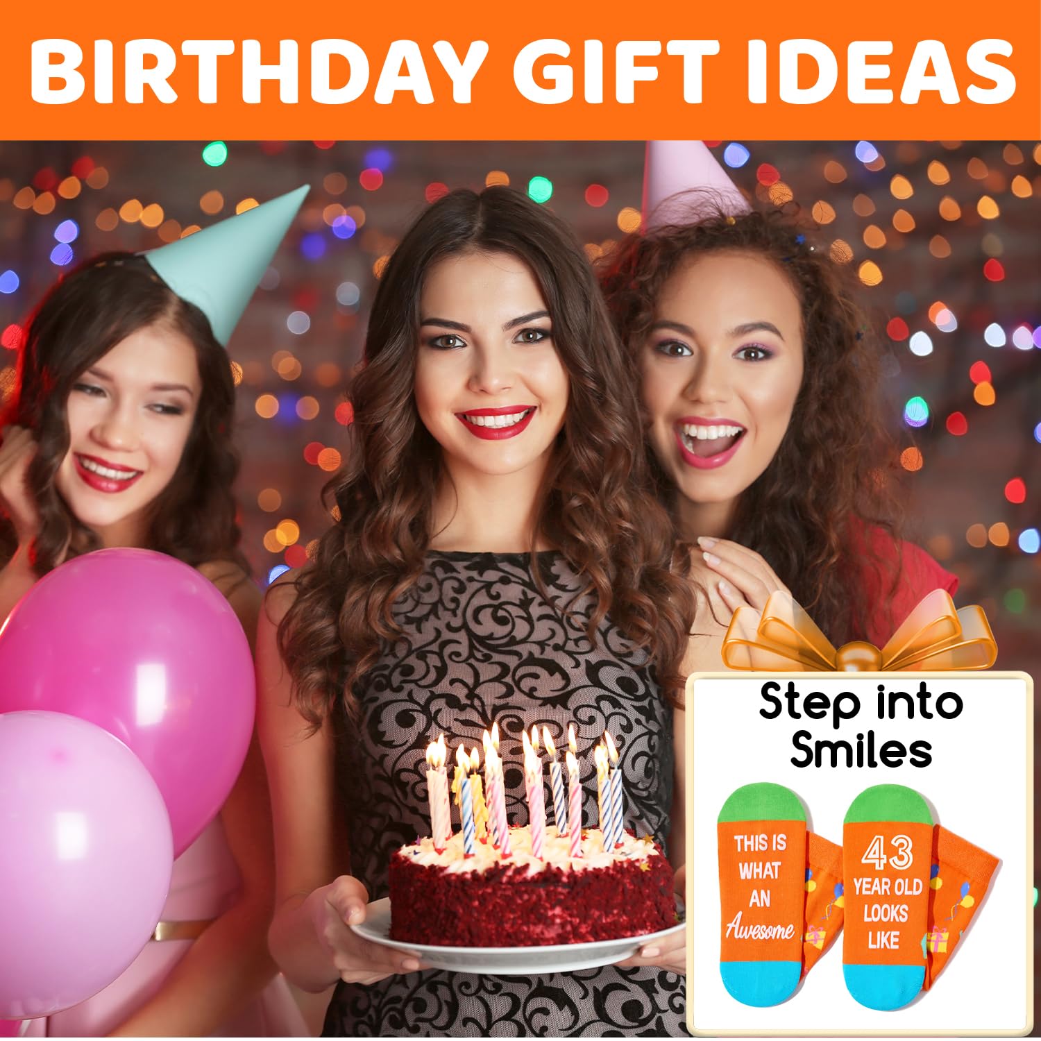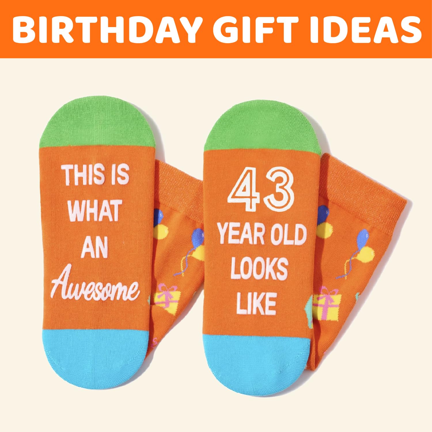 GIFTS FOR 43 YEAR OLDS: The top of the socks features birthday gifts, hats, cakes, and other elements, the bottom features a hilarious secret message written in non-slip ink: "THIS IS WHAT AN Awesome 43 YEAR OLD LOOKS LIKE."