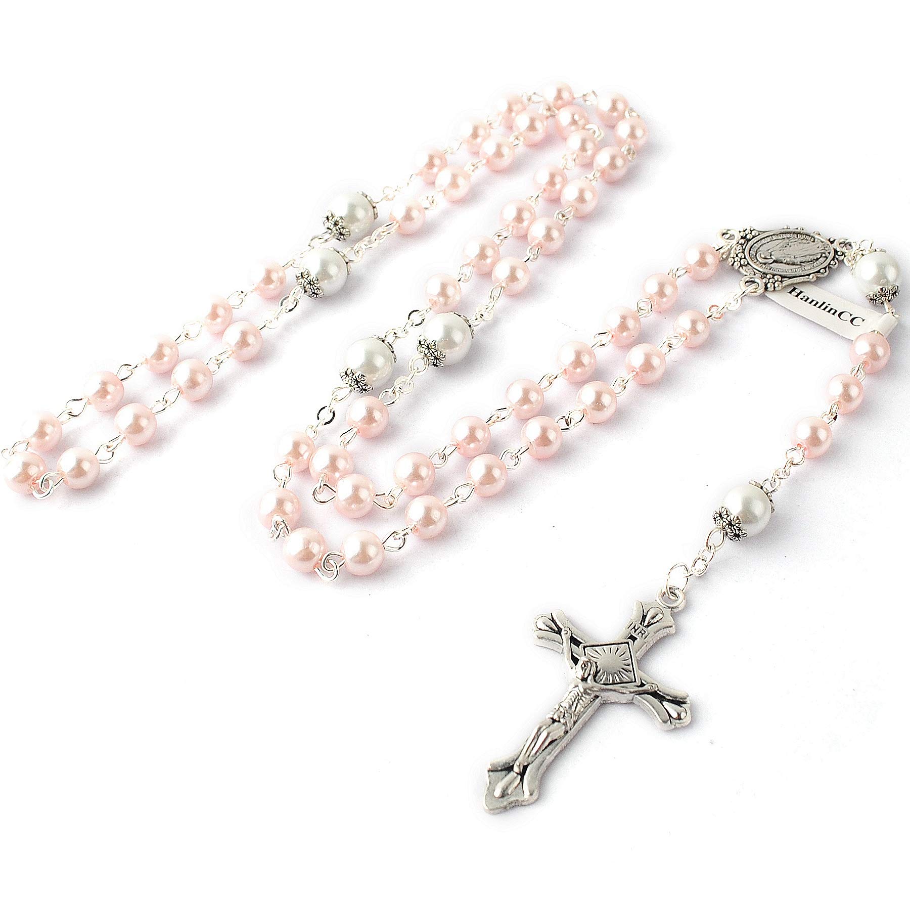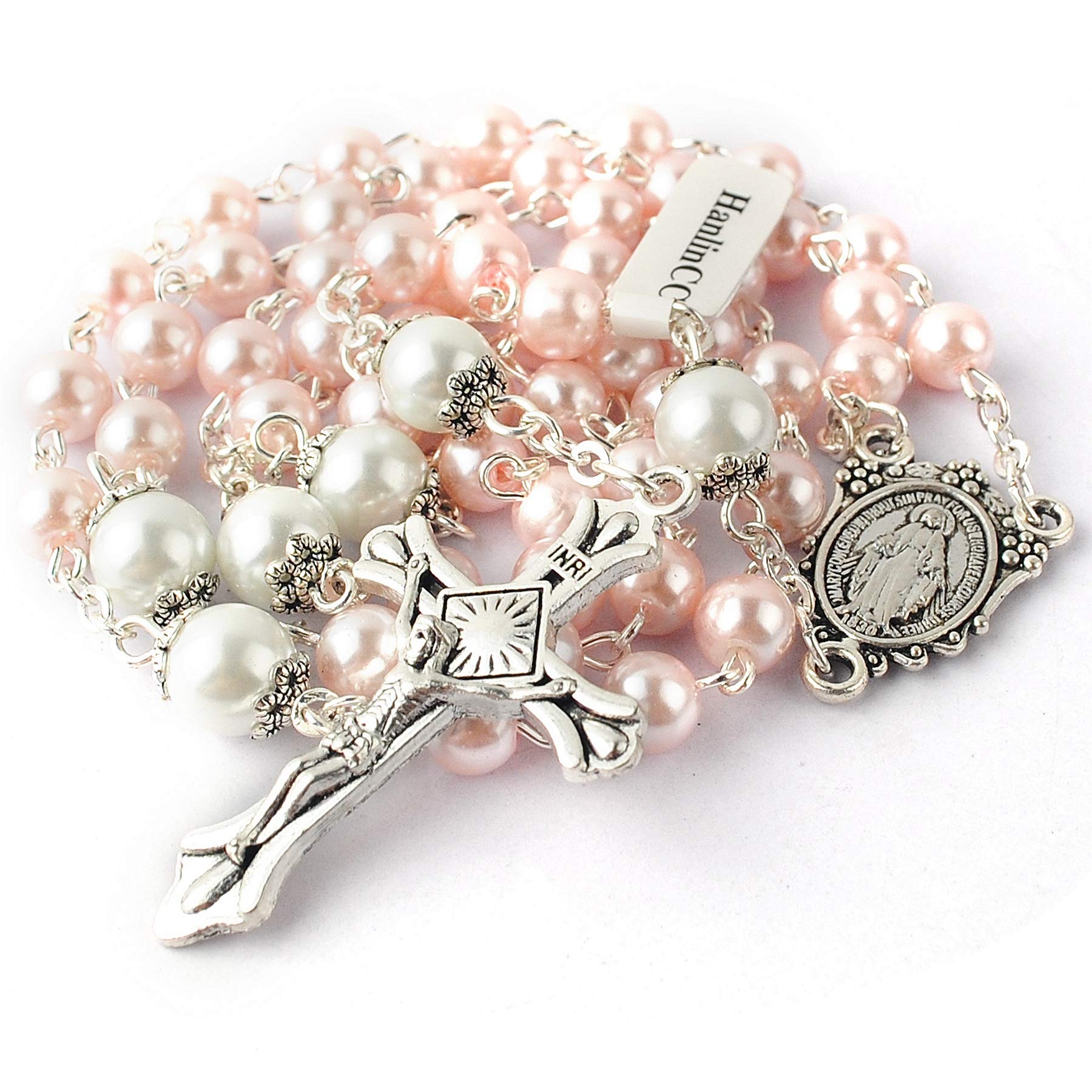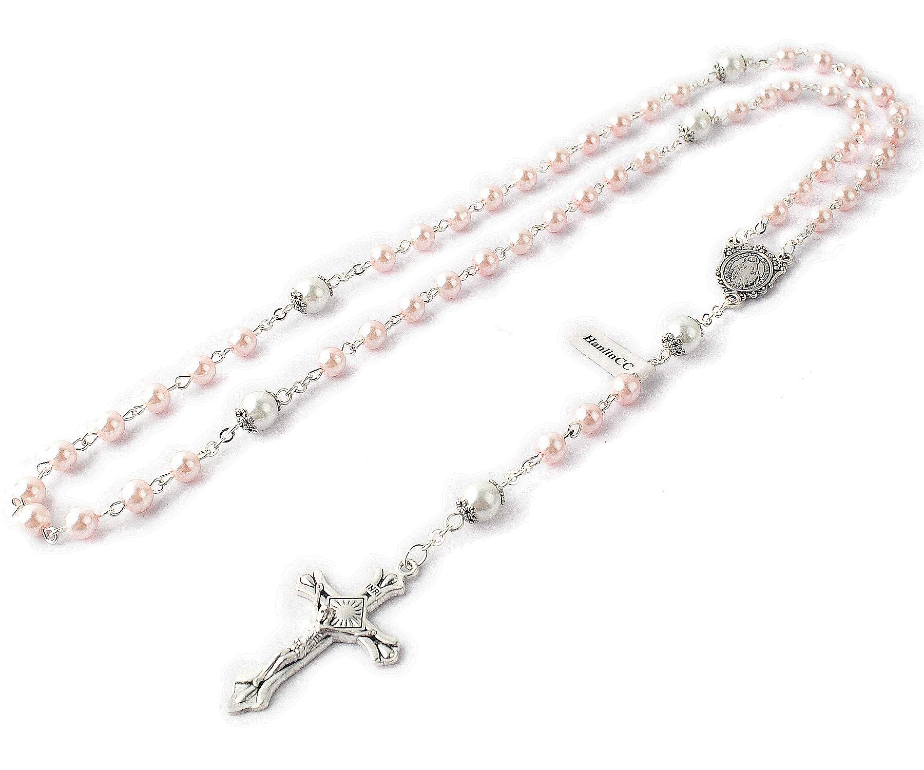 The glass pearl beads rosary Hail Mary beads size is 6mm, our father beads are 8mm with caps, it is make you can pray with your eyes closed and know you have reached the end of a decade and can meditate on the next Mystery of the rosary.