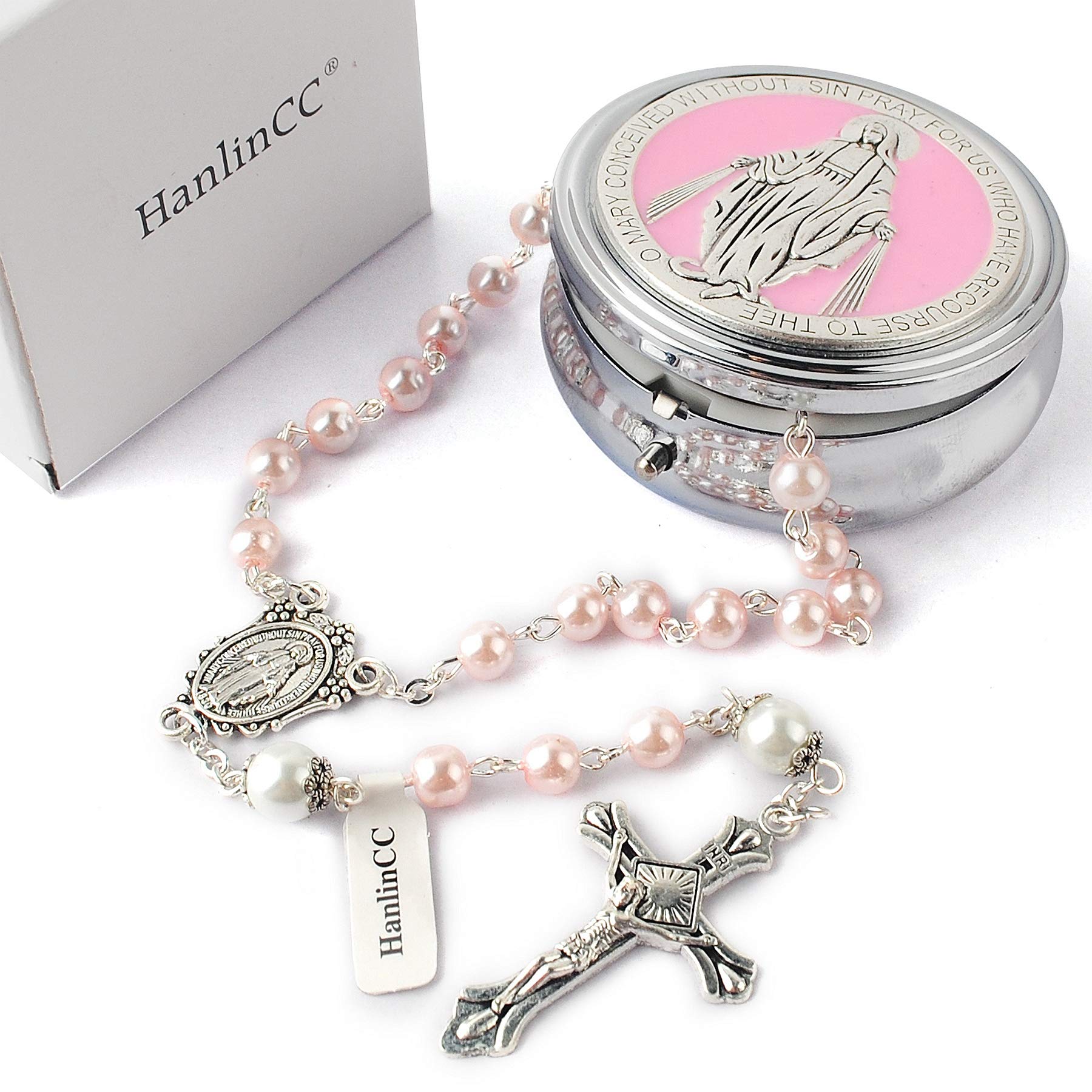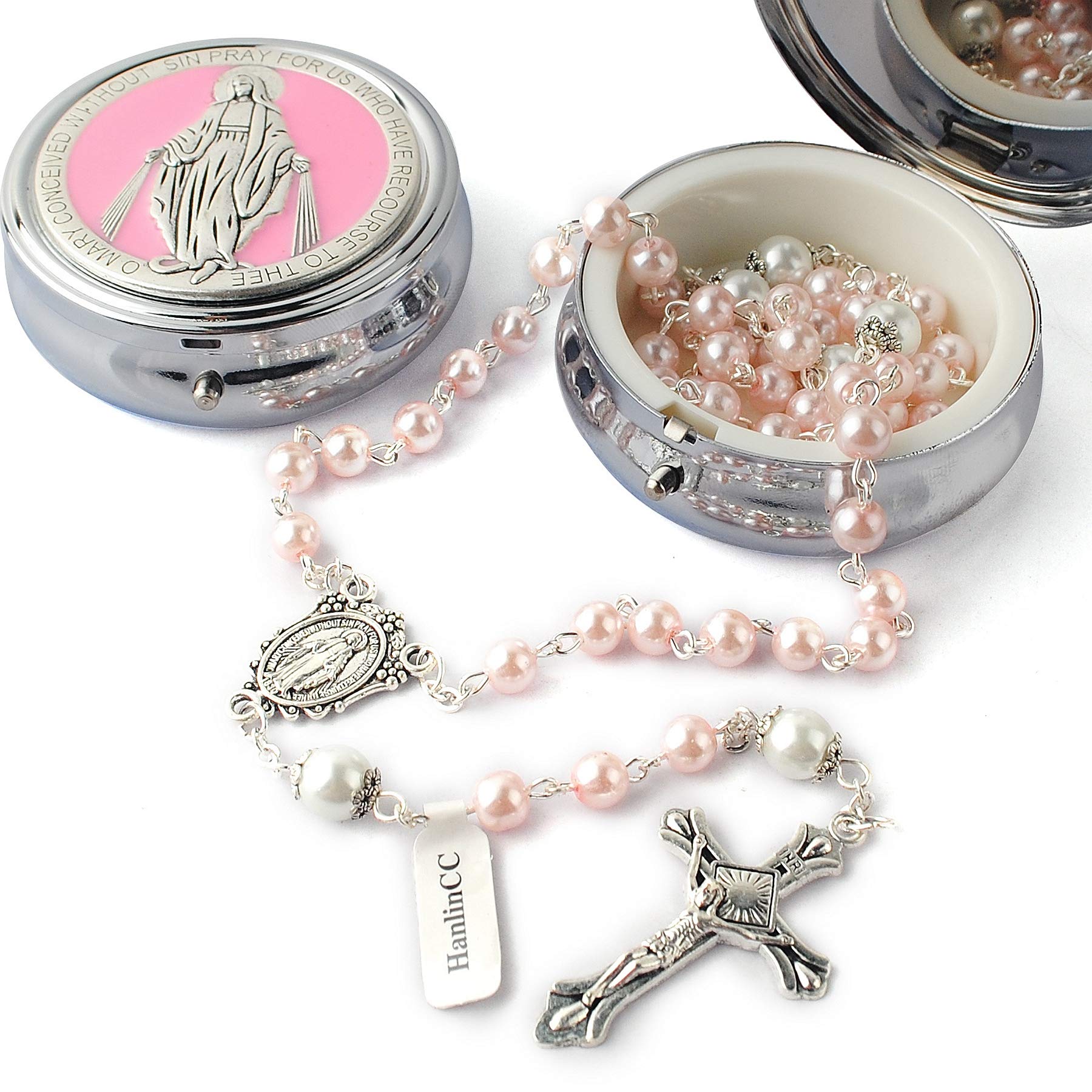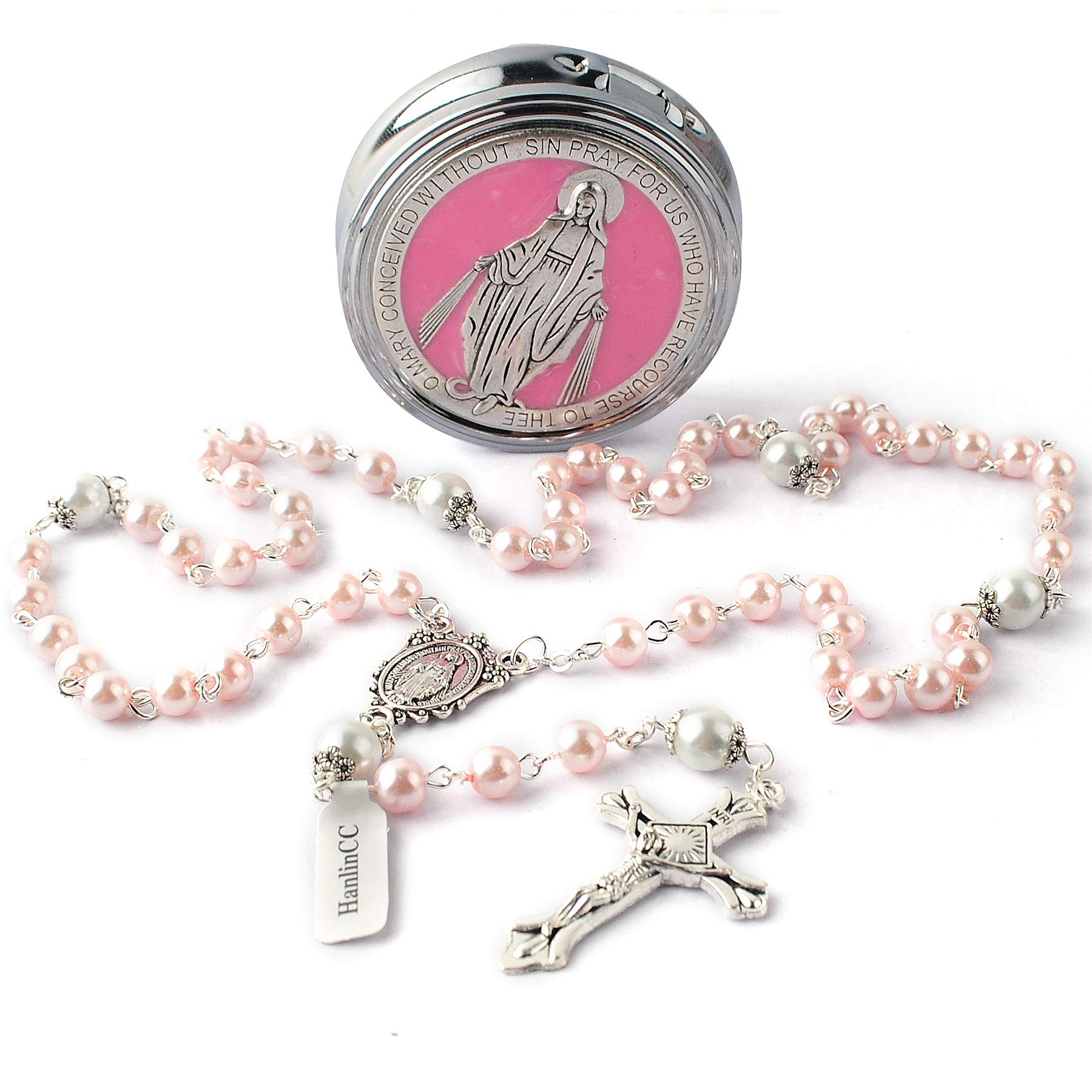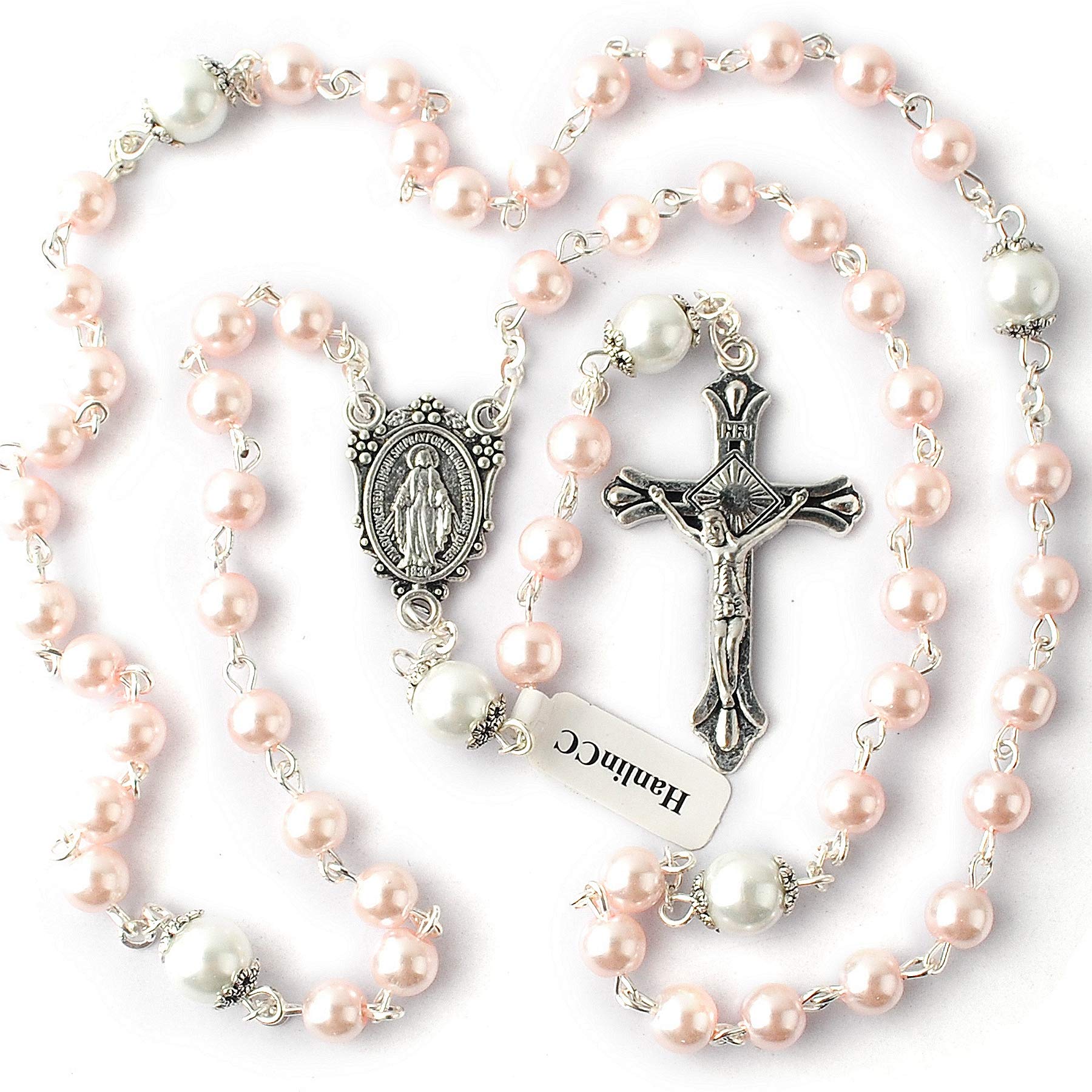 Glass pearl beads rosary necklace length is 53cm (20.8 inches), rosary unit weight is 33 grams (0.073 lbs), rosary with Miraculous Metal Gift Box unit weight is 91 grams (0.2 lbs) ; Rosary center piece and Crucifix are Zinc Alloy with Anti-Silver plated, the pin and chain are shiny silver plated , the chain material is strong copper, it make the rosary also very strong and stunning;