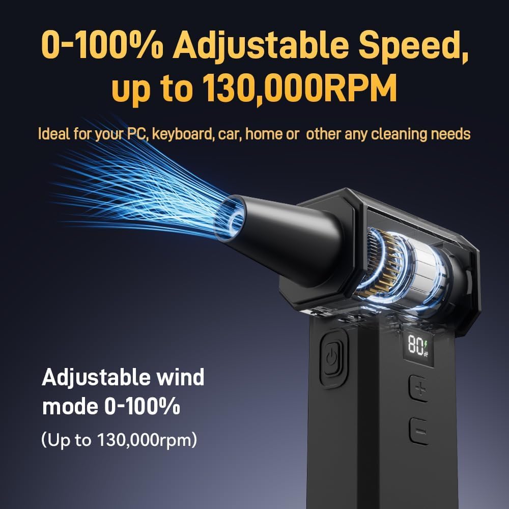 🔥【Powerful Performance & Stepless Speed Control】:This electric air duster replaces traditional canned air duster with 130,000 RPM speeds and 100-step control, delivering 180g wind force for precision cleaning. Customize airflow for tasks like computer air duster compressed air needs or delicate surfaces.