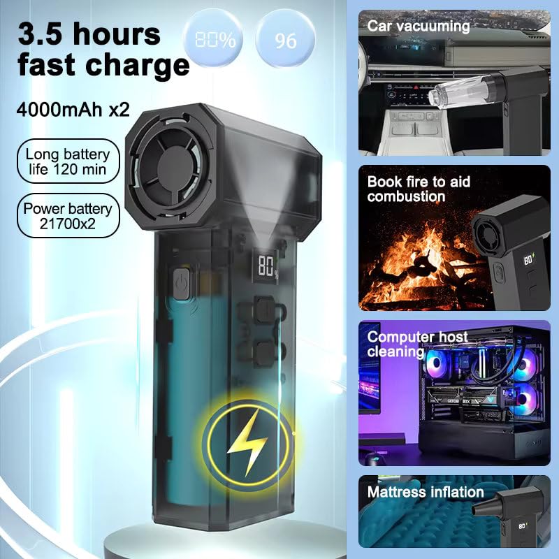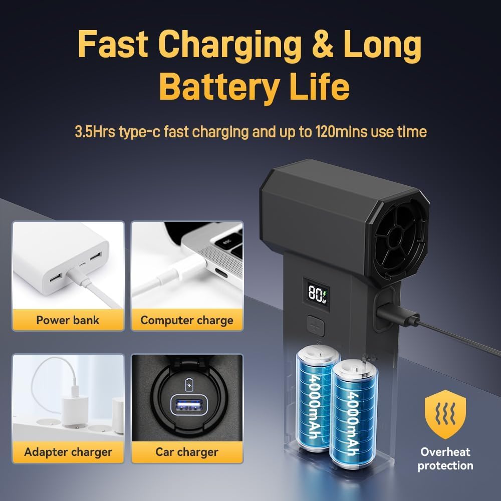 🔋【Fast Charging & LED Display】:The compressed air duster has a built-in dual 4000mAh batteries (8000mAh total) provide 10-120 minutes runtime.Comes with Type-C fast charging cable, fully charged within 3.5hours.The jet dry blower for car with a HD LED display allows you to view the remaining battery level and wind gear so that you can charge it in time.