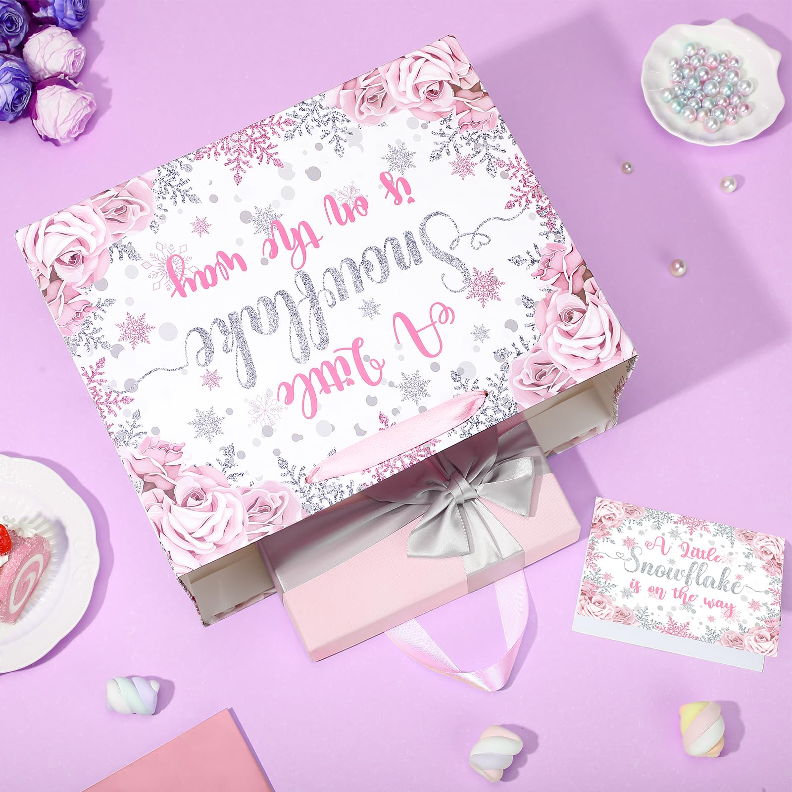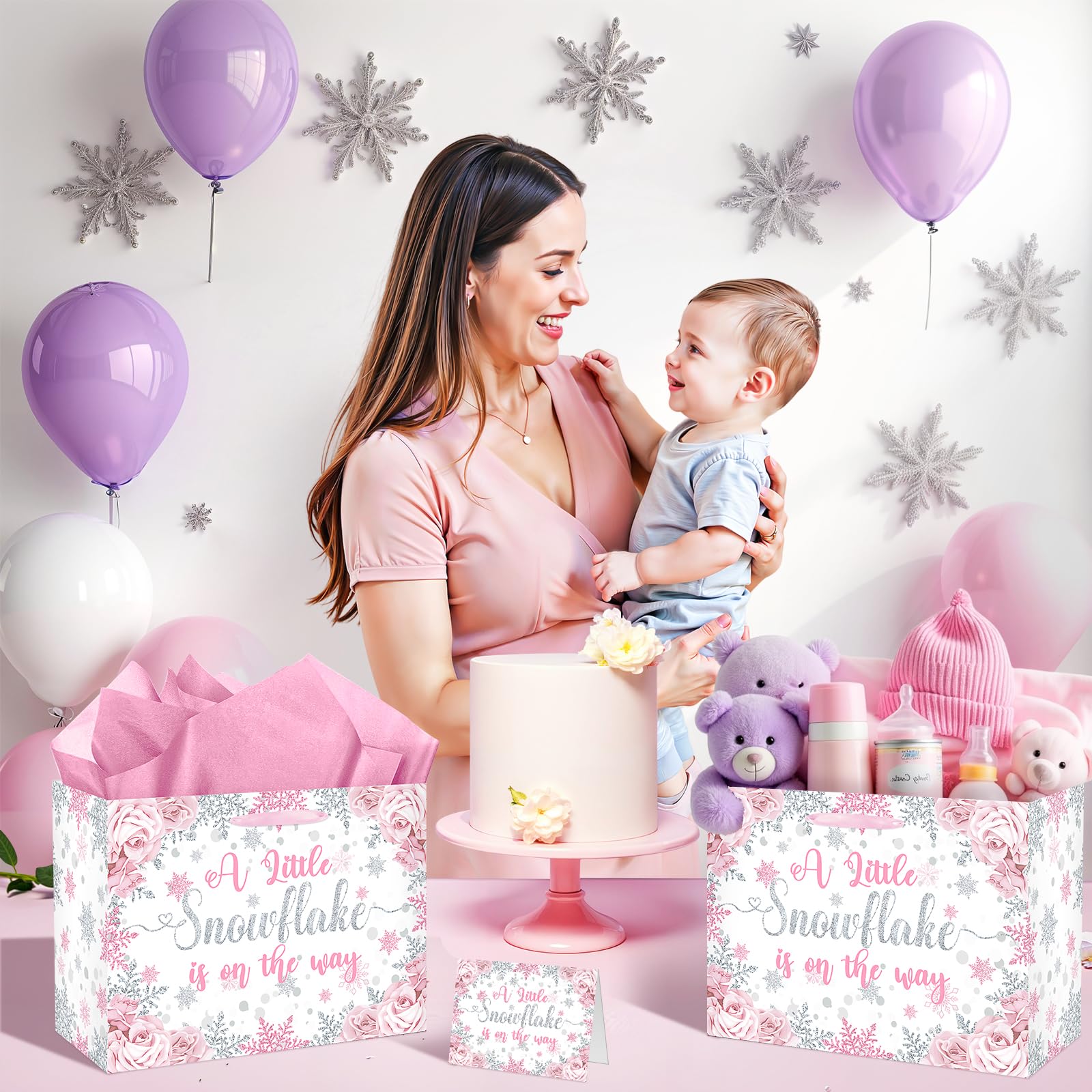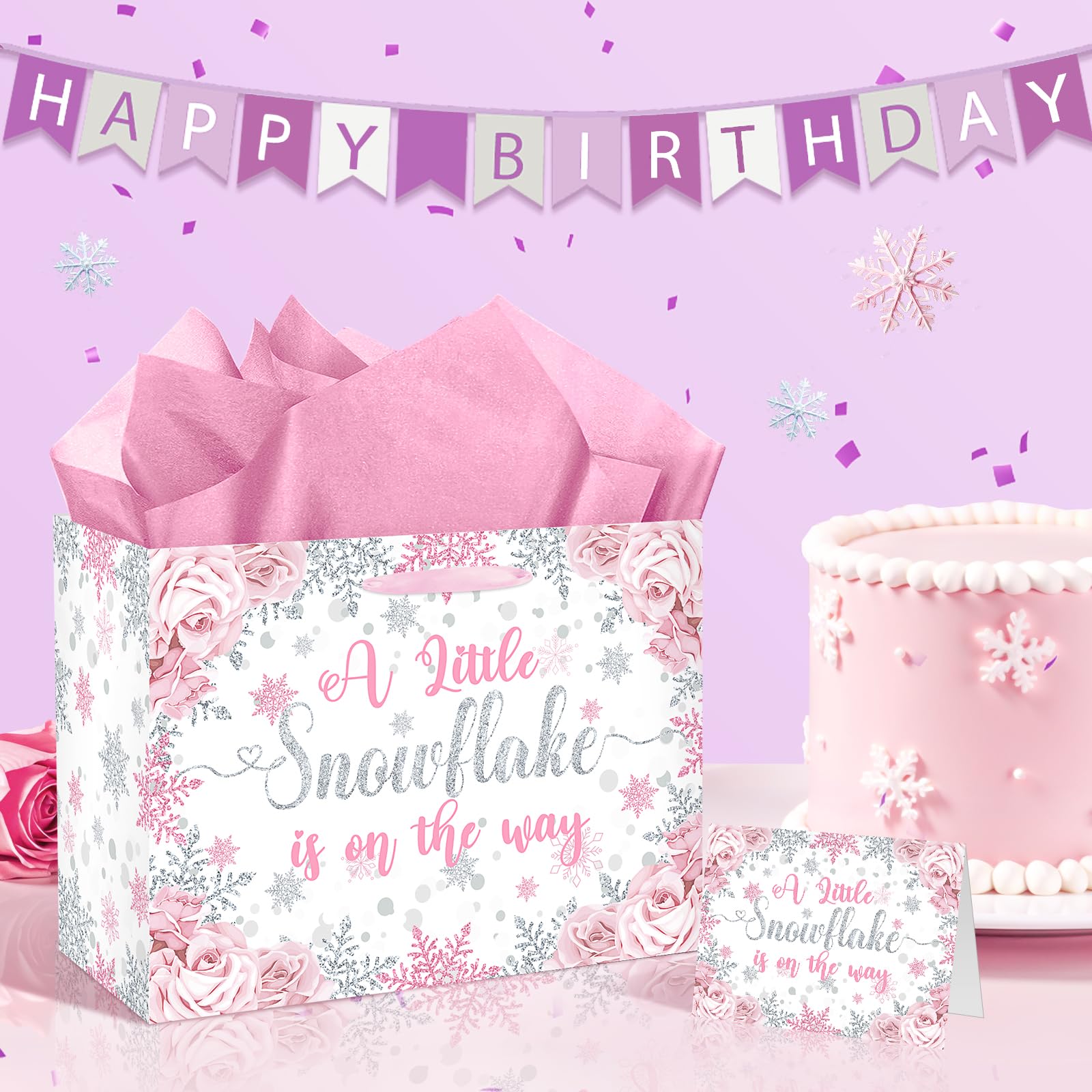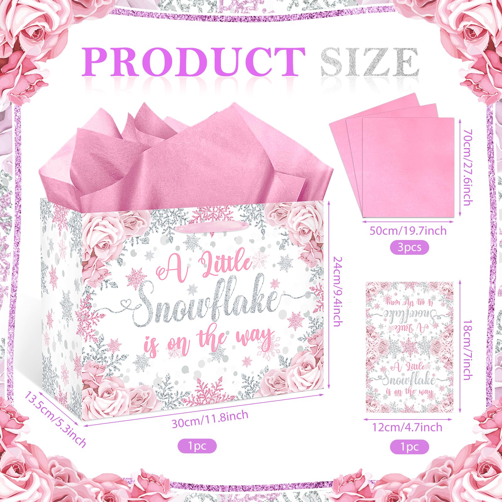 Package List: You will get a winter snowflake frozen baby shower gift bag for girls, a "A Little Snowflake is On The Way" greeting card, and 3 pieces of pink baby shower birthday wrapping tissue paper.