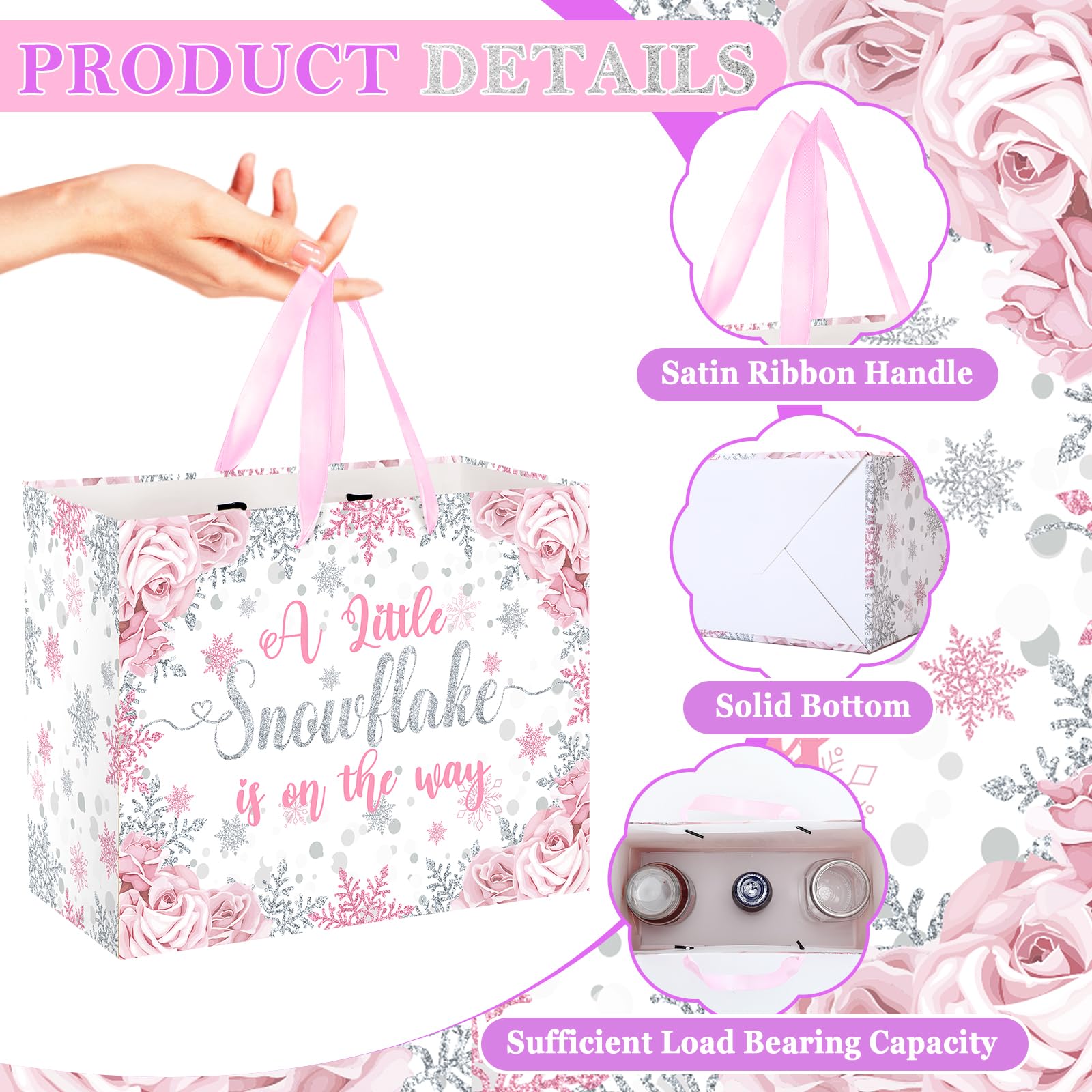 Winter Birthday Baby Shower Gift Bag: The large winter wonderland birthday baby shower gift paper bag for kids comes in pink and silver, which features snowflake and floral design and "A Little Snowflake is On The Way" signs.