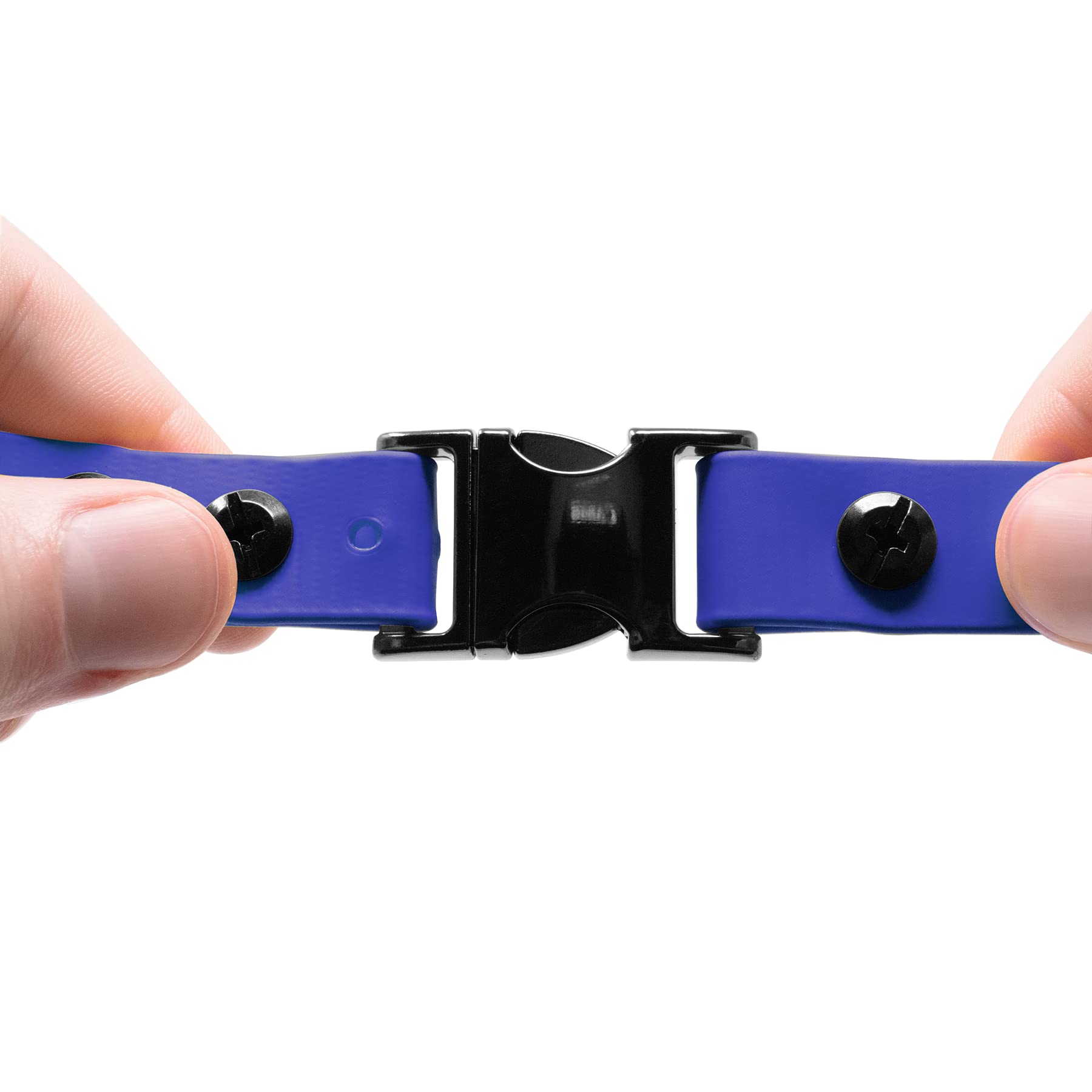 Let your dog play freely outdoors and in the water, rain, or snow confidently with the Educator Quick Snap Bungee Dog Collar. The Snap buckle collar using Biothane material with a bungee loop combines popular features designed for quick on and off, comfort and contact reliability. Biothane is waterproof and odorproof keeping you and your dog happy and comfortable. High quality 33-inch long collar is for small to medium size dogs 10 pounds and up and fits neck sizes between 5 inches and 22-1/2 inches and may be trimmed to desired length for a custom fit. For extra small dogs 5 pounds and up with neck sizes between 5 and 15 inches we recommend the 3/4-inch wide by 22 inches long Mini Double Bungee collar. The heavy-duty metal snap buckle closes securely and the strong steel D ring may be used to attach an ID tag and leash. The collar is an ideal replacement to use with the Educator E-Collar with Remote Training system. The 3/4-inch wide collar is compatible with Educator ET-300 Mini training collar and training series 300, 400, 500 and 900 as well as Bark-less Pro model 504. All other series use 1-inch wide collar. Your complete satisfaction is our only concern. For support about your collar or fit, live US phone support is available Monday through Friday between 8 am and 5 pm Eastern. Made in the USA.