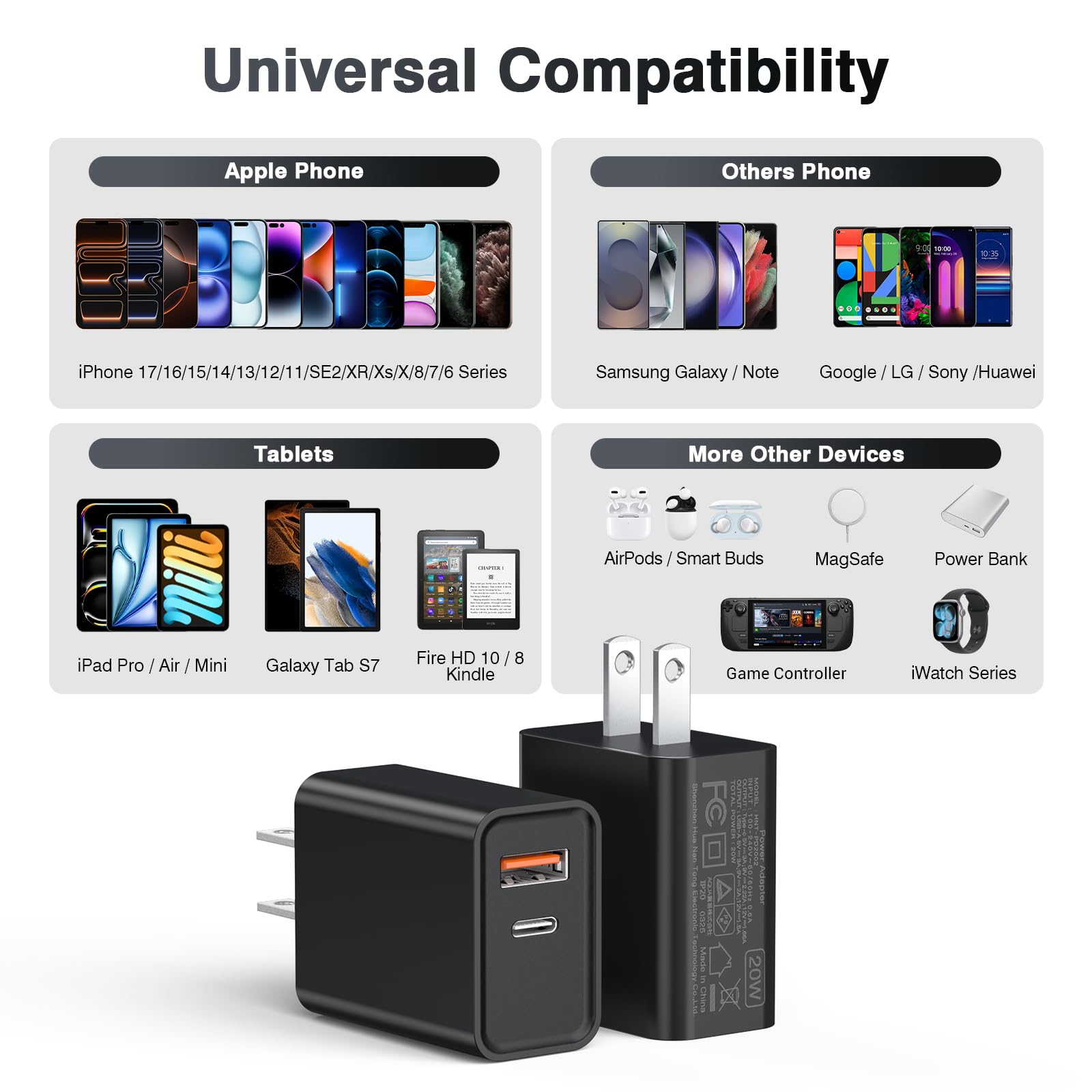 Universal Compatation: Designed for iPhone 11/12/13/14/15/16/17/Pro/Pro Max/Plus/iPhone 8 and later. The USB charging adapter is compatible for iPhone, iPad, iPod, smartphone, MP3 / MP4 players, play equipment, GPS devices, PC tablet, Google Nexus Tablet, Samsung Galaxy Tab and other digital devices compatible