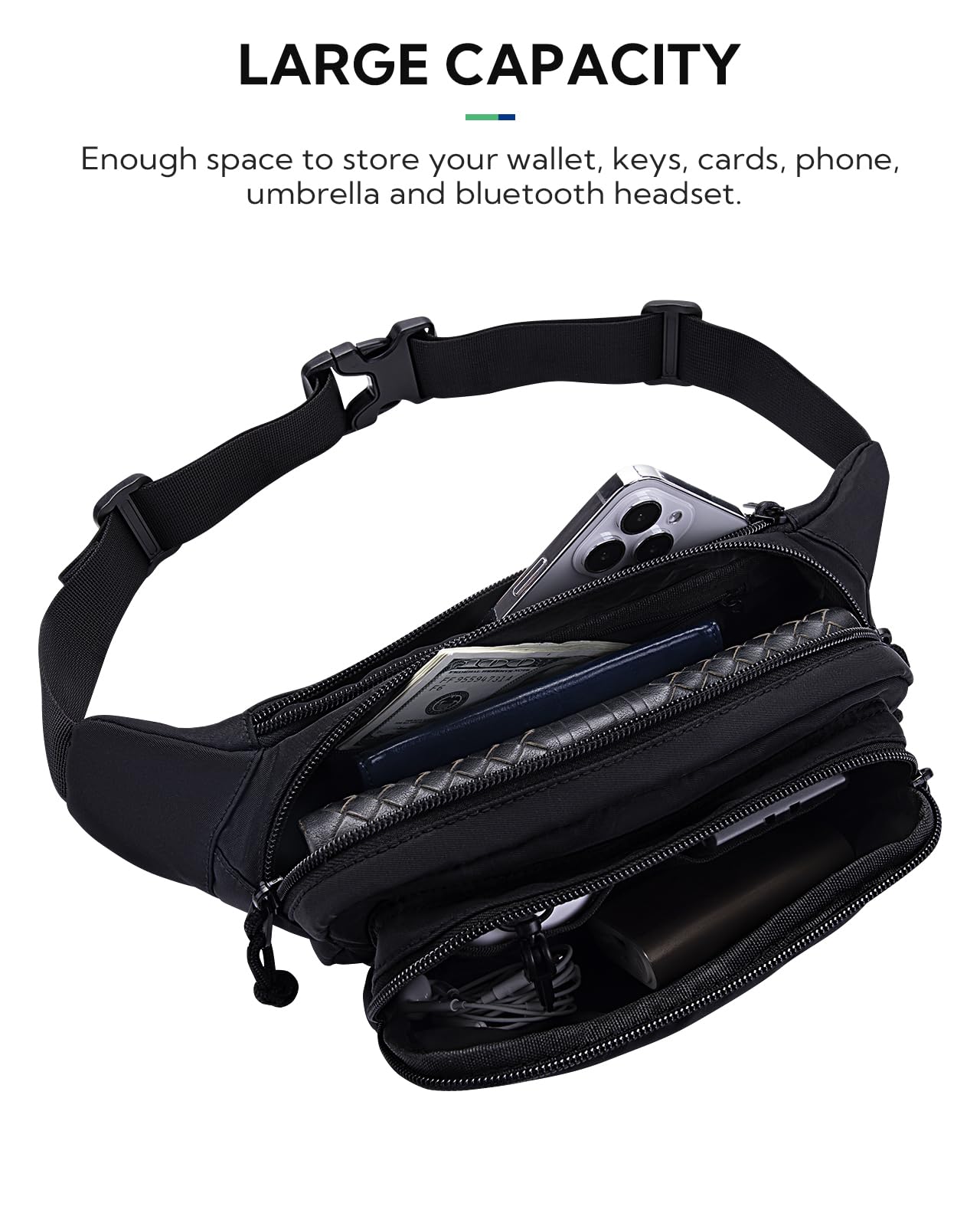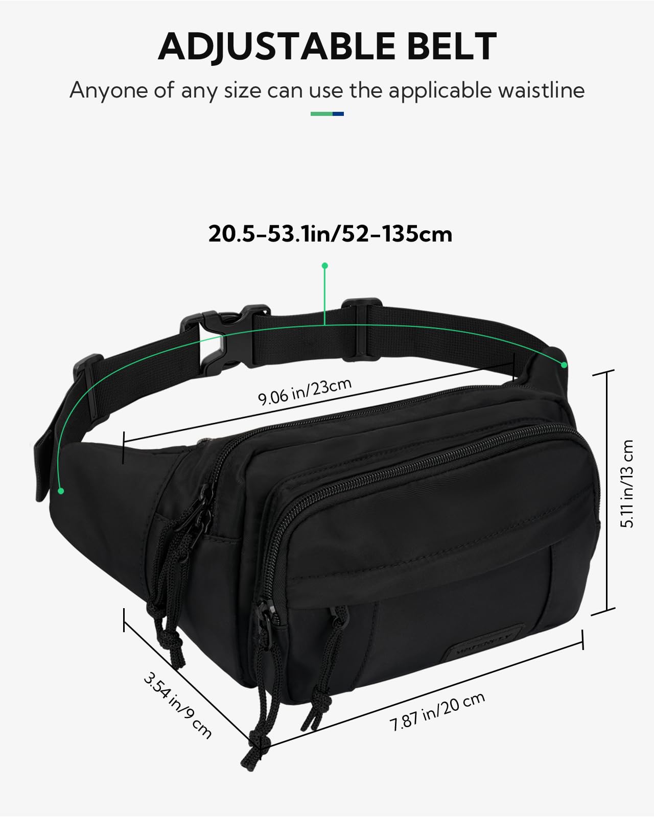 Roomy & Adjustable Strap: The size of large waist pack is 9.06 x 5.11 x 3.54 in, it can hold your mobile phone, cards, cash, passport and umbrella, meets all your storage need. A flexible strap ranges from 31.49-49.21 in, fit your waist even better