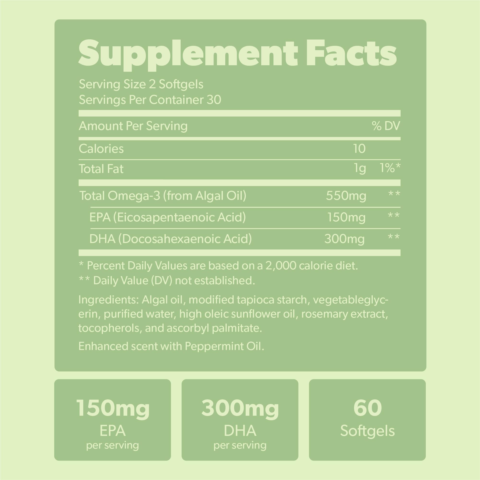 BIOAVAILABLE DHA AND EPA - Our Algae Omega 3 contains a total of 550mg of Omega-3s, 300mg DHA, and 150mg EPA per serving. Other plant oils, such as flaxseed oil, don’t contain DHA or EPA. DHA And EPA are naturally occurring in algae oil.