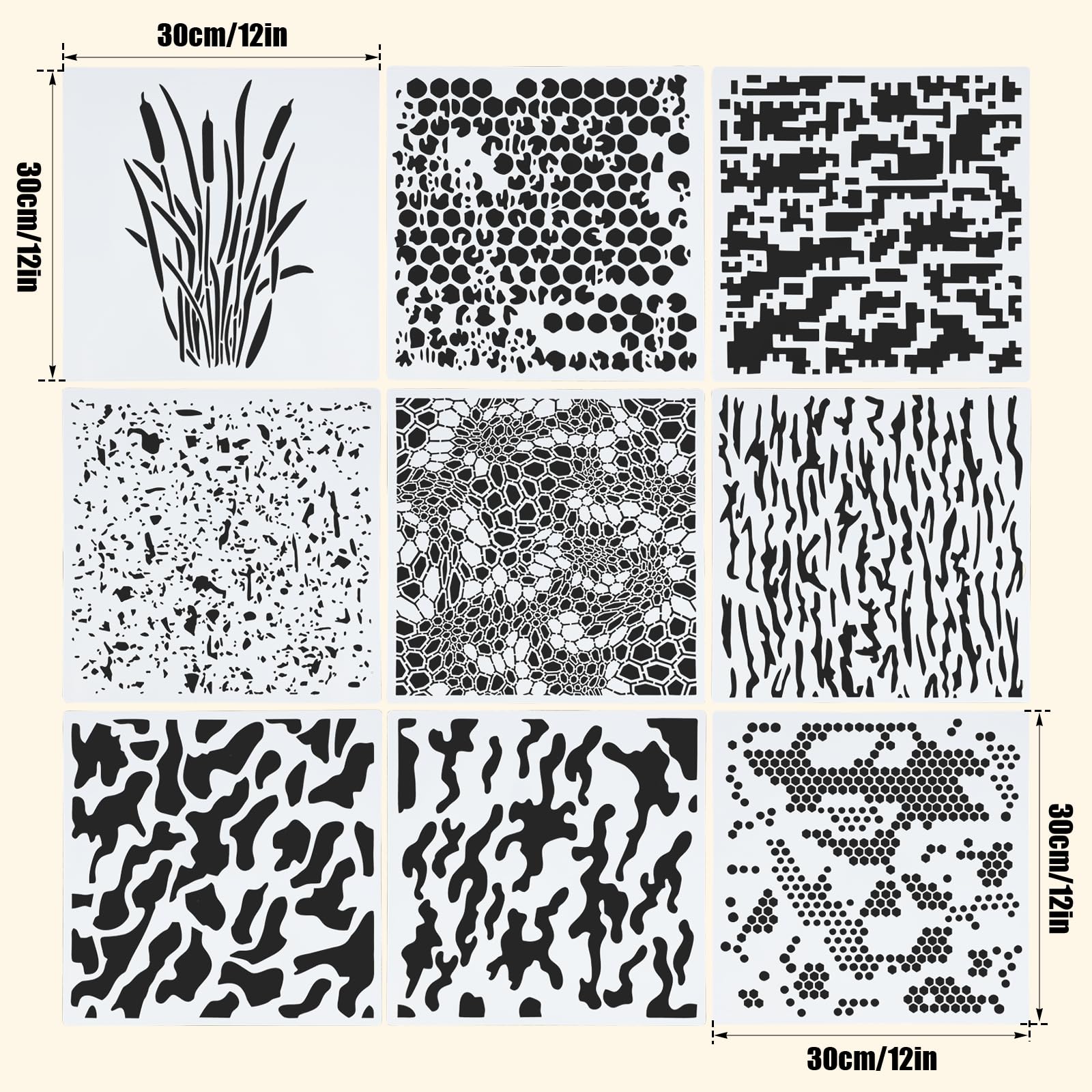 Package Content: Package includes 9 pieces of camo stencils for spray paint, they are designed with different patterns, each stencil 30x30cm/12x12in; sufficient quantity diverse styles will meet your various spray paint needs.