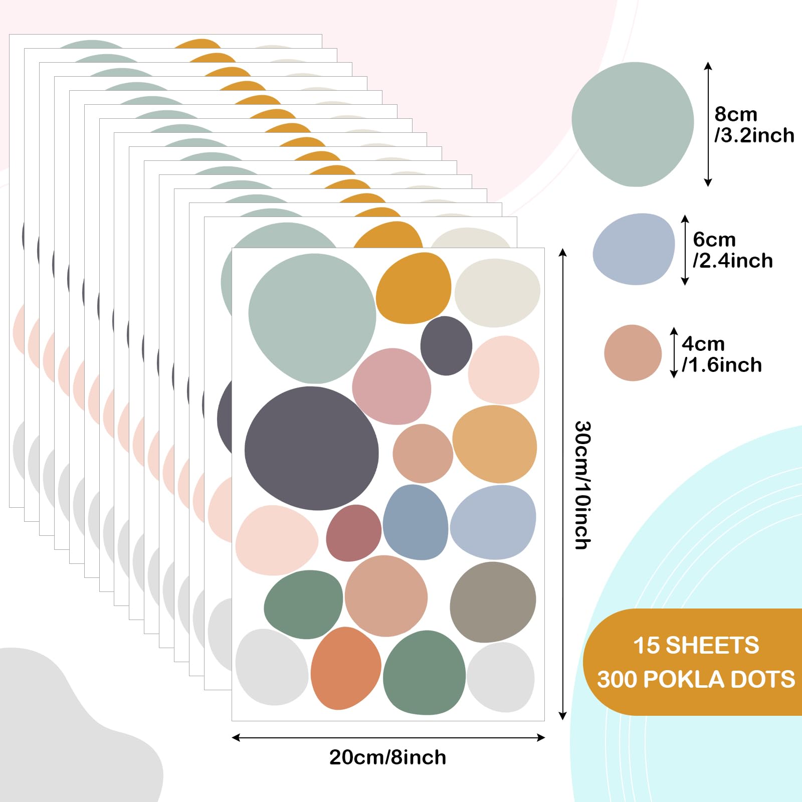 Abundant Set for DIY Fun: you will get 15 sheets of irregular polka dots classroom wall decals, 20 pcs on each sheet, 300 pcs in all, abundant to meet your various DIY demands; With 3 sizes, respectively about 3.15 inches/ 8 cm, 2.36 inches/ 6 cm, 1.57 inches/ 4 cm, they can be arranged and decorated according to your personal preferences, offering endless combinations for diverse decorative effects