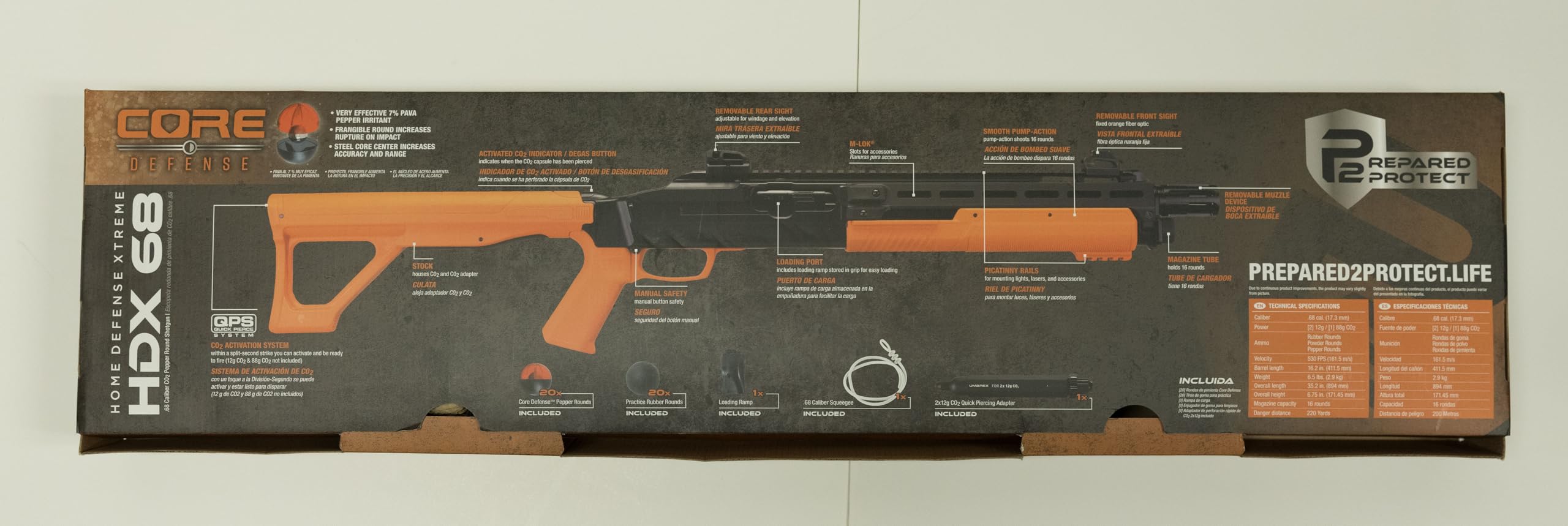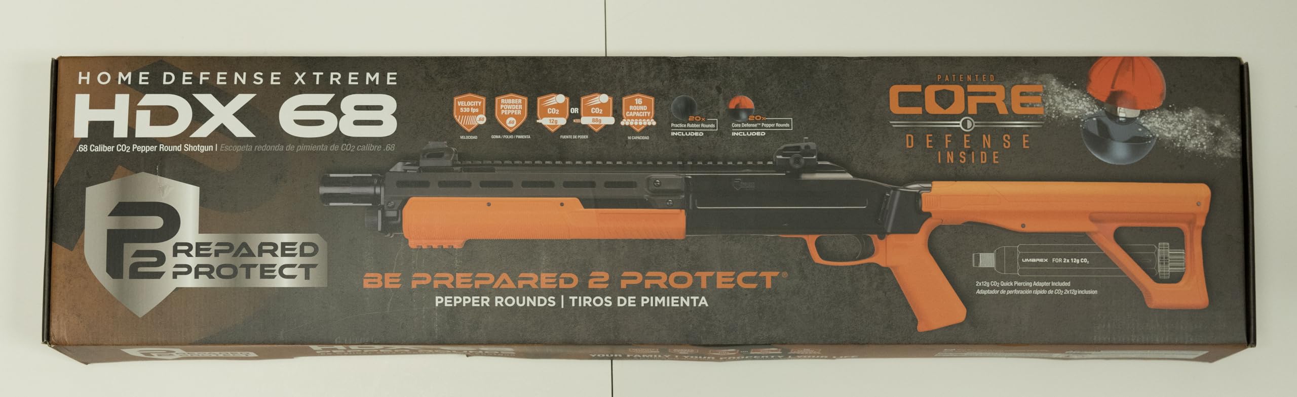 Shoots .68 caliber pepper rounds, rubber balls, or powder balls at up to 300 fps; Comes in a kit that includes 20 pepper rounds, 20 rubber balls and a Quick Piercing Adapter