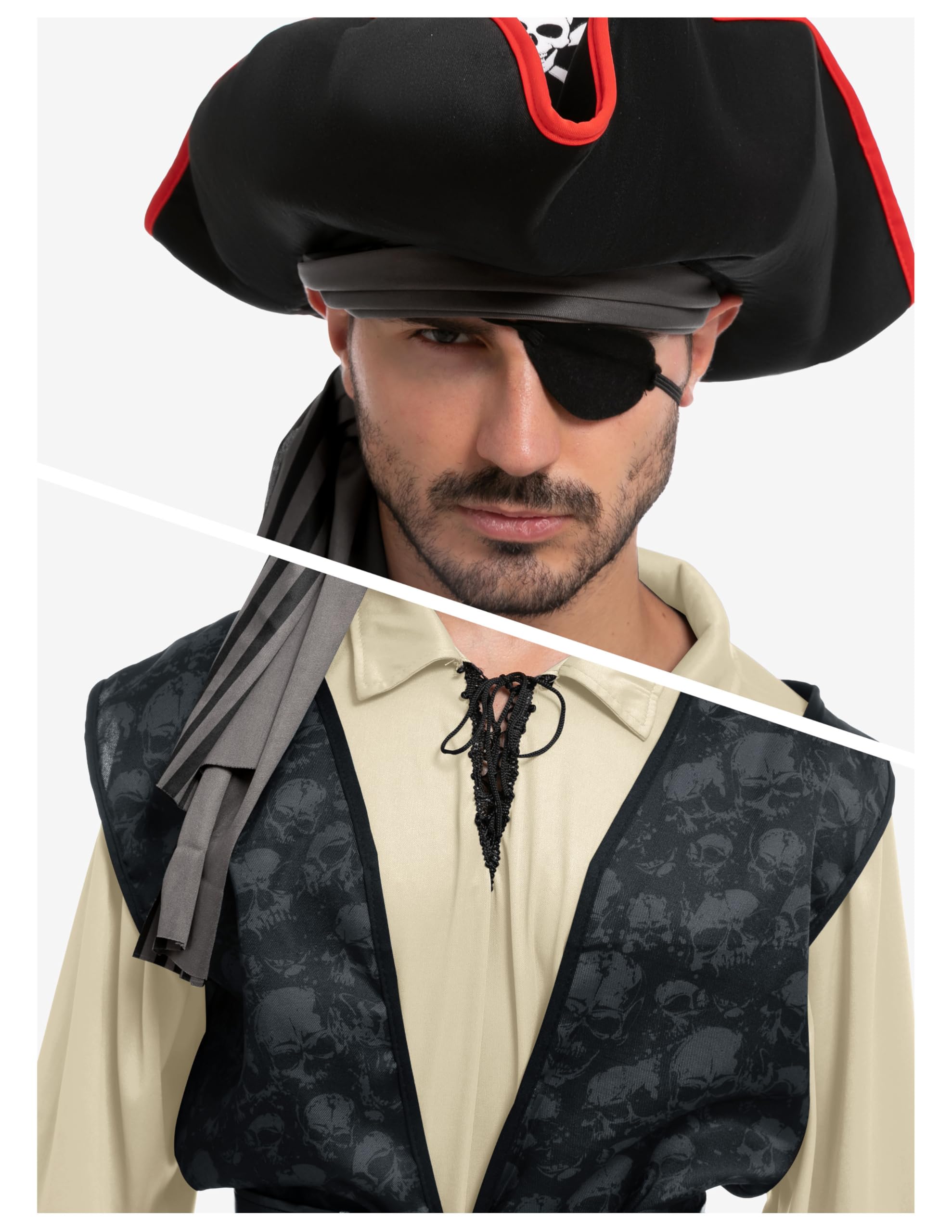 Set Includes: This pirate costume man Includes 1 pirate hat, 1 belt, 1 bandana, 1 eye patch, 1 belt sash, 1 beige pirate shirt, 1 pirate vest and 1 pair of pants