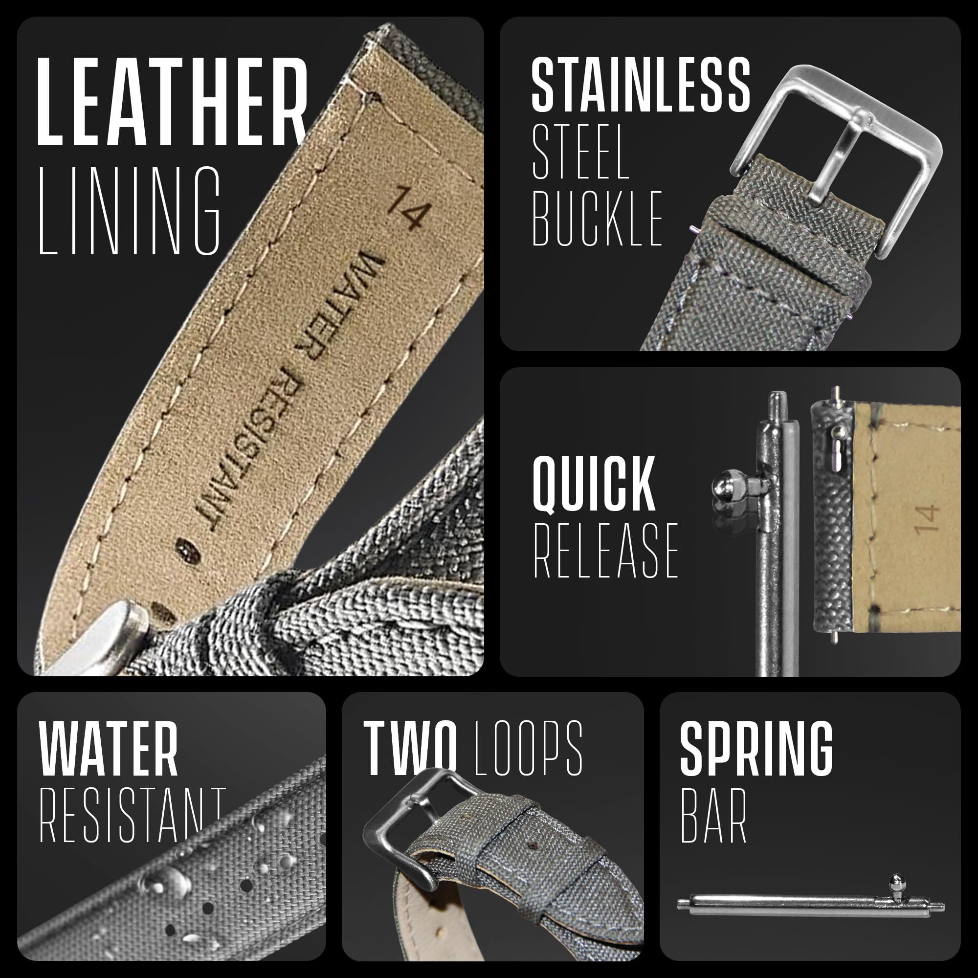 Description Immerse yourself in innovation with our cordura fabric watch bands, thoughtfully designed to seamlessly enhance a diverse range of watches and brands, ensuring an impeccable match for your timepiece. Experience the pinnacle of durability with our watch bands for men, meticulously crafted from top-tier fabric to deliver unparalleled resilience. Featuring a premium-grade fabric with exceptional tensile strength, these men's watch bands stand resilient in challenging environments, maintaining their elegance without deformation or cracking for enduring sophistication. Embrace user-friendly convenience with our 22mm watch band, it comes with quick release spring bars. The intuitive design guarantees a seamless experience, while the secure buckle closure on our cordura watch strap assures a snug and comfortable fit on your wrist. Enjoy universal compatibility as our men's watch bands effortlessly cater to both traditional watches and smart watch band models, including Galaxy Samsung watch bands. Elevate your watch-wearing journey by achieving a stylish wrist presence, complementing your overall aesthetic, and enhancing the entire experience by wearing our cool watches for men. Our wristbands offer an ideal fit, accommodating wrist sizes from 6" to 7 3/4'' men's band resist cracks, odors, and hardness even in the most rugged sports or activities, ensuring a perfect combination of comfort, flexibility, and durability. Material Top Quality Cordura fabric Water Resistant Leather Lining Compatibility Fits any 14mm, 16mm, 18mm, 20mm, 22mm watch wrist size 6” to 7 3/4'' Color Black, Olive, Grey, Khakhi, Blue, Red, Orange