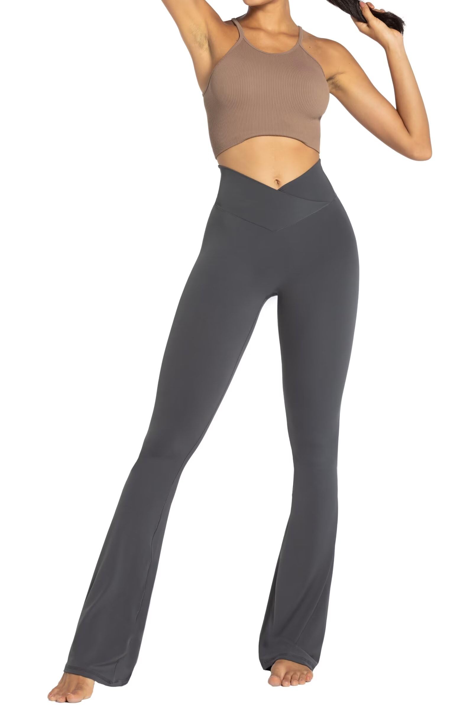 Crossover Flare Leggings with No Front Rise Seams: We took one of your favorite pieces and put every girl's favorite spin on them - NO FRONT SEAM! We know how much you all love our flared leggings and we wanted to make them even chicer