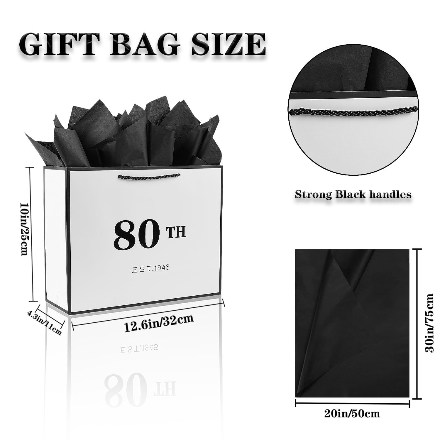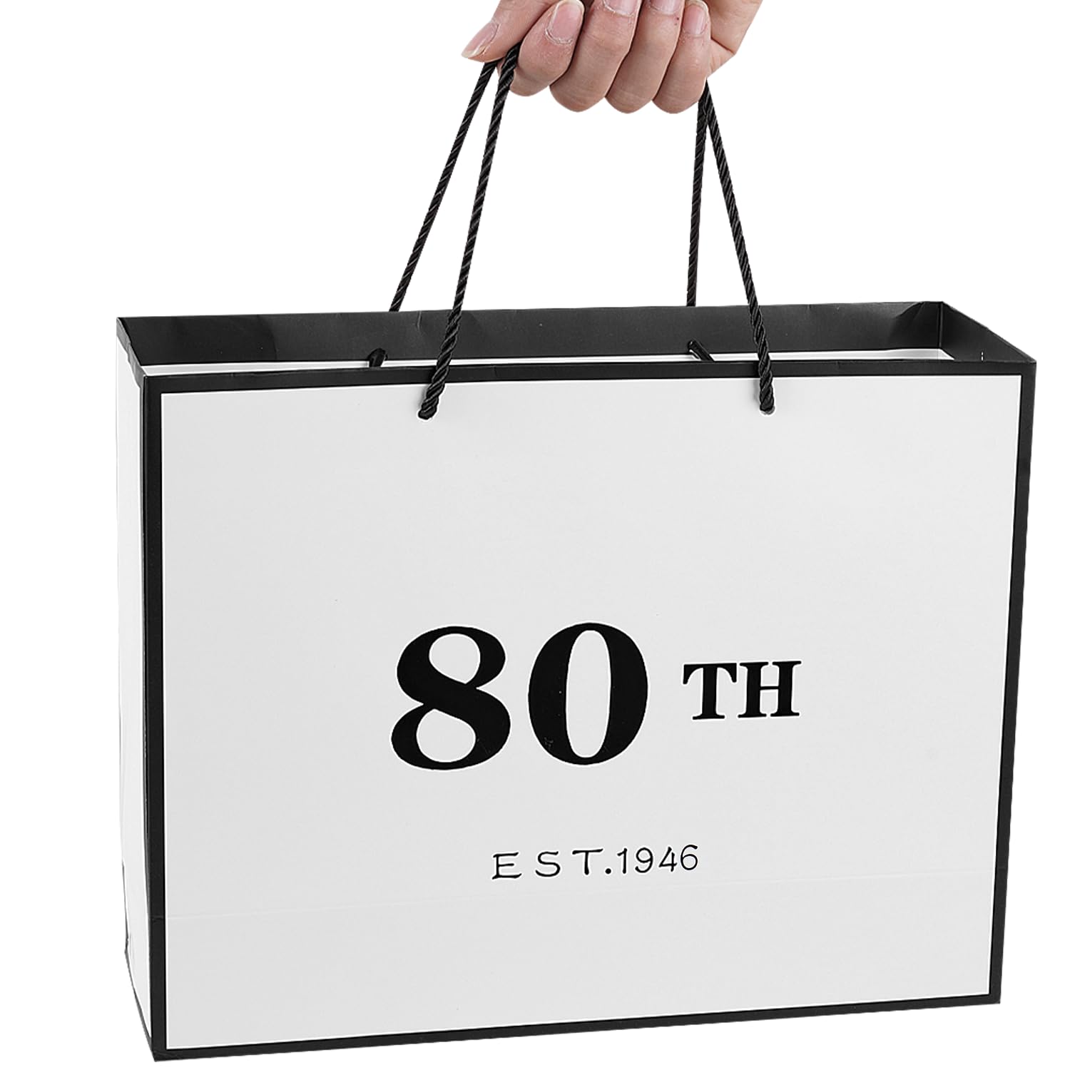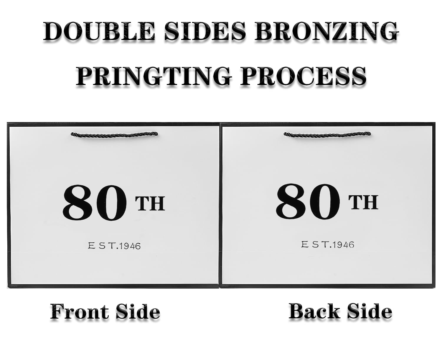 Metallic Printing Design: Our birthday gift bag features black metallic "80TH EST 1946" lettering which are prints on both sides of the bag.
