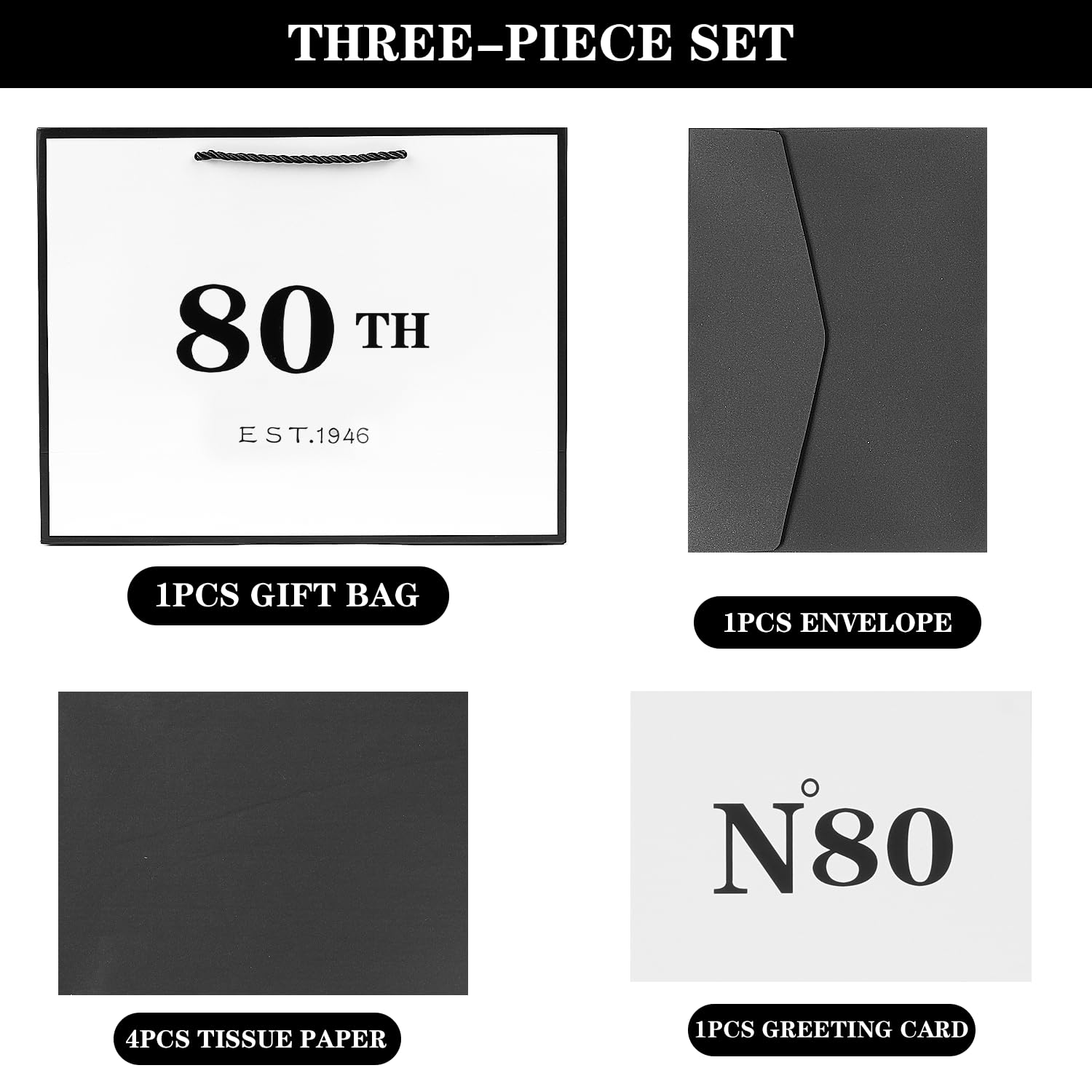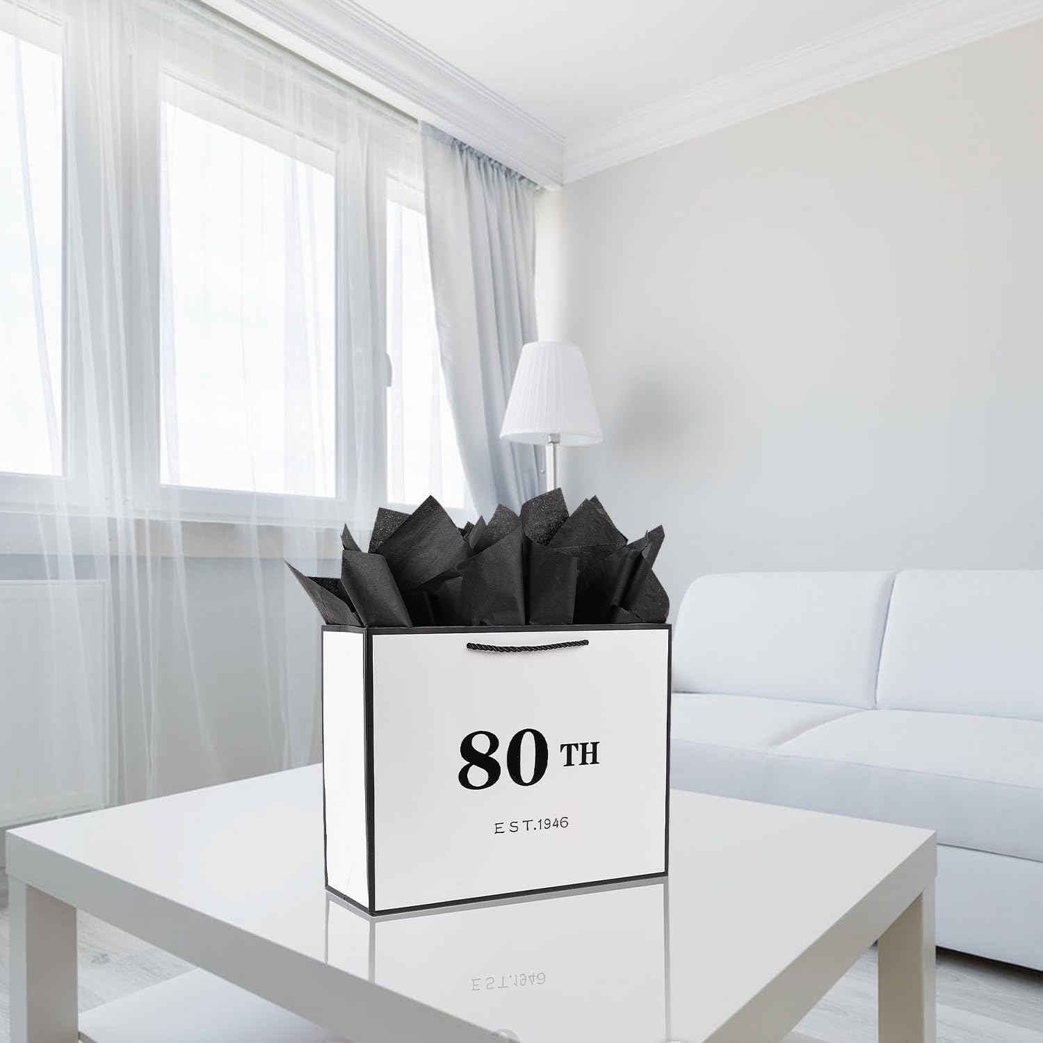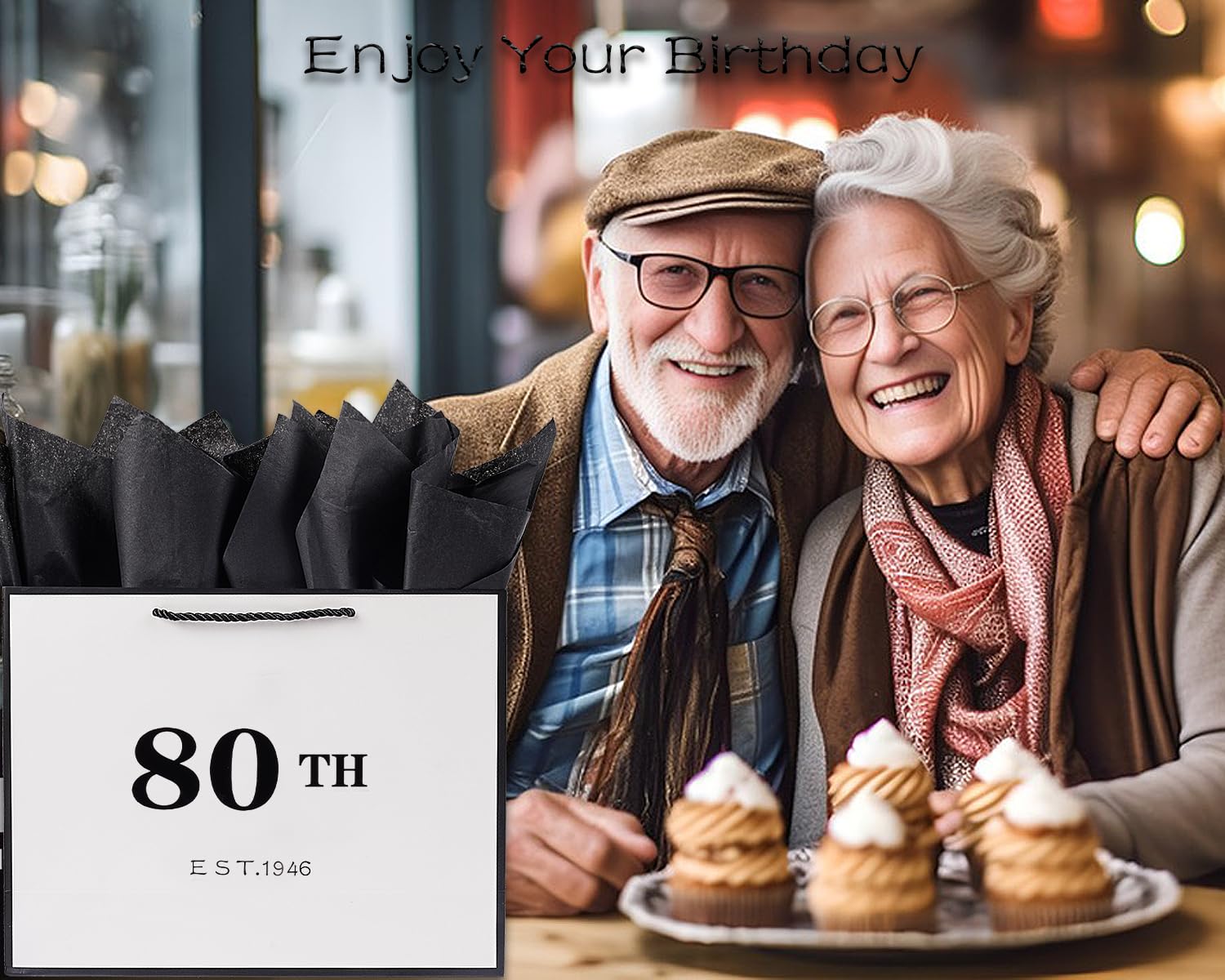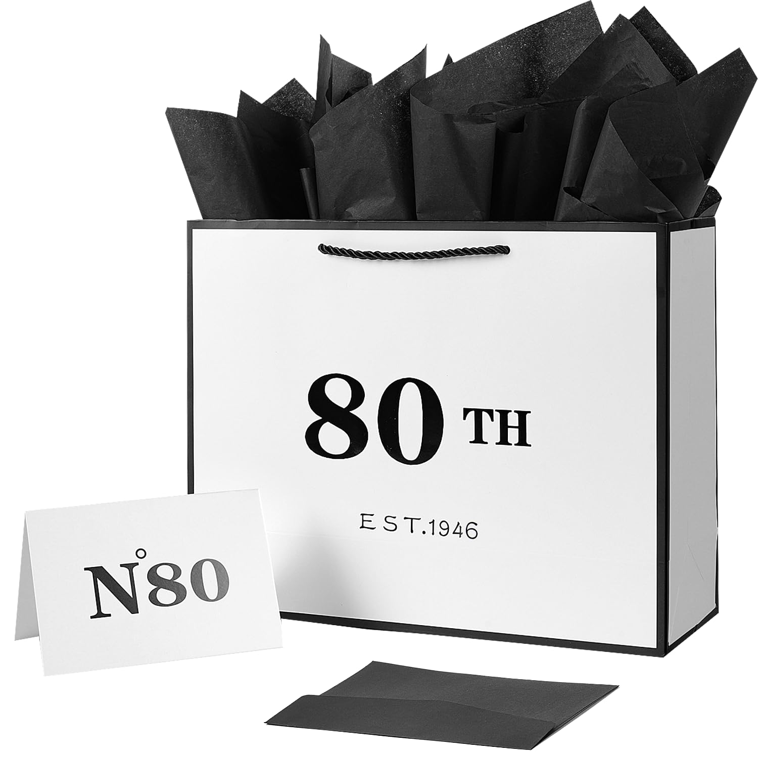 Metallic Printing Design: Our birthday gift bag features black metallic "80TH EST 1946" lettering which are prints on both sides of the bag.