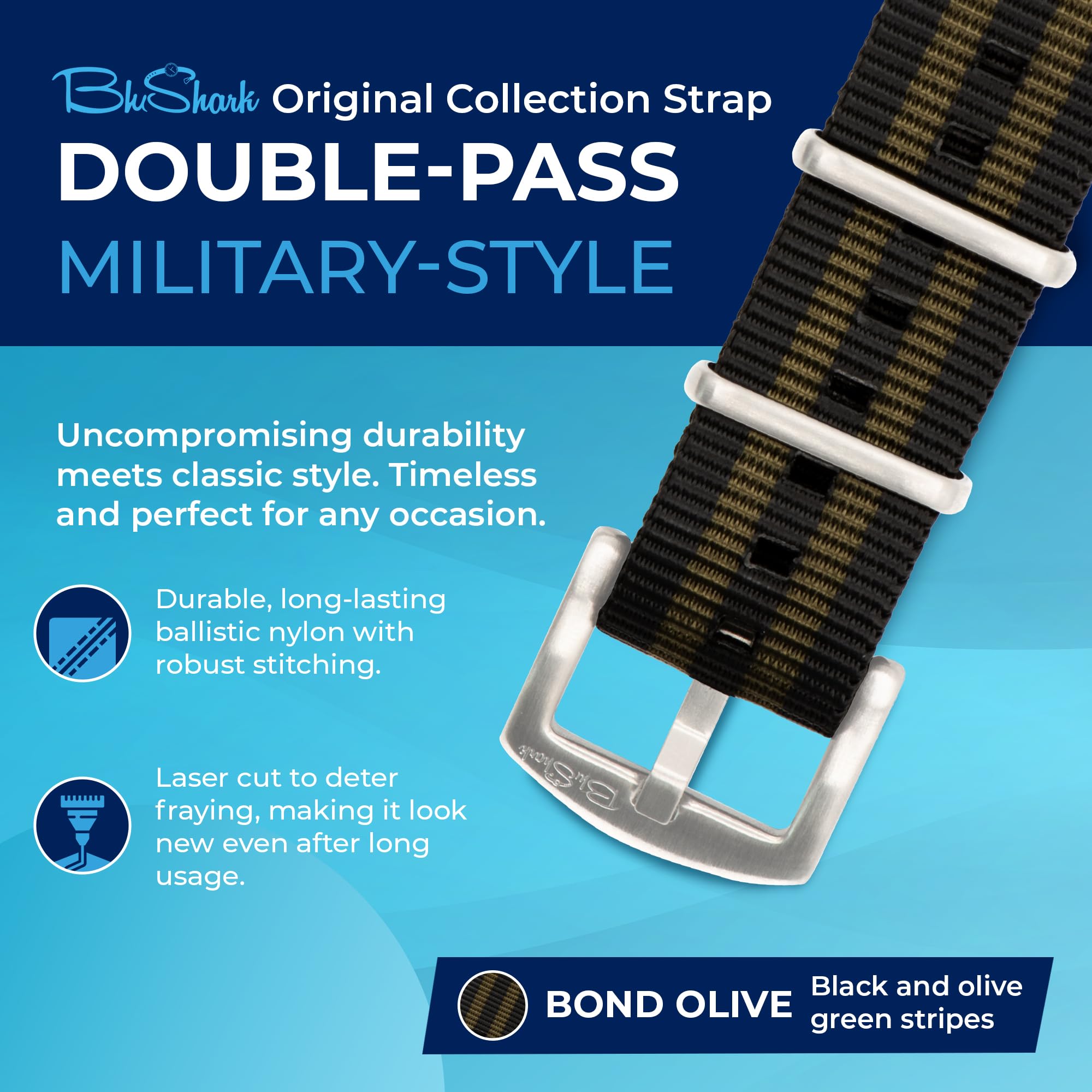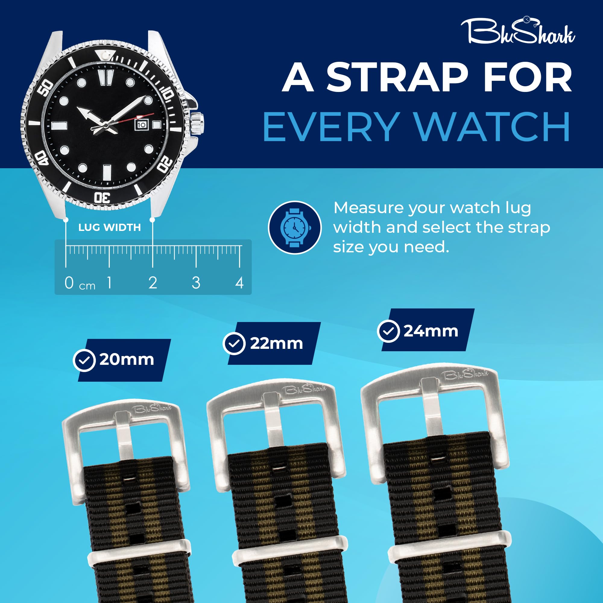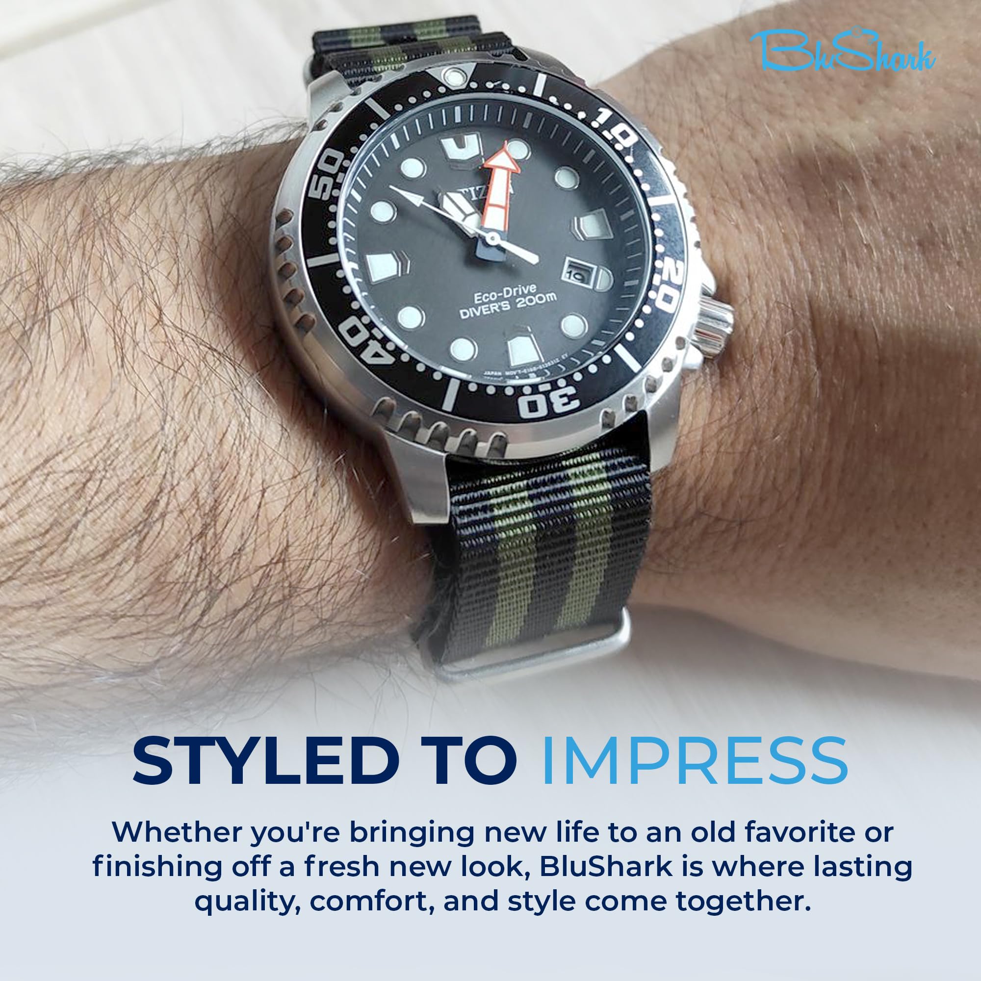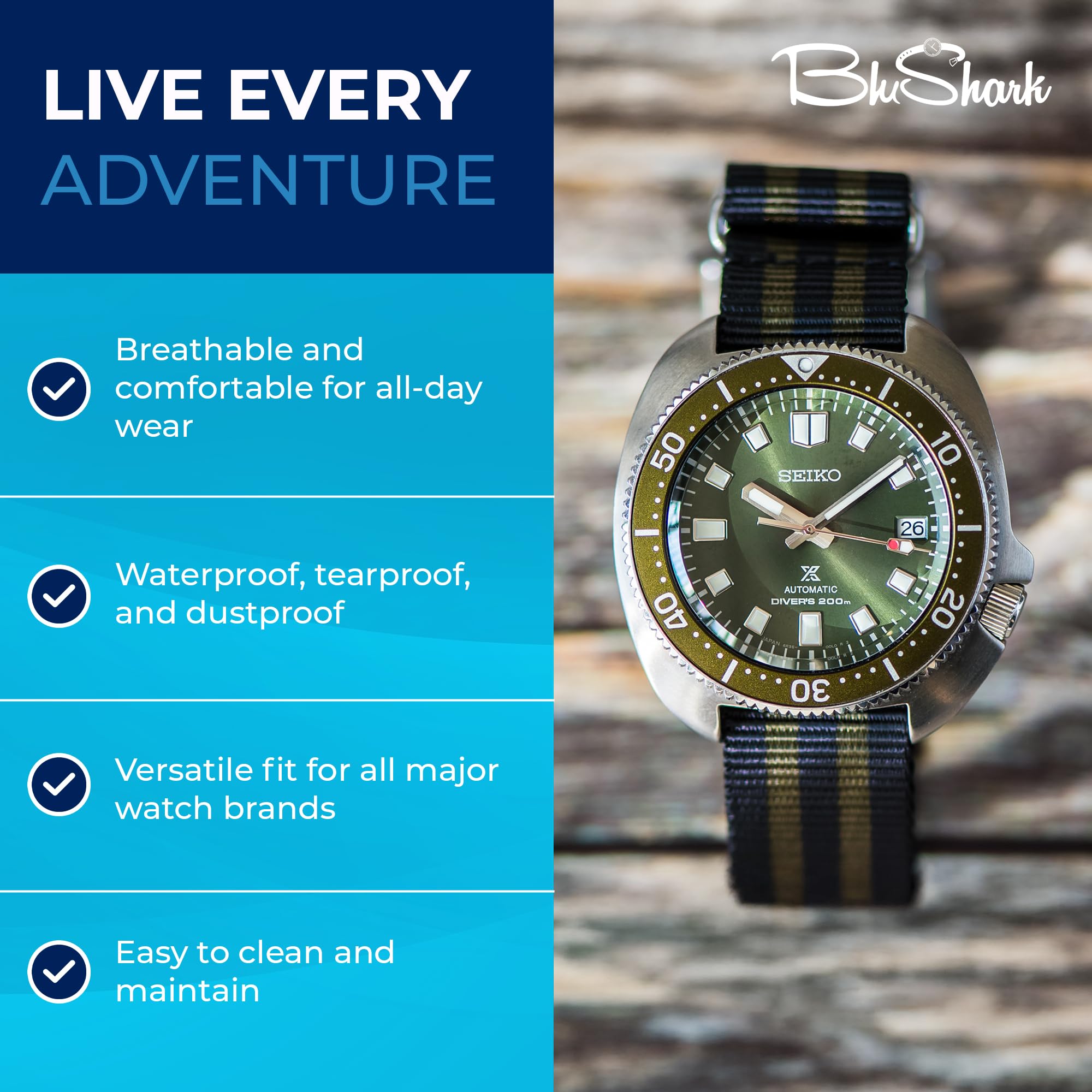Transform Your Timepiece: Take your watch to another level of style & craftsmanship with the Original Nylon Watch Strap by BluShark Straps. This double-pass military-style nylon strap is built to withstand daily wear while providing a timeless aesthetic.