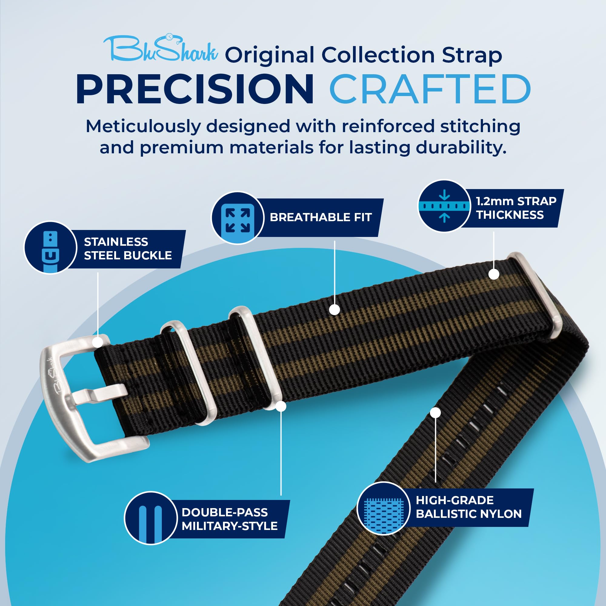 Durable Nylon Watch Bands: This 1.2mm thick high-grade ballistic nylon strap with reinforced stitching has heat-sealed holes & edges to resist fraying. It has fixed rounded keepers & a brushed stainless-steel wide buckle with the BluShark logo.